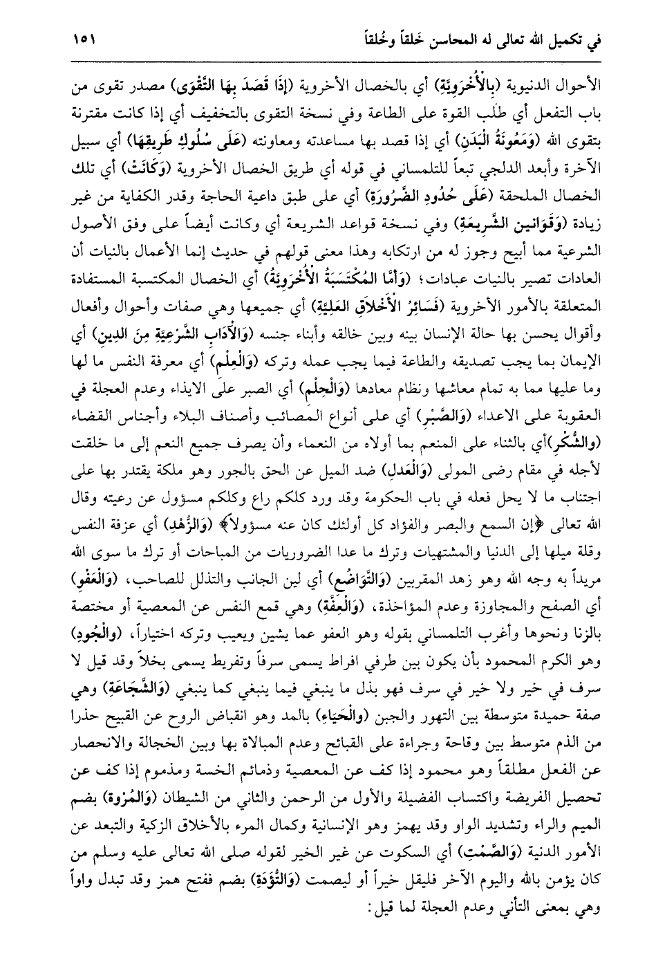الأحوال الدنيوية (بالأخرويّة) أي بالخصال الأخروية (إذا قصد بها التّقوى) مصدر تقوى من باب التفعل أي طلب القوة على الطاعة وفي نسخة التقوى بالتخفيف أي إذا كانت مقترنة بتقوى الله (ومعونة البدن) أي إذا قصد بها مساعدته ومعاونته (على سلوك طريقها) أي سبيل الآخرة وأبعد الدلجي تبعا للتلمساني في قوله أي طريق الخصال الأخروية (وكانت) أي تلك الخصال الملحقة (على حدود الضّرورة) أي على طبق داعية الحاجة وقدر الكفاية من غير زيادة (وقوانين الشّريعة) وفي نسخة قواعد الشريعة أي وكانت أيضا على وفق الأصول الشرعية مما أبيح وجوز له من ارتكابه وهذا معنى قولهم في حديث إنما الأعمال بالنيات أن العادات تصير بالنيات عبادات؛ (وأمّا المكتسبة الأخرويّة) أي الخصال المكتسبة المستفادة المتعلقة بالأمور الأخروية (فسائر الأخلاق العليّة) أي جميعها وهي صفات وأحوال وأفعال وأقوال يحسن بها حالة الإنسان بينه وبين خالقه وأبناء جنسه (والآداب الشّرعية من الدين) أي الإيمان بما يجب تصديقه والطاعة فيما يجب عمله وتركه (والعلم) أي معرفة النفس ما لها وما عليها مما به تمام معاشها ونظام معادها (والحلم) أي الصبر على الايذاء وعدم العجلة في العقوبة على الاعداء (والصّبر) أي على أنواع المصائب وأصناف البلاء وأجناس القضاء (والشّكر) أي بالثناء على المنعم بما أولاه من النعماء وأن يصرف جميع النعم إلى ما خلقت لأجله في مقام رضى المولى (والعدل) ضد الميل عن الحق بالجور وهو ملكة يقتدر بها على اجتناب ما لا يحل فعله في باب الحكومة وقد ورد كلكم راع وكلكم مسؤول عن رعيته وقال الله تعالى إِنَّ السَّمْعَ وَالْبَصَرَ وَالْفُؤادَ كُلُّ أُولئِكَ كانَ عَنْهُ مَسْؤُلًا (والزّهد) أي عزفة النفس وقلة ميلها إلى الدنيا والمشتهيات وترك ما عدا الضروريات من المباحات أو ترك ما سوى الله مريدا به وجه الله وهو زهد المقربين (والتّواضع) أي لين الجانب والتذلل للصاحب، (والعفو) أي الصفح والمجاوزة وعدم المؤاخذة، (والعفّة) وهي قمع النفس عن المعصية أو مختصة بالزنا ونحوها وأغرب التلمساني بقوله وهو العفو عما يشين ويعيب وتركه اختيارا، (والجود) وهو الكرم المحمود بأن يكون بين طرفي افراط يسمى سرفا وتفريط يسمى بخلا وقد قيل لا سرف في خير ولا خير في سرف فهو بذل ما ينبغي فيما ينبغي كما ينبغي (والشّجاعة) وهي صفة حميدة متوسطة بين التهور والجبن (والحياء) بالمد وهو انقباض الروح عن القبيح حذرا من الذم متوسط بين وقاحة وجراءة على القبائح وعدم المبالاة بها وبين الخجالة والانحصار عن الفعل مطلقا وهو محمود إذا كف عن المعصية وذمائم الخسة ومذموم إذا كف عن تحصيل الفريضة واكتساب الفضيلة والأول من الرحمن والثاني من الشيطان (والمروة) بضم الميم والراء وتشديد الواو وقد يهمز وهو الإنسانية وكمال المرء بالأخلاق الزكية والتبعد عن الأمور الدنية (والصّمت) أي السكوت عن غير الخير لقوله صلى الله تعالى عليه وسلم من كان يؤمن بالله واليوم الآخر فليقل خيرا أو ليصمت (والتّؤدة) بضم ففتح همز وقد تبدل واوا وهي بمعنى التأني وعدم العجلة لما قيل: