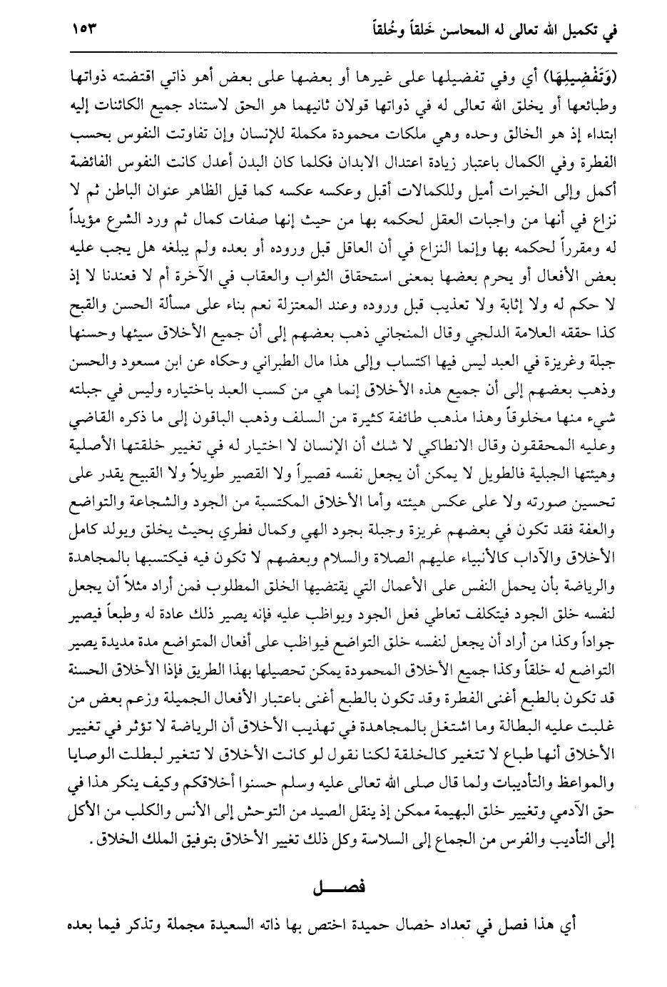 (وتفضيلها) أي وفي تفضيلها على غيرها أو بعضها على بعض أهو ذاتي اقتضته ذواتها وطبائعها أو يخلق الله تعالى له في ذواتها قولان ثانيهما هو الحق لاستناد جميع الكائنات إليه ابتداء إذ هو الخالق وحده وهي ملكات محمودة مكملة للإنسان وإن تفاوتت النفوس بحسب الفطرة وفي الكمال باعتبار زيادة اعتدال الابدان فكلما كان البدن أعدل كانت النفوس الفائضة أكمل وإلى الخيرات أميل وللكمالات أقبل وعكسه عكسه كما قيل الظاهر عنوان الباطن ثم لا نزاع في أنها من واجبات العقل لحكمه بها من حيث إنها صفات كمال ثم ورد الشرع مؤيدا له ومقررا لحكمه بها وإنما النزاع في أن العاقل قبل وروده أو بعده ولم يبلغه هل يجب عليه بعض الأفعال أو يحرم بعضها بمعنى استحقاق الثواب والعقاب في الآخرة أم لا فعندنا لا إذ لا حكم له ولا إثابة ولا تعذيب قبل وروده وعند المعتزلة نعم بناء على مسألة الحسن والقبح كذا حققه العلامة الدلجي وقال المنجاني ذهب بعضهم إلى أن جميع الأخلاق سيئها وحسنها جبلة وغريزة في العبد ليس فيها اكتساب وإلى هذا مال الطبراني وحكاه عن ابن مسعود والحسن وذهب بعضهم إلى أن جميع هذه الأخلاق إنما هي من كسب العبد باختياره وليس في جبلته شيء منها مخلوقا وهذا مذهب طائفة كثيرة من السلف وذهب الباقون إلى ما ذكره القاضي وعليه المحققون وقال الانطاكي لا شك أن الإنسان لا اختيار له في تغيير خلقتها الأصلية وهيئتها الجبلية فالطويل لا يمكن أن يجعل نفسه قصيرا ولا القصير طويلا ولا القبيح يقدر على تحسين صورته ولا على عكس هيئته وأما الأخلاق المكتسبة من الجود والشجاعة والتواضع والعفة فقد تكون في بعضهم غريزة وجبلة بجود الهي وكمال فطري بحيث يخلق ويولد كامل الأخلاق والآداب كالأنبياء عليهم الصلاة والسلام وبعضهم لا تكون فيه فيكتسبها بالمجاهدة والرياضة بأن يحمل النفس على الأعمال التي يقتضيها الخلق المطلوب فمن أراد مثلا أن يجعل لنفسه خلق الجود فيتكلف تعاطي فعل الجود ويواظب عليه فإنه يصير ذلك عادة له وطبعا فيصير جوادا وكذا من أراد أن يجعل لنفسه خلق التواضع فيواظب على أفعال المتواضع مدة مديدة يصير التواضع له خلقا وكذا جميع الأخلاق المحمودة يمكن تحصيلها بهذا الطريق فإذا الأخلاق الحسنة قد تكون بالطبع أغنى الفطرة وقد تكون بالطبع أغنى باعتبار الأفعال الجميلة وزعم بعض من غلبت عليه البطالة وما اشتغل بالمجاهدة في تهذيب الأخلاق أن الرياضة لا تؤثر في تغيير الأخلاق أنها طباع لا تتغير كالخلقة لكنا نقول لو كانت الأخلاق لا تتغير لبطلت الوصايا والمواعظ والتأديبات ولما قال صلى الله تعالى عليه وسلم حسنوا أخلاقكم وكيف ينكر هذا في حق الآدمي وتغيير خلق البهيمة ممكن إذ ينقل الصيد من التوحش إلى الأنس والكلب من الأكل إلى التأديب والفرس من الجماع إلى السلاسة وكل ذلك تغيير الأخلاق بتوفيق الملك الخلاق.