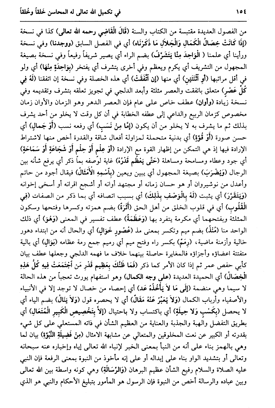 من الفصول العديدة مقتبسة من الكتاب والسنة (قال القاضي رحمه الله تعالى) كذا في نسخة (إذا كانت خصال الكمال والجلال ما ذكرناه) أي في الفصل السابق (ووجدنا) وفي نسخة ورأينا أي علمنا (الواحد منّا يتشرّف) بضم الراء أي يصير شريفا رفيعا وفي نسخة بصيغة المجهول من التشريف أي يكرم ويعظم وفي أخرى يتشرف أي يفتخر (بواحدة منها) أي ولو في أقل مراتبها (أو اثنتين) أي منها (إن اتّفقت) أي هذه الخصلة وفي نسخة إن اتفقنا (له في كلّ عصر) متعلق باتفقت والعصر مثلثة وأبعد الدلجي في تجويز تعلقه بتشرف وتقديمه وفي نسخة زيادة (وأوان) عطف خاص على عام فإن العصر الدهر وهو الزمان والأوان زمان مخصوص كزمان الربيع والداعي إلى عطفه الخطابة في أن كل وقت لا يخلو من أحد يشرف بذلك ثم ما يشرف به لا يخلو من أن يكون (إمّا من نسب) أي رفعه نسب (أو جمال) أي حسن صورة (أو قوّة) أي بدنية متحملة لمزاولة أفعال شاقة والقدرة أخص منها لاشتراط الإرادة فيها إذ هي التمكن من إظهار القوة مع الإرادة (أَوْ عِلْمٍ أَوْ حِلْمٍ أَوْ شَجَاعَةٍ أَوْ سماحة) أي جود وعطاء ومسامحة ومساهلة (حتّى يعظم قدره) غاية لوصفه بما ذكر أي يرفع شأنه بين الرجال (ويضرب) بصيغة المجهول أي يبين ويعين (باسمه الأمثال) فيقال أجود من حاتم وأعدل من نوشيروان أو هو حسان زمانه أو مجتهد أوانه أو أشجع اقرانه أو أسخى إخوانه (ويتقرّر) أي يثبت (له بالوصف بذلك) أي بسبب اتصافه أي بما ذكر من الصفات (في القلوب) أي في قلوب الخلق من أهل الحق (أثرة) بضم همزته وكسرها وفتحها وسكون المثلثة وبفتحهما أي مكرمة يتفرد بها (وعظمة) عطف تفسير في المعنى (وهو) أي ذلك الواحد منا (منذ) بضم ميم وتكسر بمعنى مذ (عصور خوال) أي والحال أنه من ابتداء دهور خالية وأزمنة ماضية، (رمم) بكسر راء وفتح ميم أي رميم جمع رمة عظامه (بوال) أي بالية متفتتة اعضاؤه وأجزاؤه فالمغايرة حاصلة بينهما خلاف ما فهمه الدلجي وجعلها عطف بيان كأبي حفص عمر ثم إذا كان الأمر كما ذكر (فَمَا ظَنُّكَ بِعَظِيمِ قَدْرِ مَنِ اجْتَمَعَتْ فِيهِ كلّ هذه الخصال) أي الحميدة العديدة (على وجه الكمال) وهو استفهام يورث تعجبا من هذه الحالة لا سيما وهي منضمة (إلى ما لا يأخذه عد) أي إحصاء من خصال لا توجد إلا في الأنبياء والأصفياء وأرباب الكمال (ولا يعبّر عنه مقال) أي لا يحصره قول (ولا ينال) بضم الياء أي لا يحصل (بكسب ولا حيلة) أي باكتساب ولا باحتيال (إلّا بتخصيص الكبير المتعال) أي بطريق التفضل والهبة والجذبة والعناية من العظيم الشأن في ذاته المستعلي على كل شيء بقدرته أو الكبير عن نعت المخلوقين والمتعالي عن مشابهة الامثال (من فضيلة النّبوّة) بيان لما وهي بالهمز بناء على أنه من النبأ بمعنى الخبر لإنباء الله تعالى إياه وإخباره عنه سبحانه وتعالى أو بتشديد الواو بناء على إبداله أو على إنه مأخوذ من النبوة بمعنى الرفعة فإن النبي عليه الصلاة والسلام رفيع الشأن عظيم البرهان (والرّسالة) وهي كونه واسطة بين الله تعالى وبين عباده والرسالة أخص من النبوة فإن الرسول هو المأمور بتبليغ الأحكام والنبي هو الذي