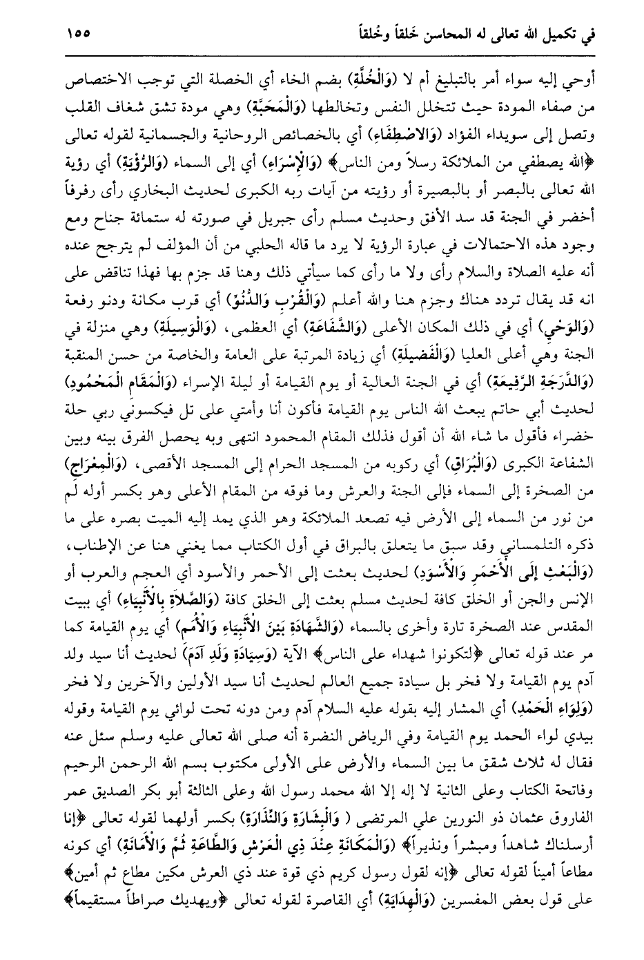 أوحي إليه سواء أمر بالتبليغ أم لا (والخلّة) بضم الخاء أي الخصلة التي توجب الاختصاص من صفاء المودة حيث تتخلل النفس وتخالطها (والمحبّة) وهي مودة تشق شغاف القلب وتصل إلى سويداء الفؤاد (والاصطفاء) أي بالخصائص الروحانية والجسمانية لقوله تعالى اللَّهُ يَصْطَفِي مِنَ الْمَلائِكَةِ رُسُلًا وَمِنَ النَّاسِ (والإسراء) أي إلى السماء (والرّؤية) أي رؤية الله تعالى بالبصر أو بالبصيرة أو رؤيته من آيات ربه الكبرى لحديث البخاري رأى رفرفا أخضر في الجنة قد سد الأفق وحديث مسلم رَأَى جِبْرِيلَ فِي صُورَتِهِ لَهُ سِتُّمِائَةِ جَنَاحٍ ومع وجود هذه الاحتمالات في عبارة الرؤية لا يرد ما قاله الحلبي من أن المؤلف لم يترجح عنده أنه عليه الصلاة والسلام رأى ولا ما رأى كما سيأتي ذلك وهنا قد جزم بها فهذا تناقض على انه قد يقال تردد هناك وجزم هنا والله أعلم (والقرب والدّنوّ) أي قرب مكانة ودنو رفعة (والوحي) أي في ذلك المكان الأعلى (والشّفاعة) أي العظمى، (والوسيلة) وهي منزلة في الجنة وهي أعلى العليا (والفضيلة) أي زيادة المرتبة على العامة والخاصة من حسن المنقبة (والدّرجة الرّفيعة) أي في الجنة العالية أو يوم القيامة أو ليلة الإسراء (والمقام المحمود) لحديث أبي حاتم يبعث الله النَّاسُ يَوْمَ الْقِيَامَةِ فَأَكُونُ أَنَا وَأُمَّتِي عَلَى تل فيكسوني ربي حلة خضراء فَأَقُولُ مَا شَاءَ اللَّهُ أَنْ أَقُولَ فَذَلِكَ المقام المحمود انتهى وبه يحصل الفرق بينه وبين الشفاعة الكبرى (والبراق) أي ركوبه من المسجد الحرام إلى المسجد الأقصى، (والمعراج) من الصخرة إلى السماء فإلى الجنة والعرش وما فوقه من المقام الأعلى وهو بكسر أوله لم من نور من السماء إلى الأرض فيه تصعد الملائكة وهو الذي يمد إليه الميت بصره على ما ذكره التلمساني وقد سبق ما يتعلق بالبراق في أول الكتاب مما يغني هنا عن الإطناب، (والبعث إلى الأحمر والأسود) لحديث بعثت إلى الأحمر والأسود أي العجم والعرب أو الإنس والجن أو الخلق كافة لحديث مسلم بعثت إلى الخلق كافة (والصّلاة بالأنبياء) أي ببيت المقدس عند الصخرة تارة وأخرى بالسماء (والشّهادة بين الأنبياء والأمم) أي يوم القيامة كما مر عند قوله تعالى لِتَكُونُوا شُهَداءَ عَلَى النَّاسِ الآية (وسيادة ولد آدم) لحديث أنا سيد ولد آدم يوم القيامة ولا فخر بل سيادة جميع العالم لحديث أنا سيد الأولين والآخرين ولا فخر (ولواء الحمد) أي المشار إليه بقوله عليه السلام آدم ومن دونه تحت لوائي يوم القيامة وقوله بيدي لواء الحمد يوم القيامة وفي الرياض النضرة أنه صلى الله تعالى عليه وسلم سئل عنه فقال له ثلاث شقق ما بين السماء والأرض على الأولى مكتوب بسم الله الرحمن الرحيم وفاتحة الكتاب وعلى الثانية لَا إِلَهَ إِلَّا اللَّهُ مُحَمَّدٌ رَسُولُ اللَّهِ وعلى الثالثة أبو بكر الصديق عمر الفاروق عثمان ذو النورين علي المرتضى (والبشارة والنّذارة) بكسر أولهما لقوله تعالى إِنَّا أَرْسَلْناكَ شاهِداً وَمُبَشِّراً وَنَذِيراً (وَالْمَكَانَةِ عِنْدَ ذِي الْعَرْشِ وَالطَّاعَةِ ثُمَّ وَالْأَمَانَةِ) أي كونه مطاعا أمينا لقوله تعالى إِنَّهُ لَقَوْلُ رَسُولٍ كَرِيمٍ ذِي قُوَّةٍ عِنْدَ ذِي الْعَرْشِ مَكِينٍ مُطاعٍ ثَمَّ أَمِينٍ على قول بعض المفسرين (والهداية) أي القاصرة لقوله تعالى وَيَهْدِيَكَ صِراطاً مُسْتَقِيماً