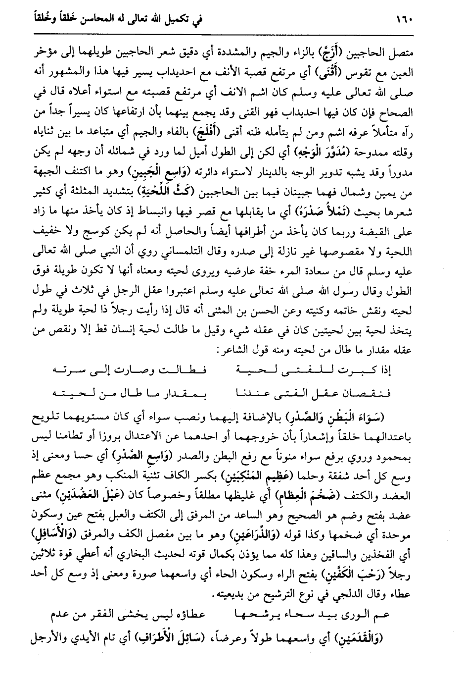 متصل الحاجبين (أزجّ) بالزاء والجيم والمشددة أي دقيق شعر الحاجبين طويلهما إلى مؤخر العين مع تقوس (أقنى) أي مرتفع قصبة الأنف مع احديداب يسير فيها هذا والمشهور أنه صلى الله تعالى عليه وسلم كان اشم الانف أي مرتفع قصبته مع استواء أعلاه قال في الصحاح فإن كان فيها احديداب فهو القنى وقد يجمع بينهما بأن ارتفاعها كان يسيرا جدا من رآه متأملا عرفه اشم ومن لم يتأمله ظنه أقنى (أفلج) بالفاء والجيم أي متباعد ما بين ثناياه وقلته ممدوحة (مدوّر الوجه) أي لكن إلى الطول أميل لما ورد في شمائله أن وجهه لم يكن مدورا وقد يشبه تدوير الوجه بالدينار لاستواء دائرته (واسع الجبين) وهو ما اكتنف الجبهة من يمين وشمال فهما جبينان فيما بين الحاجبين (كثّ اللّحية) بتشديد المثلثة أي كثير شعرها بحيث (تملأ صدره) أي ما يقابلها مع قصر فيها وانبساط إذ كان يأخذ منها ما زاد على القبضة وربما كان يأخذ من أطرافها أيضا والحاصل أنه لم يكن كوسج ولا خفيف اللحية ولا مقصوصها غير نازلة إلى صدره وقال التلمساني روي أن النبي صلى الله تعالى عليه وسلم قال من سعادة المرء خفة عارضيه ويروى لحيته ومعناه أنها لا تكون طويلة فوق الطول وقال رسول الله صلى الله تعالى عليه وسلم اعتبروا عقل الرجل في ثلاث في طول لحيته ونقش خاتمه وكنيته وعن الحسن بن المثنى أنه قال إذا رأيت رجلا ذا لحية طويلة ولم يتخذ لحية بين لحيتين كان في عقله شيء وقيل ما طالت لحية إنسان قط إلا ونقص من عقله مقدار ما طال من لحيته ومنه قول الشاعر: