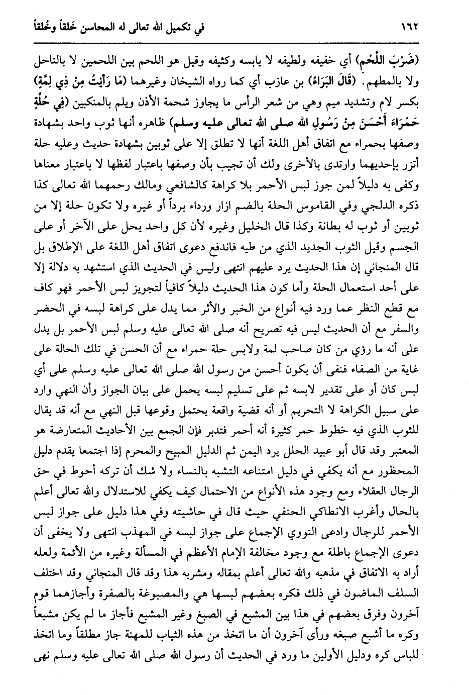 (ضرب اللّحم) أي خفيفه ولطيفه لا يابسه وكثيفه وقيل هو اللحم بين اللحمين لا بالناحل ولا بالمطهم. (قال البراء) بن عازب أي كما رواه الشيخان وغيرهما (ما رأيت من ذي لمّة) بكسر لام وتشديد ميم وهي من شعر الرأس ما يجاوز شحمة الأذن ويلم بالمنكبين (في حلّة حمراء أحسن من رسول الله صلى الله تعالى عليه وسلم) ظاهره أنها ثوب واحد بشهادة وصفها بحمراء مع اتفاق أهل اللغة أنها لا تطلق إلا على ثوبين بشهادة حديث وعليه حلة أتزر بإحديهما وارتدى بالأخرى ولك أن تجيب بأن وصفها باعتبار لفظها لا باعتبار معناها وكفى به دليلا لمن جوز لبس الأحمر بلا كراهة كالشافعي ومالك رحمهما الله تعالى كذا ذكره الدلجي وفي القاموس الحلة بالضم ازار ورداء بردا أو غيره ولا تكون حلة إلا من ثوبين أو ثوب له بطانة وكذا قال الخليل وغيره لأن كل واحد يحل على الآخر أو على الجسم وقيل الثوب الجديد الذي من طيه فاندفع دعوى اتفاق أهل اللغة على الإطلاق بل قال المنجاني إن هذا الحديث يرد عليهم انتهى وليس في الحديث الذي استشهد به دلالة إلا على أحد استعمال الحلة وأما كون هذا الحديث دليلا كافيا لتجويز لبس الأحمر فهو كاف مع قطع النظر عما ورد فيه أنواع من الخبر والأثر مما يدل على كراهة لبسه في الحضر والسفر مع أن الحديث ليس فيه تصريح أنه صلى الله تعالى عليه وسلم لبس الأحمر بل يدل على أنه ما رؤي من كان صاحب لمة ولابس حلة حمراء مع أن الحسن في تلك الحالة على غاية من الصفاء فنفى أن يكون أحسن من رسول الله صلى الله تعالى عليه وسلم على أي لبس كان أو على تقدير لابسه ثم على تسليم لبسه يحمل على بيان الجواز وأن النهي وارد على سبيل الكراهة لا التحريم أو أنه قضية واقعة يحتمل وقوعها قبل النهي مع أنه قد يقال للثوب الذي فيه خطوط حمر كثيرة أنه أحمر فتدبر فإن الجمع بين الأحاديث المتعارضة هو المعتبر وقد قال أبو عبيد الحلل يرد اليمن ثم الدليل المبيح والمحرم إذا اجتمعا يقدم دليل المحظور مع أنه يكفي في دليل امتناعه التشبه بالنساء ولا شك أن تركه أحوط في حق الرجال العقلاء ومع وجود هذه الأنواع من الاحتمال كيف يكفي للاستدلال والله تعالى أعلم بالحال وأغرب الانطاكي الحنفي حيث قال في حاشيته وفي هذا دليل على جواز لبس الأحمر للرجال وادعى النووي الإجماع على جواز لبسه في المهذب انتهى ولا يخفى أن دعوى الإجماع باطلة مع وجود مخالفة الإمام الأعظم في المسألة وغيره من الأئمة ولعله أراد به الاتفاق في مذهبه والله تعالى أعلم بمقاله ومشربه هذا وقد قال المنجاني وقد اختلف السلف الماضون في ذلك فكره بعضهم لبسها هي والمصبوغة بالصفرة وأجازهما قوم آخرون وفرق بعضهم في هذا بين المشبع في الصبغ وغير المشبع فأجاز ما لم يكن مشبعا وكره ما أشبع صبغه ورأى آخرون أن ما اتخذ من هذه الثياب للمهنة جاز مطلقا وما اتخذ للباس كره ودليل الأولين ما ورد في الحديث أن رسول الله صلى الله تعالى عليه وسلم نهى