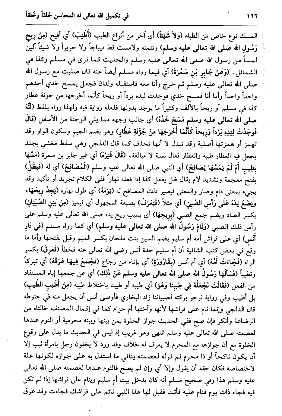 المسك نوع خاص من الظباء (ولا شيئا) أي آخر من أنواع الطيب (أطيب) أي أفيح (من ريح رسول الله صلى الله تعالى عليه وسلم) وتتمته ولا مست قط ديباجا ولا حريرا ولا شيئا ألين لمسا من رسول الله صلى الله تعالى عليه وسلم والحديث كما ترى في مسلم وكذا في الشمائل. (وعن جابر بن سمرة) أي فيما رواه مسلم أيضا عنه قال صليت مع رسول الله صلى الله تعالى عليه وسلم ثم خرج وأنا معه فاستقبله ولدان فجعل يمسح خدي أحدهم واحدا واحدا وأما أنا فمسح خدي فوجدت ليده بردا أو ريحا كأنما أخرجها من جونة عطار كذا في مسلم أو ريحا بالألف وكثيرا ما يوجد بدونها فلعله رواية فيه ولهذا رواه بلفظ (أنّه صلى الله تعالى عليه وسلم مسح خدّه) أي جانب وجهه مما يلي الوجنة من الأسفل (قَالَ فَوَجَدْتُ لِيَدِهِ بَرْدًا وَرِيحًا كَأَنَّمَا أَخْرَجَهَا من جؤنة عطّار) وهو بضم الجيم وسكون الواو وقد تهمز أو همزتها أصلية وقد تبدل لا أنها تحذف كما قال الدلجي وهي سفط مغشي بجلد يجعل فيه العطار طيبه والعطار فعال نسبة لا مبالغة، (قال غيره) أي غير جابر بن سمرة (مسّها بطيب أم لم يمسّها يصافح) أي النبي صلى الله تعالى عليه وسلم (المصافح) أي له (فيظلّ) بفتح معجمة وتشديد لام يقال ظل يفعل كذا إذا فعله نهارا ففي الكلام تجريد أو تأكيد وقد يجيء بمعنى دام وصار والمعنى فيصير ذلك المصافح له (يومه) أي طول نهاره (يَجِدُ رِيحَهَا، وَيَضَعُ يَدَهُ عَلَى رَأْسِ الصَّبِيِّ) أي مثلا (فيعرف) بصيغة المجهول أي فيميز (من بين الصّبيان) بكسر الصاد ويضم جمع الصبي (بريحها) أي بسبب ريح يده صلى الله تعالى عليه وسلم على رأس ذلك الصبي (ونام رسول الله صلى الله تعالى عليه وسلم) أي كما رواه مسلم (في دار أنس) أي على فراش أمه أم سليم بضم السين بنت ملحان بكسر الميم وقيل بفتحها وأما ما وقع في بعض كتب الشافية أن أم سليم جدة أنس رضي الله تعالى عنه فخطأ (فعرق) بكسر الراء (فجاءت أمّه) أي أم أنس (بقارورة) أي بإناء من زجاج (تجمع فيها عرقه) أي تبركا وتطيبا (فسألها رسول الله صلى الله تعالى عليه وسلم عن ذلك) أي عن جمعها إياه المستفاد من الفعل (فقالت نجعله في طيبنا وهو) أي طيبه أو طيبنا باختلاط طيبه (من أطيب الطّيب) بل أطيب وفي رواية نرجو بركته لصبياننا زاد البخاري فأوصى أنس أن يجعل منه في حنوطه قال الدلجي وإنما نام على فراشها لأنها وأختها أم حزام كما في إكمال المصنف خالتاه من الرضاعة وأنكر فإن صح ففي الحديث جواز الخلوة بمن بينها وبينه محرمية أو النوم عندها لعصمته صلى الله تعالى عليه وسلم انتهى وهو غريب إذ ليس في الحديث ما يدل على وقوع الخلوة مع أن جوازها مع المحرم لا يعرف له خلاف وقد ورد لا يخلون رجل بامرأة ثيب إلا أن يكون ناكحا أو ذا محرم ثم قوله لعصمته ينافي ما استدل به على جوازه لكونها علة لاختصاصه فكان حقه أن يقول وإلا أي وإن لم يصح فالنوم عندها لعصمته صلى الله تعالى عليه وسلم هذا وفي صحيح مسلم أنه كان يدخل بيت أم سليم وينام على فراشها إذا لم تكن فيه فجاء ذات يوم فنام عليه فأتت فقيل لها هذا النبي نائم على فراشك فجاءت وقد عرق