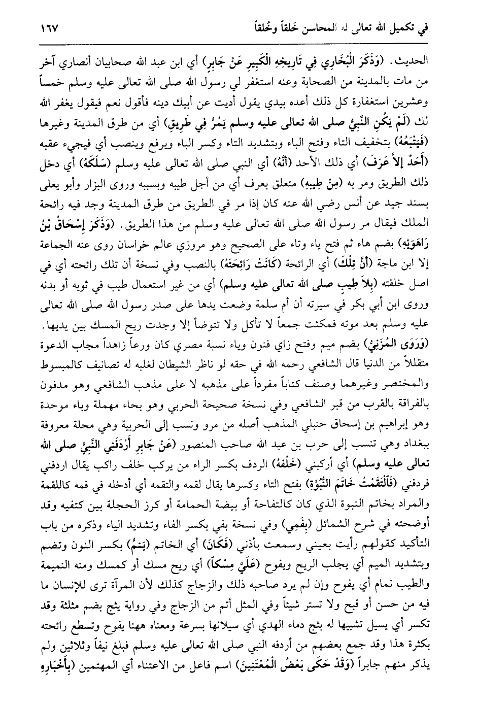 الحديث. (وَذَكَرَ الْبُخَارِيُّ فِي تَارِيخِهِ الْكَبِيرِ عَنْ جَابِرٍ) أي ابن عبد الله صحابيان أنصاري آخر من مات بالمدينة من الصحابة وعنه استغفر لي رسول الله صلى الله تعالى عليه وسلم خمسا وعشرين استغفارة كل ذلك أعده بيدي يقول أديت عن أبيك دينه فأقول نعم فيقول يغفر الله لك (لم يكن النّبيّ صلى الله تعالى عليه وسلم يمرّ في طريق) أي من طرق المدينة وغيرها (فيتبعه) بتخفيف التاء وفتح الباء وبتشديد التاء وكسر الباء ويرفع وينصب أي فيجيء عقبه (أحد إلّا عرف) أي ذلك الأحد (أنّه) أي النبي صلى الله تعالى عليه وسلم (سلكه) أي دخل ذلك الطريق ومر به (من طيبه) متعلق بعرف أي من أجل طيبه وبسببه وروى البزار وأبو يعلى بسند جيد عن أنس رضي الله عنه كان إذا مر في الطريق من طرق المدينة وجد فيه رائحة الملك فيقال مر رسول الله صلى الله تعالى عليه وسلم من هذا الطريق. (وذكر إسحاق بن راهويه) بضم هاء ثم فتح ياء وتاء على الصحيح وهو مروزي عالم خراسان روى عنه الجماعة إلا ابن ماجة (أنّ تلك) أي الرائحة (كانت رائحته) بالنصب وفي نسخة أن تلك رائحته أي في اصل خلقته (بلا طيب صلى الله تعالى عليه وسلم) أي من غير استعمال طيب في ثوبه أو بدنه وروى ابن أبي بكر في سيرته أن أم سلمة وضعت يدها على صدر رسول الله صلى الله تعالى عليه وسلم بعد موته فمكثت جمعا لا تأكل ولا تتوضأ إلا وجدت ريح المسك بين يديها.