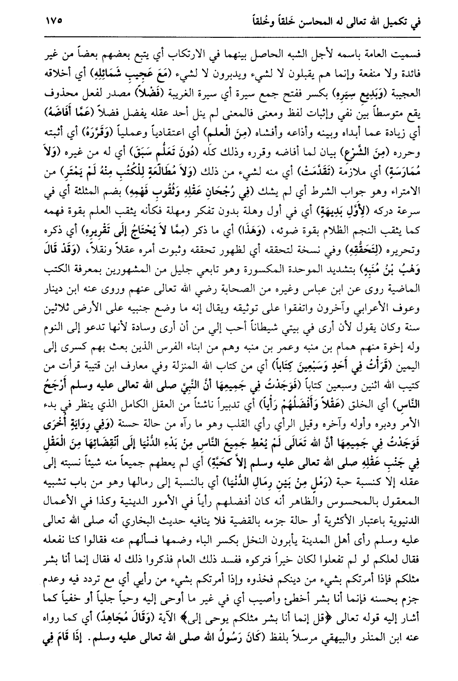 فسميت العامة باسمه لأجل الشبه الحاصل بينهما في الارتكاب أي يتبع بعضهم بعضا من غير فائدة ولا منفعة وإنما هم يقبلون لا لشيء ويدبرون لا لشيء (مع عجيب شمائله) أي أخلاقه العجيبة (وبديع سيره) بكسر ففتح جمع سيرة أي سيرة الغريبة (فضلا) مصدر لفعل محذوف يقع متوسطا بين نفي وإثبات لفظ ومعنى فالمعنى لم ينل أحد عقله يفضل فضلا (عمّا أفاضه) أي زيادة عما أبداه وبينه وأذاعه وأفشاه (من العلم) أي اعتقاديا وعمليا (وقرّره) أي أثبته وحرره (من الشّرع) بيان لما أفاضه وقرره وذلك كله (دون تعلّم سبق) أي له من غيره (ولا ممارسة) أي ملازمة (تقدّمت) أي منه لشيء من ذلك (ولا مطالعة للكتب منه لم يمتر) من الامتراء وهو جواب الشرط أي لم يشك (في رجحان عقله وثقوب فهمه) بضم المثلثة أي في سرعة دركه (لأوّل بديهة) أي في أول وهلة بدون تفكر ومهلة فكأنه يثقب العلم بقوة فهمه كما يثقب النجم الظلام بقوة ضوئه، (وهذا) أي ما ذكر (ممّا لا يحتاج إلى تقريره) أي ذكره وتحريره (لتحقّقه) وفي نسخة لتحققه أي لظهور تحققه وثبوت أمره عقلا ونقلا، (وقد قال وهب بن منبه) بتشديد الموحدة المكسورة وهو تابعي جليل من المشهورين بمعرفة الكتب الماضية روى عن ابن عباس وغيره من الصحابة رضي الله تعالى عنهم وروى عنه ابن دينار وعوف الأعرابي وآخرون واتفقوا على توثيقه ويقال إنه ما وضع جنبيه على الأرض ثلاثين سنة وكان يقول لأن أرى في بيتي شيطانا أحب إلي من أن أرى وسادة لأنها تدعو إلى النوم وله إخوة منهم همام بن منبه وعمر بن منبه وهم من ابناء الفرس الذين بعث بهم كسرى إلى اليمين (قرأت في أحد وسبعين كتابا) أي من كتاب الله المنزلة وفي معارف ابن قتيبة قرأت من كتيب الله اثنين وَسَبْعِينَ كِتَابًا (فَوَجَدْتُ فِي جَمِيعِهَا أَنَّ النَّبِيَّ صلى الله تعالى عليه وسلم أرجح النّاس) أي الخلق (عقلا وأفضلهم رأيا) أي تدبيرا ناشئا من العقل الكامل الذي ينظر في بدء الأمر ودبره وأوله وآخره وقيل الرأي رأي القلب وهو ما رآه من حالة حسنة (وَفِي رِوَايَةٍ أُخْرَى فَوَجَدْتُ فِي جَمِيعِهَا أَنَّ اللَّهَ تَعَالَى لَمْ يُعْطِ جَمِيعَ النَّاسِ مِنْ بَدْءِ الدُّنْيَا إِلَى انْقِضَائِهَا مِنَ الْعَقْلِ فِي جنب عقله صلى الله تعالى عليه وسلم إلّا كحبّة) أي لم يعطهم جميعا منه شيئا نسبته إلى عقله إلا كنسبة حبة (رمل من بين رمال الدّنيا) أي بالنسبة إلى رمالها وهو من باب تشبيه المعقول بالمحسوس والظاهر أنه كان أفضلهم رأيا في الأمور الدينية وكذا في الأعمال الدنيوية باعتبار الأكثرية أو حالة جزمه بالقضية فلا ينافيه حديث البخاري أنه صلى الله تعالى عليه وسلم رأى أهل المدينة يأبرون النخل بكسر الباء وضمها فسألهم عنه فقالوا كنا نفعله فقال لعلكم لو لم تفعلوا لكان خيرا فتركوه ففسد ذلك العام فَذَكَرُوا ذَلِكَ لَهُ فَقَالَ إِنَّمَا أَنَا بَشَرٌ مثلكم فإذا أمرتكم بشيء من دينكم فخذوه وإذا أمرتكم بشيء من رأيي أي مع تردد فيه وعدم جزم بحسنه فإنما أنا بشر أخطئ وأصيب أي في غير ما أوحى إليه وحيا جليا أو خفيا كما أشار إليه قوله تَعَالَى قُلْ إِنَّما أَنَا بَشَرٌ مِثْلُكُمْ يُوحى إِلَيَّ الآية (وقال مجاهد) أي كما رواه عنه ابن المنذر والبيهقي مرسلا بلفظ (كان رسول الله صلى الله تعالى عليه وسلم. إذا قام في