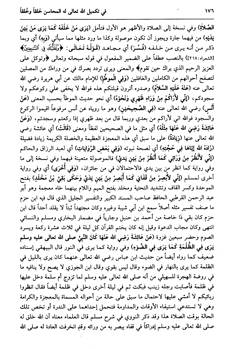 الصّلاة) وفي نسخة إلى الصلاة والأظهر هو الأول فتأمل (يَرَى مِنْ خَلْفِهِ كَمَا يَرَى مِنْ بَيْنِ يديه) من فيهما جارة ويجوز أن تكون موصولة وكذا ما ورد مثلها مما سيأتي (وبه) أي وبما ذكر من أنه يرى من خلفه (فسّر) أي مجاهد (قوله تعالى: وَتَقَلُّبَكَ فِي السَّاجِدِينَ [الشعراء: 218] ) بالنصب عطفا على الضمير المفعول في قوله سبحانه وتعالى وَتَوَكَّلْ عَلَى الْعَزِيزِ الرَّحِيمِ الَّذِي يَراكَ حِينَ تَقُومُ والمعنى ويرى تردد بصرك في من وراءك من المصلين لتصفح أحوالهم من الكاملين والغافلين (وفي الموطّإ) للإمام مالك عن أبي هريرة رضي الله تعالى عنه (عنه عليه السّلام) وصدره أترون قبلتكم هذه فو الله لا يخفى علي ركوعكم ولا سجودكم، (إنّي لأراكم من وراء ظهري ونحوه) أي نحو حديث الموطأ بحسب المعنى (عن أنس) رضي الله تعالى عنه (في الصّحيحين) وهو ما روياه عن أنس مرفوعا اقيموا الركوع والسجود فو الله اني لأراكم من بعدي وربما قال من بعد ظهري إذا ركعتم وسجدتم، (وعن عائشة رضي الله عنها مثله) أي مثل ما في الصحيحين لفظا ومعنى (قالت) أي عائشة رضي الله تعالى عنها (زيادة) على ما سبق أي هذه المعجزة العظيمة والخصلة الكريمة زيادة فضيلة (زاده الله إيّاها في حجّته) أي لصحة نبوته (وفي بعض الرّوايات) أي لعبد الرزاق والحاكم (إِنِّي لَأَنْظُرُ مِنْ وَرَائِي كَمَا أَنْظُرُ مِنْ بين يديّ) فالموصولة متعينة فيهما وفي نسخة إلى ما وفي رواية كما انظر من بين يدي فالاحتمالان في من جائزان، (وفي أخرى) أي وفي رواية أخرى لمسلم (إِنِّي لَأُبْصِرُ مِنْ قَفَايَ كَمَا أُبْصِرُ مِنْ بين يديّ وحكى بقيّ بن مخلد) بفتح الموحدة وكسر القاف وتشديد التحتية ومخلد بفتح الميم واللام بينهما خاء معجمة وهو أبو عبد الرحمن القرطبي الحافظ صاحب المسند الكبير والتفسير الجليل الذي قال فيه ابن حزم ما صنف تفسير مثله أصلا سمع ابن أبي شيبة وغيره وكان مجتهدا ثبتا لا يقلد أحدا قال ابن حزم كان بقي ذا خاصة من أحمد بن حنبل وجاريا في مضمار البخاري ومسلم والنسائي انتهى وكان مجاب الدعوة وقيل إنه كان يختم القرآن كل ليلة في ثلاث عشرة ركعة ويسرد الصوم وحضر سبعين غزوة (عَنْ عَائِشَةَ رَضِيَ اللَّهُ عَنْهَا كَانَ النَّبِيُّ صلى الله تعالى عَلَيْهِ وَسَلَّمَ يَرَى فِي الظُّلْمَةِ كَمَا يَرَى في الضّوء) وفي رواية كما يرى في النور قال البيهقي إسناده ضعيف كما رواه أيضا من حديث ابن عباس رضي الله تعالى عنهما كان يرى بالليل في الظلمة كما يرى بالنهار في الضوء وقال ليس بقوي وقال ابن الجوزي لا يصح ولا ينافيه ما في روضة الهجرة للسهيلي من أنه صلى الله تعالى عليه وسلم لما تزوج أم سلمة دخل عليها في ظلمة فأصابت رجله زينب فبكت ثم في ليلة أخرى دخل في ظلمة أيضا فقال انظروا ربائبكم لا أمشي عليها لاحتمال ما سبق على حالة من أحواله المسماة بالمعجزة والكرامة وهي لا تستدعي استيفاء الأوقات والمداومة فتحمل إحداهما على الندرة أو تخص تلك الحالة بوقت الصلاة هذا وقد ذكر النووي في شرح مسلم قال العلماء معناه أن الله خلق له صلى الله تعالى عليه وسلم إدراكا في قفاه يبصر به من ورائه وقد انخرفت العادة له صلى الله