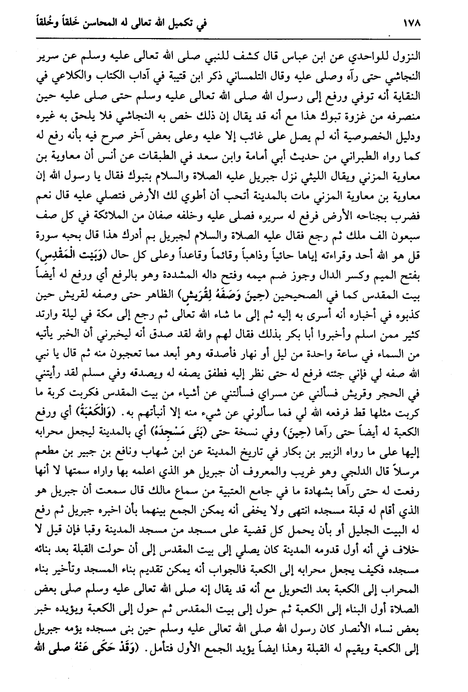 النزول للواحدي عن ابن عباس قال كشف للنبي صلى الله تعالى عليه وسلم عن سرير النجاشي حتى رآه وصلى عليه وقال التلمساني ذكر ابن قتيبة في آداب الكتاب والكلاعي في النقاية أنه توفي ورفع إلى رسول الله صلى الله تعالى عليه وسلم حتى صلى عليه حين منصرفه من غزوة تبوك هذا مع أنه قد يقال إن ذلك خص به النجاشي فلا يلحق به غيره ودليل الخصوصية أنه لم يصل على غائب إلا عليه وعلى بعض آخر صرح فيه بأنه رفع له كما رواه الطبراني من حديث أبي أمامة وابن سعد في الطبقات عن أنس أن معاوية بن معاوية المزني ويقال الليثي نزل جبريل عليه الصلاة والسلام بتبوك فقال يا رسول الله إن معاوية بن معاوية المزني مات بالمدينة أتحب أن أطوي لك الأرض فتصلي عليه قال نعم فضرب بجناحه الأرض فرفع له سريره فصلى عليه وخلفه صفان من الملائكة في كل صف سبعون الف ملك ثم رجع فقال عليه الصلاة والسلام لجبريل بم أدرك هذا قال بحبه سورة قل هو الله أحد وقراءته إياها حائيا وذاهبا وقائما وقاعدا وعلى كل حال (وبيت المقدس) بفتح الميم وكسر الدال وجوز ضم ميمه وفتح داله المشددة وهو بالرفع أي ورفع له أيضا بيت المقدس كما في الصحيحين (حين وصفه لقريش) الظاهر حتى وصفه لقريش حين كذبوه في أخباره أنه أسرى به إليه ثم إلى ما شاء الله تعالى ثم رجع إلى مكة في ليلة وارتد كثير ممن اسلم وأخبروا أبا بكر بذلك فقال لهم والله لقد صدق أنه ليخبرني أن الخبر يأتيه من السماء في ساعة واحدة من ليل أو نهار فأصدقه وهو أبعد مما تعجبون منه ثم قال يا نبي الله صفه لي فإني جئته فرفع له حتى نظر إليه فطفق يصفه له ويصدقه وفي مسلم لقد رأيتني في الحجر وقريش فسألني عن مسراي فسألتني عن أشياء من بيت المقدس فكربت كربة ما كربت مثلها قط فرفعه الله لي فما سألوني عن شيء منه إلا أنبأتهم به. (والكعبة) أي ورفع الكعبة له أيضا حتى رآها (حين) وفي نسخة حتى (بنى مسجده) أي بالمدينة ليجعل محرابه إليها على ما رواه الزبير بن بكار في تاريخ المدينة عن ابن شهاب ونافع بن جبير بن مطعم مرسلا قال الدلجي وهو غريب والمعروف أن جبريل هو الذي اعلمه بها واراه سمتها لا أنها رفعت له حتى رآها بشهادة ما في جامع العتبية من سماع مالك قال سمعت أن جبريل هو الذي أقام له قبلة مسجده انتهى ولا يخفى أنه يمكن الجمع بينهما بأن اخبره جبريل ثم رفع له البيت الجليل أو بأن يحمل كل قضية على مسجد من مسجد المدينة وقبا فإن قيل لا خلاف في أنه أول قدومه المدينة كان يصلي إلى بيت المقدس إلى أن حولت القبلة بعد بنائه مسجده فكيف يجعل محرابه إلى الكعبة فالجواب أنه يمكن تقديم بناء المسجد وتأخير بناء المحراب إلى الكعبة بعد التحويل مع أنه قد يقال إنه صلى الله تعالى عليه وسلم صلى بعض الصلاة أول البناء إلى الكعبة ثم حول إلى بيت المقدس ثم حول إلى الكعبة ويؤيده خبر بعض نساء الأنصار كان رسول الله صلى الله تعالى عليه وسلم حين بنى مسجده يؤمه جبريل إلى الكعبة ويقيم له القبلة وهذا ايضا يؤيد الجمع الأول فتأمل. (وقد حكى عنه صلى الله