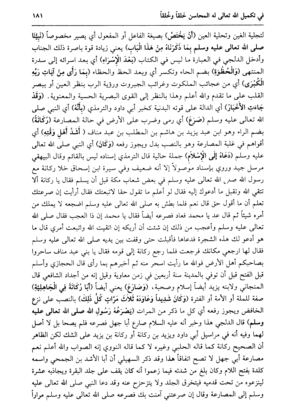 لتجلية الغين وتحلية العين (أن يختصّ) بصيغة الفاعل أو المفعول أي يصير مخصوصا (نبيّنا صلى الله تعالى عليه وسلم بما ذكرناه من هذا الباب) يعني زيادة قوة باصرة ذلك الجناب وأدخل الدلجي في العبارة ما ليس في الكتاب (بعد الإسراء) أي بعد اسرائه إلى سدرة المنتهى (والحظوة) بضم الحاء وتكسر أي وبعد الحظ والحظاء (بما رأى من آيات ربّه الكبرى) أي من عجائب الملكوت وغرائب الجبروت ورؤية الرب بنظر العين أو ببصر القلب على ما تقدم والله أعلم وهذا بالنظر إلى القوى البصرية الحسية والمعنوية. (وقد جاءت الأخبار) أي الدالة على قوته البدنية كخبر أبي داود والترمذي (بأنّه) أي النبي صلى الله تعالى عليه وسلم (صرع) أي رمى وضرب على الأرض في حالة المصارعة (ركانة) بضم الراء وهو ابن عبد يزيد بن هاشم بن المطلب بن عبد مناف (أشدّ أهل وقته) أي أقواهم في غلبة المصارعة وهو بالنصب بدل ويجوز رفعه (وكان) أي النبي صلى الله تعالى عليه وسلم (دعاه إلى الإسلام) جملة حالية قال الترمذي إسناده ليس بالقائم وقال البيهقي مرسل جيد وروي بإسناد موصولا إلا أنه ضعيف وفي سيرة ابن إسحاق خلا ركانة مع رسول الله صلى الله تعالى عليه وسلم في بعض شعاب مكة قبل أن يسلم فقال يا ركانة ألا تتقي الله وتقبل ما أدعوك إليه فقال لو أعلم ما تقول حقا لاتبعتك فقال أرأيت إن صرعتك تعلم أن ما أقول حق قال نعم فلما بطش به صلى الله تعالى عليه وسلم اضجعه لا يملك من أمره شيئا ثم قال عد يا محمد فعاد فصرعه أيضا فقال يا محمد إن ذا العجب فقال صلى الله تعالى عليه وسلم وأعجب من ذلك إن شئت أن أريكه إن اتقيت الله واتبعت أمري قال ما هو أدعو لك هذه الشجرة فدعاها فأقبلت حتى وقفت بين يديه صلى الله تعالى عليه وسلم فقال لها ارجعي مكانك فرجعت فلما رجع ركانة إلى قومه فقال يا بني عبد مناف ساحروا بصاحبكم أهل الأرض فو الله ما رأيت اسحر منه ثم أخبرهم بما رأى قال الحجازي وأسلم قبل الفتح قبل أن توفي بالمدينة سنة أربعين في زمن معاوية وقيل إنه من أجداد الشافعي قال المنجاني ولابنه يزيد أيضا إسلام وصحبة، (وصارع) يعني أيضا (أبا ركانة في الجاهليّة) صفة للملة أو الأمة أو الفترة (وَكَانَ شَدِيدًا وَعَاوَدَهُ ثَلَاثَ مَرَّاتٍ كُلُّ ذَلِكَ) بالنصب على نزع الخافض ويجوز رفعه أي كل ما ذكر من المرات (يصرعه رسول الله صلى الله تعالى عليه وسلم) قال الدلجي هذا وخبر أنه عليه السلام صارع أبا جهل فصرعه فلم يصحا بل لا أصل لهما وفيه أنه في مراسيل أبي داود ويزيد بن ركانة أو ركانة بن يزيد على الشك لكن الظاهر أن الصحيح ركانة كما قاله الحلبي وغيره لا كما قاله النووي إنه الصواب والله أعلم نعم مصارعة أبي جهل لا تصح اتفاقا هذا وقد ذكر السهيلي أن أبا الأشد بن الجمحي واسمه كلدة بفتح اللام وكان بلغ من شدته فيما زعموا أنه كان يقف على جلد البقرة ويجاذبه عشرة لينزعوه من تحت قدميه فيتخرق الجلد ولا يتزحزح عنه وقد دعا النبي صلى الله تعالى عليه وسلم إلى المصارعة وقال إن صرعتني آمنت بك فصرعه صلى الله تعالى عليه وسلم مرارا
