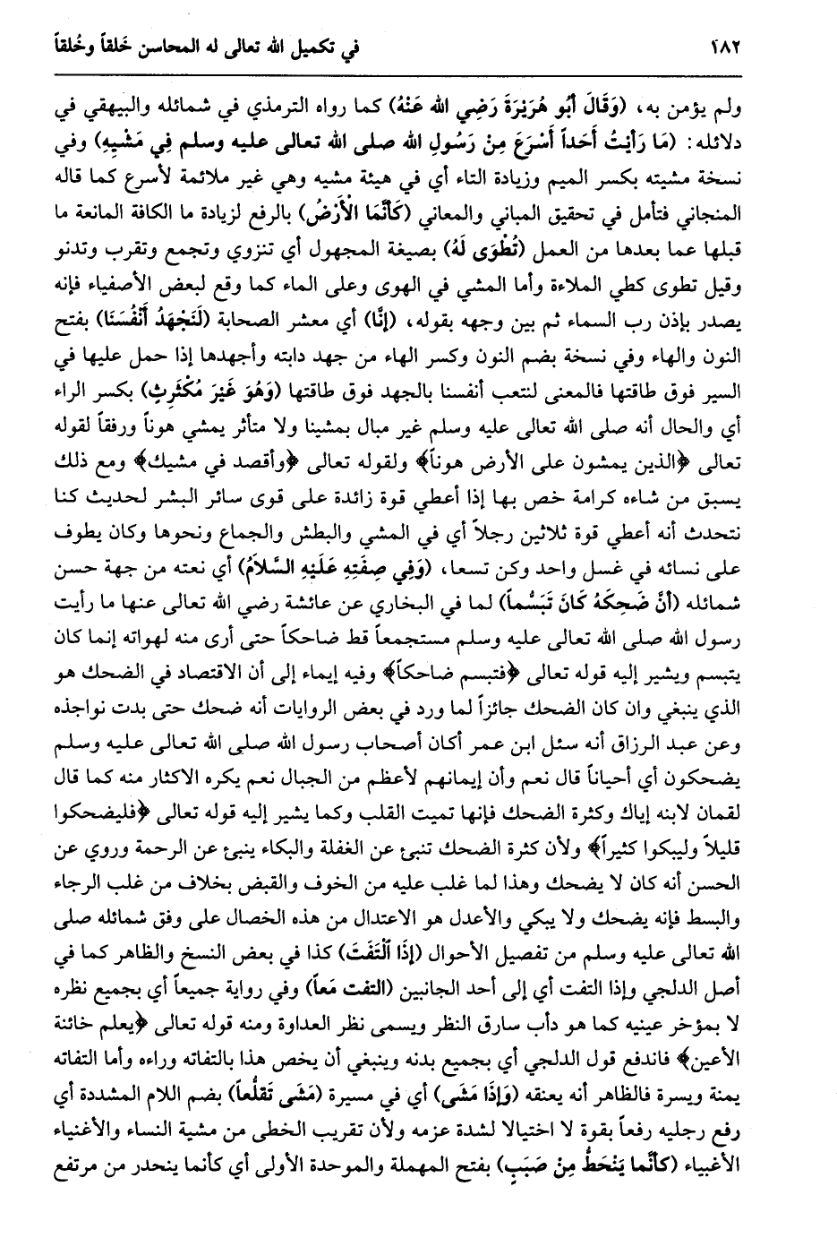 ولم يؤمن به، (وقال أبو هريرة رضي الله عنه) كما رواه الترمذي في شمائله والبيهقي في دلائله: (مَا رَأَيْتُ أَحَدًا أَسْرَعَ مِنْ رَسُولِ اللَّهِ صلى الله تعالى عليه وسلم في مشيه) وفي نسخة مشيته بكسر الميم وزيادة التاء أي في هيئة مشيه وهي غير ملائمة لأسرع كما قاله المنجاني فتأمل في تحقيق المباني والمعاني (كأنّما الأرض) بالرفع لزيادة ما الكافة المانعة ما قبلها عما بعدها من العمل (تطوى له) بصيغة المجهول أي تنزوي وتجمع وتقرب وتدنو وقيل تطوى كطي الملاءة وأما المشي في الهوى وعلى الماء كما وقع لبعض الأصفياء فإنه يصدر بإذن رب السماء ثم بين وجهه بقوله، (إنّا) أي معشر الصحابة (لنجهد أنفسنا) بفتح النون والهاء وفي نسخة بضم النون وكسر الهاء من جهد دابته وأجهدها إذا حمل عليها في السير فوق طاقتها فالمعنى لنتعب أنفسنا بالجهد فوق طاقتها (وهو غير مكثرث) بكسر الراء أي والحال أنه صلى الله تعالى عليه وسلم غير مبال بمشينا ولا متأثر يمشي هونا ورفقا لقوله تعالى الَّذِينَ يَمْشُونَ عَلَى الْأَرْضِ هَوْناً ولقوله تعالى وَاقْصِدْ فِي مَشْيِكَ ومع ذلك يسبق من شاءه كرامة خص بها إذا أعطي قوة زائدة على قوى سائر البشر لحديث كنا نتحدث أنه أعطي قوة ثلاثين رجلا أي في المشي والبطش والجماع ونحوها وكان يطوف على نسائه في غسل واحد وكن تسعا، (وفي صفته عليه السّلام) أي نعته من جهة حسن شمائله (أنّ ضحكه كان تبسّما) لما في البخاري عن عائشة رضي الله تعالى عَنْهَا مَا رَأَيْتُ رَسُولَ اللَّهِ صَلَّى اللَّهُ تعالى عليه وسلم مستجمعا قط ضاحكا حتى أرى منه لهواته إنما كان يتبسم ويشير إليه قوله تعالى فَتَبَسَّمَ ضاحِكاً وفيه إيماء إلى أن الاقتصاد في الضحك هو الذي ينبغي وان كان الضحك جائزا لما ورد في بعض الروايات أنه ضحك حتى بدت نواجذه وعن عبد الرزاق أنه سئل ابن عمر أكان أصحاب رسول الله صلى الله تعالى عليه وسلم يضحكون أي أحيانا قال نعم وأن إيمانهم لأعظم من الجبال نعم يكره الاكثار منه كما قال لقمان لابنه إياك وكثرة الضحك فإنها تميت القلب وكما يشير إليه قوله تعالى فَلْيَضْحَكُوا قَلِيلًا وَلْيَبْكُوا كَثِيراً ولأن كثرة الضحك تنبئ عن الغفلة والبكاء ينبئ عن الرحمة وروي عن الحسن أنه كان لا يضحك وهذا لما غلب عليه من الخوف والقبض بخلاف من غلب الرجاء والبسط فإنه يضحك ولا يبكي والأعدل هو الاعتدال من هذه الخصال على وفق شمائله صلى الله تعالى عليه وسلم من تفصيل الأحوال (إذا التفت) كذا في بعض النسخ والظاهر كما في أصل الدلجي وإذا التفت أي إلى أحد الجانبين (التفت معا) وفي رواية جميعا أي بجميع نظره لا بمؤخر عينيه كما هو دأب سارق النظر ويسمى نظر العداوة ومنه قوله تعالى يَعْلَمُ خائِنَةَ الْأَعْيُنِ فاندفع قول الدلجي أي بجميع بدنه وينبغي أن يخص هذا بالتفاته وراءه وأما التفاته يمنة ويسرة فالظاهر أنه يعنقه (وإذا مشى) أي في مسيرة (مشى تقلّعا) بضم اللام المشددة أي رفع رجليه رفعا بقوة لا اختيالا لشدة عزمه ولأن تقريب الخطى من مشية النساء والأغنياء الأغبياء (كأنّما ينحطّ من صبب) بفتح المهملة والموحدة الأولى أي كأنما ينحدر من مرتفع