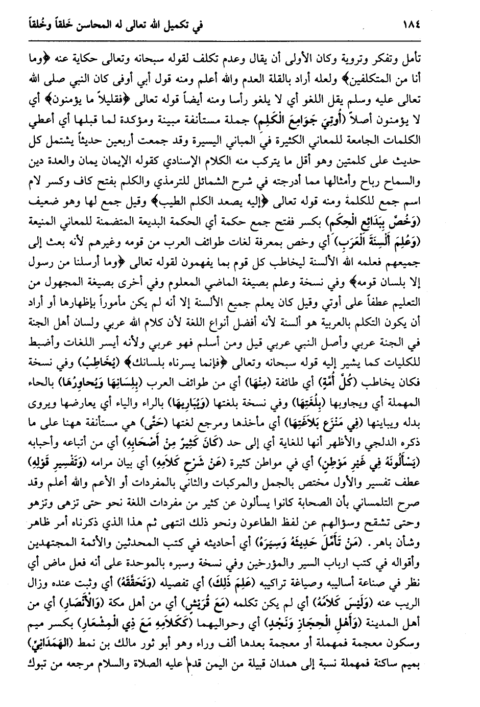 تأمل وتفكر وتروية وكان الأولى أن يقال وعدم تكلف لقوله سبحانه وتعالى حكاية عنه وَما أَنَا مِنَ الْمُتَكَلِّفِينَ ولعله أراد بالقلة العدم والله أعلم ومنه قول أبي أوفى كان النبي صلى الله تعالى عليه وسلم يقل اللغو أي لا يلغو رأسا ومنه أيضا قوله تعالى فَقَلِيلًا ما يُؤْمِنُونَ أي لا يؤمنون أصلا (أوتي جوامع الكلم) جملة مستأنفة مبينة ومؤكدة لما قبلها أي أعطي الكلمات الجامعة للمعاني الكثيرة في المباني اليسيرة وقد جمعت أربعين حديثا يشتمل كل حديث على كلمتين وهو أقل ما يتركب منه الكلام الإسنادي كقوله الإيمان يمان والعدة دين والسماح رباح وأمثالها مما أدرجته في شرح الشمائل للترمذي والكلم بفتح كاف وكسر لام اسم جمع للكلمة ومنه قوله تعالى إِلَيْهِ يَصْعَدُ الْكَلِمُ الطَّيِّبُ وقيل جمع لها وهو ضعيف (وخصّ ببدائع الحكم) بكسر ففتح جمع حكمة أي الحكمة البديعة المتضمنة للمعاني المنيعة (وعلم ألسنة العرب) أي وخص بمعرفة لغات طوائف العرب من قومه وغيرهم لأنه بعث إلى جميعهم فعلمه الله الألسنة ليخاطب كل قوم بما يفهمون لقوله تَعَالَى وَما أَرْسَلْنا مِنْ رَسُولٍ إِلَّا بِلِسانِ قَوْمِهِ وفي نسخة وعلم بصيغة الماضي المعلوم وفي أخرى بصيغة المجهول من التعليم عطفا على أوتي وقيل كان يعلم جميع الألسنة إلا أنه لم يكن مأمورا بإظهارها أو أراد أن يكون التكلم بالعربية هو ألسنة لأنه أفضل أنواع اللغة لأن كلام الله عربي ولسان أهل الجنة في الجنة عربي وأصل النبي عربي قيل ومن أسلم فهو عربي ولأنه أيسر اللغات وأضبط للكليات كما يشير إليه قوله سبحانه وتعالى فَإِنَّما يَسَّرْناهُ بِلِسانِكَ (يخاطب) وفي نسخة فكان يخاطب (كلّ أمّة) أي طائفة (منها) أي من طوائف العرب (بلسانها ويحاورها) بالحاء المهملة أي ويجاوبها (بلغتها) وفي نسخة بلغتها (ويباريها) بالراء والياء أي يعارضها ويروى بدله ويباينها (في منزع بلاغتها) أي مأخذها ومرجع لغتها (حتّى) هي مستأنفة ههنا على ما ذكره الدلجي والأظهر أنها للغاية أي إلى حد (كان كثير من أصحابه) أي من أتباعه وأحبابه (يسألونه في غير موطن) أي في مواطن كثيرة (عن شرح كلامه) أي بيان مرامه (وتفسير قوله) عطف تفسير والأول مختص بالجمل والمركبات والثاني بالمفردات أو الأعم والله أعلم وقد صرح التلمساني بأن الصحابة كانوا يسألون عن كثير من مفردات اللغة نحو حتى تزهى وتزهو وحتى تشقح وسؤالهم عن لفظ الطاعون ونحو ذلك انتهى ثم هذا الذي ذكرناه أمر ظاهر وشأن باهر. (من تأمّل حديثه وسيره) أي أحاديثه في كتب المحدثين والأئمة المجتهدين وأقواله في كتب ارباب السير والمؤرخين وفي نسخة وسبره بالموحدة على أنه فعل ماض أي نظر في صناعة أساليبه وصياغة تراكيبه (علم ذلك) أي تفصيله (وتحقّقه) أي وثبت عنده وزال الريب عنه (وليس كلامه) أي لم يكن تكلمه (مع قريش) أي من أهل مكة (والأنصار) أي من أهل المدينة (وأهل الحجاز ونجد) أي وحواليهما (ككلامه مع ذي المشعار) بكسر ميم وسكون معجمة فمهملة أو معجمة بعدها ألف وراء وهو أبو ثور مالك بن نمط (الهمدانيّ) بميم ساكنة فمهملة نسبة إلى همدان قبيلة من اليمن قدم عليه الصلاة والسلام مرجعه من تبوك