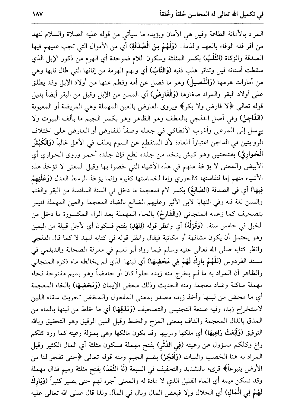 المراد بالأمانة الطاعة وقيل هي الأمان ويؤيده ما سيأتي من قوله عليه الصلاة والسلام لنهد من أقر فله الوفاء بالعهد والذمة. (ولهم من الصّدقة) أي من الأموال التي تجب عليهم فيها الصدقة والزكاة (الثّلب) بكسر المثلثة وسكون اللام فموحدة أي الهرم من ذكور الإبل الذي سقطت أسنانه قيل وتناثر هلب ذنبه (والنّاب) أي ولهم الهرمة من إناثها التي طال نابها وهي من أمارات هرمها (والفصيل) وهو ما فصل عن أمه وفطم عنها من أولاد الإبل وقد يطلق على أولاد البقر والمراد صغارها (والفارض) أي المسن من الإبل وقيل من البقر أيضا بديل قوله تعالى لا فارِضٌ وَلا بِكْرٌ ويروى العارض بالعين المهملة وهي المريضة أو المعيوبة (الدّاجن) وفي أصل الدلجي بالعطف وهو الظاهر وهو بكسر الجيم ما يألف البيوت ولا يرسل إلى المرعى وأغرب الأنطاكي في جعله وصفا للفارض أو العارض على اختلاف الروايتين في الداجن اعتبارا للعادة لأن المنقطع عن السوم يعلف في الأهل غالبا (والكبش الحواريّ) بفتحتين وهو كبش يتخذ من جلده نطع فإن جلده أحمر وروى الحواري أي الأبيض والمعنى لا يؤخذ منهم في هذه الأشياء التي خصوا بها وقيل المعنى لا تؤخذ هذه الأشياء منهم إما لنفاستها كالحوري وإما لخساستها كغيره وإنما يؤخذ الوسط العدل (وعليهم فيها) أي في الصدقة (الصّالغ) بكسر لام فمعجمة ما دخل في السنة السادسة من البقر والغنم والسين لغة فيه وفي النهاية لابن الأثير وعليهم الضالع بالضاد المعجمة والعين المهملة فليس بتصحيف كما زعمه المنجاني (والقارح) بالحاء المهملة بعد الراء المكسورة ما دخل من الخيل في خامس سنة. (وقوله) أي وانظر قوله (لنهد) بفتح فسكون أي لأجل قبيلة من اليمين وهو يحتمل أن يكون مشافهة أو مكاتبة فيقال وانظر قوله في كتابه لنهد لا كما قال الدلجي وانظر كتابه صلى الله تعالى عليه وسلم فيما رواه أبو نعيم في معرفة الصحابة والديلمي في مسند الفردوس (للهمّ بارك لهم في محضها) أي لبنها الذي لم يخالطه ماء ذكره المنجاني والظاهر أن المراد به ما لم يخرج منه زبده حلوا كان أو حامضا وهو بميم مفتوحة فحاء مهملة ساكنة وضاد معجمة ومنه الحديث وذلك محض الإيمان (ومحضها) بالخاء المعجمة أي ما مخض من لبنها وأخذ زبده مصدر بمعنى المفعول والمخض تحريك سقاء اللبن لاستخراج زبده وفيه صنعة التجنيس والتصحيف (ومذقها) أي ما خلط من لبنها بالماء من المذق بالذال المعجمة والقاف بمعنى المزج والخلط وقيل اللبن الرقيق وهو التحقيق وبالله التوفيق (وابعث راعيها) أي ملكها ومربيها وقد يكون مالكها وهي بمنزلة رعيته كما ورد كلكم راع وكلكم مسؤول عن رعيته (في الدّثر) بفتح مهملة فسكون مثلثة أي المال الكثير وقيل المراد به هنا الخصب والنبات (وافجر) بضم الجيم ومنه قوله تعالى حَتَّى تَفْجُرَ لَنا مِنَ الْأَرْضِ يَنْبُوعاً قرىء بالتشديد والتخفيف في السبعة (له الثّمد) بفتح مثلثة وميم فدال مهملة وقد تسكن ميمه أي الماء القليل الذي لا مادة له والمعنى أجره لهم حتى يصير كثيرا (وبارك لهم في المال) أي الحلال وإلا فبعض المال وبال في المآل ولذا قال صلى الله تعالى عليه
