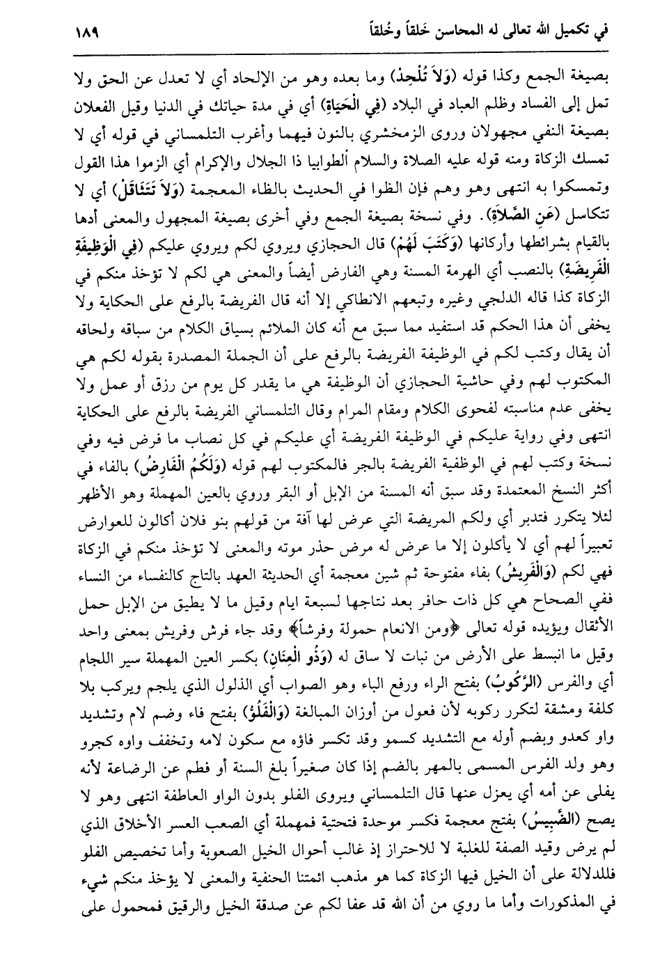 بصيغة الجمع وكذا قوله (ولا تلحد) وما بعده وهو من الإلحاد أي لا تعدل عن الحق ولا تمل إلى الفساد وظلم العباد في البلاد (في الحياة) أي في مدة حياتك في الدنيا وقيل الفعلان بصيغة النفي مجهولان وروى الزمخشري بالنون فيهما وأغرب التلمساني في قوله أي لا تمسك الزكاة ومنه قوله عليه الصلاة والسلام الطوابيا ذا الجلال والإكرام أي الزموا هذا القول وتمسكوا به انتهى وهو وهم فإن الظوا في الحديث بالظاء المعجمة (ولا تتثاقل) أي لا تتكاسل (عن الصّلاة) . وفي نسخة بصيغة الجمع وفي أخرى بصيغة المجهول والمعنى أدها بالقيام بشرائطها وأركانها (وكتب لهم) قال الحجازي ويروي لكم ويروي عليكم (في الوظيفة الفريضة) بالنصب أي الهرمة المسنة وهي الفارض أيضا والمعنى هي لكم لا تؤخذ منكم في الزكاة كذا قاله الدلجي وغيره وتبعهم الانطاكي إلا أنه قال الفريضة بالرفع على الحكاية ولا يخفى أن هذا الحكم قد استفيد مما سبق مع أنه كان الملائم بسياق الكلام من سباقه ولحاقه أن يقال وكتب لكم في الوظيفة الفريضة بالرفع على أن الجملة المصدرة بقوله لكم هي المكتوب لهم وفي حاشية الحجازي أن الوظيفة هي ما يقدر كل يوم من رزق أو عمل ولا يخفى عدم مناسبته لفحوى الكلام ومقام المرام وقال التلمساني الفريضة بالرفع على الحكاية انتهى وفي رواية عليكم في الوظيفة الفريضة أي عليكم في كل نصاب ما فرض فيه وفي نسخة وكتب لهم في الوظيفة الفريضة بالجر فالمكتوب لهم قوله (ولكم الفارض) بالفاء في أكثر النسخ المعتمدة وقد سبق أنه المسنة من الإبل أو البقر وروي بالعين المهملة وهو الأظهر لئلا يتكرر فتدبر أي ولكم المريضة التي عرض لها آفة من قولهم بنو فلان أكالون للعوارض تعبيرا لهم أي لا يأكلون إلا ما عرض له مرض حذر موته والمعنى لا تؤخذ منكم في الزكاة فهي لكم (والفريش) بفاء مفتوحة ثم شين معجمة أي الحديثة العهد بالتاج كالنفساء من النساء ففي الصحاح هي كل ذات حافر بعد نتاجها لسبعة ايام وقيل ما لا يطيق من الإبل حمل الأثقال ويؤيده قوله تعالى وَمِنَ الْأَنْعامِ حَمُولَةً وَفَرْشاً وقد جاء فرش وفريش بمعنى واحد وقيل ما انبسط على الأرض من نبات لا ساق له (وذو العنان) بكسر العين المهملة سير اللجام أي والفرس (الرّكوب) بفتح الراء ورفع الباء وهو الصواب أي الذلول الذي يلجم ويركب بلا كلفة ومشقة لتكرر ركوبه لأن فعول من أوزان المبالغة (والفلوّ) بفتح فاء وضم لام وتشديد واو كعدو وبضم أوله مع التشديد كسمو وقد تكسر فاؤه مع سكون لامه وتخفف واوه كجرو وهو ولد الفرس المسمى بالمهر بالضم إذا كان صغيرا بلغ السنة أو فطم عن الرضاعة لأنه يفلى عن أمه أي يعزل عنها قال التلمساني ويروى الفلو بدون الواو العاطفة انتهى وهو لا يصح (الضّبيس) بفتج معجمة فكسر موحدة فتحتية فمهملة أي الصعب العسر الأخلاق الذي لم يرض وقيد الصفة للغلبة لا للاحتراز إذ غالب أحوال الخيل الصعوبة وأما تخصيص الفلو فللدلالة على أن الخيل فيها الزكاة كما هو مذهب ائمتنا الحنفية والمعنى لا يؤخذ منكم شيء في المذكورات وأما ما روي من أن الله قد عفا لكم عن صدقة الخيل والرقيق فمحمول على