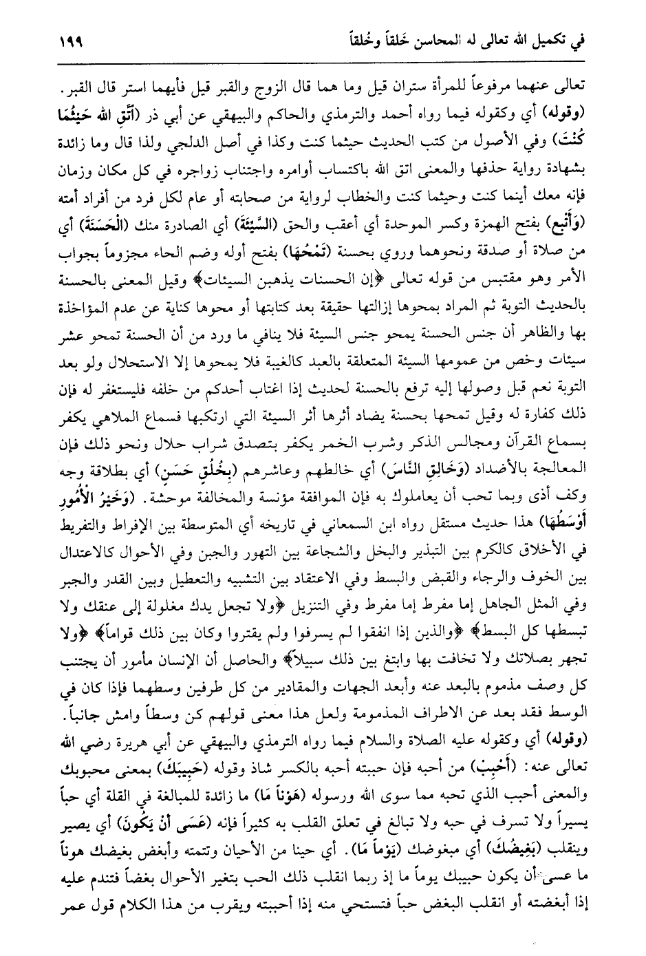 (وقوله) أي وكقوله فيما رواه أحمد والترمذي والحاكم والبيهقي عن أبي ذر (اتّق الله حيثما كنت) وفي الأصول من كتب الحديث حيثما كنت وكذا في أصل الدلجي ولذا قال وما زائدة بشهادة رواية حذفها والمعنى اتق الله باكتساب أوامره واجتناب زواجره في كل مكان وزمان فإنه معك أينما كنت وحيثما كنت والخطاب لرواية من صحابته أو عام لكل فرد من أفراد أمته (وأتبع) بفتح الهمزة وكسر الموحدة أي أعقب والحق (السّيّئة) أي الصادرة منك (الحسنة) أي من صلاة أو صدقة ونحوهما وروي بحسنة (تمحها) بفتح أوله وضم الحاء مجزوما بجواب الأمر وهو مقتبس من قوله تعالى إِنَّ الْحَسَناتِ يُذْهِبْنَ السَّيِّئاتِ وقيل المعنى بالحسنة بالحديث التوبة ثم المراد بمحوها إزالتها حقيقة بعد كتابتها أو محوها كناية عن عدم المؤاخذة بها والظاهر أن جنس الحسنة يمحو جنس السيئة فلا ينافي ما ورد من أن الحسنة تمحو عشر سيئات وخص من عمومها السيئة المتعلقة بالعبد كالغيبة فلا يمحوها إلا الاستحلال ولو بعد التوبة نعم قبل وصولها إليه ترفع بالحسنة لحديث إذا اغتاب أحدكم من خلفه فليستغفر له فإن ذلك كفارة له وقيل تمحها بحسنة يضاد أثرها أثر السيئة التي ارتكبها فسماع الملاهي يكفر بسماع القرآن ومجالس الذكر وشرب الخمر يكفر بتصدق شراب حلال ونحو ذلك فإن المعالجة بالأضداد (وخالق النّاس) أي خالطهم وعاشرهم (بخلق حسن) أي بطلاقة وجه وكف أذى وبما تحب أن يعاملوك به فإن الموافقة مؤنسة والمخالفة موحشة. (وخير الأمور أوسطها) هذا حديث مستقل رواه ابن السمعاني في تاريخه أي المتوسطة بين الإفراط والتفريط في الأخلاق كالكرم بين التبذير والبخل والشجاعة بين التهور والجبن وفي الأحوال كالاعتدال بين الخوف والرجاء والقبض والبسط وفي الاعتقاد بين التشبيه والتعطيل وبين القدر والجبر وفي المثل الجاهل إما مفرط إما مفرط وفي التنزيل وَلا تَجْعَلْ يَدَكَ مَغْلُولَةً إِلى عُنُقِكَ وَلا تَبْسُطْها كُلَّ الْبَسْطِ وَالَّذِينَ إِذا أَنْفَقُوا لَمْ يُسْرِفُوا وَلَمْ يَقْتُرُوا وَكانَ بَيْنَ ذلِكَ قَواماً وَلا تَجْهَرْ بِصَلاتِكَ وَلا تُخافِتْ بِها وَابْتَغِ بَيْنَ ذلِكَ سَبِيلًا والحاصل أن الإنسان مأمور أن يجتنب كل وصف مذموم بالبعد عنه وأبعد الجهات والمقادير من كل طرفين وسطهما فإذا كان في الوسط فقد بعد عن الاطراف المذمومة ولعل هذا معنى قولهم كن وسطا وامش جانبا.