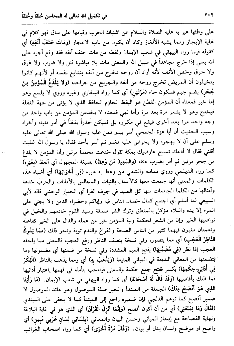 على وطئها عبر به عليه الصلاة والسلام عن اشتباك الحرب وقيامها على ساق فهو كلام في غاية الإيجاز ومما يشبه الألغاز وكاد أن يكون من باب الاعجاز (ومات حتف أنفه) أي كقوله فيما رواه البيهقي في شعب الإيمان ولفظه من مات حتف أنفه فقد وقع أجره على الله يعني إذا خرج مجاهدا في سبيل الله والمعنى مات بلا مباشرة قتل ولا ضرب ولا غرق ولا حرق وخص الأنف لأنه أراد أن روحه تخرج من أنفه بتتابع نفسه أو لأنهم كانوا يتخيلون أن المريض تخرج روحه من أنفه والجريح من جراحته (ولا يلدغ المؤمن من جحر) بضم جيم فسكون حاء (مرّتين) أي كما رواه البخاري وغيره وروي لا يلسع وهو إما خبر فمعناه أن المؤمن الفطن هو اليقظ الحازم الحافظ الذي لا يؤتى من جهة الغفلة فيخدع وهو لا يشعر مرة بعد مرة وأما نهي فمعناه لا يخدعن المؤمن من باب واحد من وجه واحد مرة بعد أخرى فيقع في مكروه بل فليكن حذرا يقظا في أمر دنياه وأخراه وسبب الحديث أن أبا عزة الجمحي أسر ببدر فمن عليه رسول الله صلى الله تعالى عليه وسلم على أن لا يهجوه ولا يحرض عليه فغدر ثم أسر بأحد فقال يا رسول الله غلبت أقلني فقال لا أدعك تمسح عارضيك بمكة تقول خدعت محمدا مرتين وأن المؤمن لا يلدغ من جحر مرتين ثم أمر بضرب عنقه (والسّعيد من وعظ) بصيغة المجهول أي أتعظ (بغيره) كما رواه الديلمي وروي تمامه والشقي من وعظ به غيره (في أخواتها) أي أشباه هذه الكلمات والمعنى أنها جمعت معها كالأعمال بالنيات والمجالس بالأمانات والحرب خدعة وأمثالها من الكلما الجامعات منها كل الصيد في جوف الفرا أي الحمار الوحشي قاله لأبي السبيعي لما أسلم أي اجتمع كمال خصال الناس فيه وإياكم وخضراء الدمن ولا يجني على المرء إلا يده والبلاء مؤكل بالمنطق وترك الشر صدقة وسيد القوم خادمهم والخيل في نواصيها الخير وإن من الشعر لحكمة ونية المؤمن خير من عمله والدال على الخير كفاعله ونعمتان مغبون فيهما كثير من الناس الصحة والفراغ والندم توبة ونحو ذلك (مما يدرك النّاظر العجب) أي مما يتصوره وفي نسخة بنصف الناظر ورفع العجب فالمعنى مما يلحقه العجب إذا نظر (في مضمّنها) بفتح الميم المشددة وفي نسخة من ضمنها أي مضمونها وما يتضمنها من المعاني البديعة في المباني المنيعة (ويذهب به) أي ومما يذهب بالناظر (الفكر في أداني حكمها) بكسر ففتح جمع حكمة والمعنى فيتعجب بتأمله في فهمها باعتبار أدانيها فما ظنك بأقاصيها (وقد قال له أصحابه) أي كما رواه البيهقي في شعب الإيمان. (ما رأينا الذي هو أفصح منك) الجملة من المبتدأ والخبر صلة الموصول وهو عائد الموصول لا ضمير أفصح كما توهم الدلجي فإن ضميره راجع إلى المبتدأ كما لا يخفى على المبتدي (فقال وما يمنعني) أي من أن أكون أفصح (وإنّما أنزل القرآن) أي الذي هو في غاية البلاغة ونهاية الفصاحة مع إيجاز المباني وحسن البيان والمعاني (بلساني لسان عربي مبين) أي واضح او موضح ولسان بدل أو بيان. (وقال مرّة أخرى) أي كما رواه اصحاب الغرائب