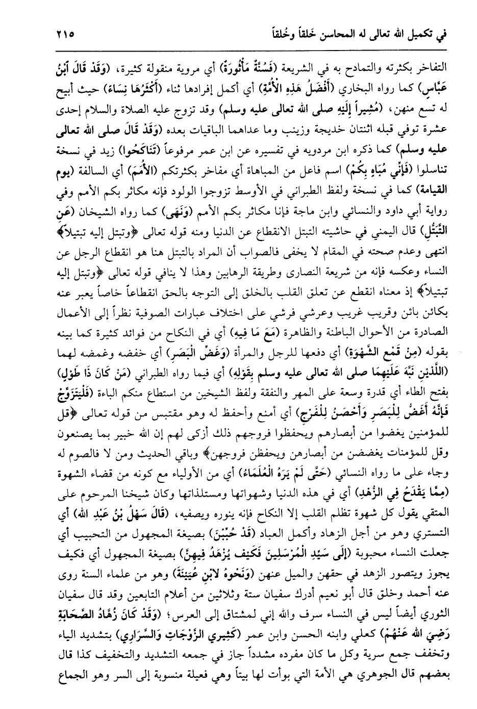 التفاخر بكثرته والتمادح به في الشريعة (فسنّة مأثورة) أي مروية منقولة كثيرة، (وقد قال ابن عبّاس) كما رواه البخاري (أفضل هذه الأمّة) أي أكمل إفرادها ثناء (أكثرها نساء) حيث أبيح له تسع منهن، (مشيرا إليه صلى الله تعالى عليه وسلم) وقد تزوج عليه الصلاة والسلام إحدى عشرة توفي قبله اثنتان خديجة وزينب وما عداهما الباقيات بعده (وقد قال صلى الله تعالى عليه وسلم) كما ذكره ابن مردويه في تفسيره عن ابن عمر مرفوعا (تناكحوا) زيد في نسخة تناسلوا (فإنّي مباه بكم) اسم فاعل من المباهاة أي مفاخر بكثرتكم (الأمم) أي السالفة (يوم القيامة) كما في نسخة ولفظ الطبراني في الأوسط تزوجوا الولود فإنه مكاثر بكم الأمم وفي رواية أبي داود والنسائي وابن ماجة فإنا مكاثر بكم الأمم (ونهى) كما رواه الشيخان (عن التّبتّل) قال اليمني في حاشيته التبتل الانقطاع عن الدنيا ومنه قوله تعالى وَتَبَتَّلْ إِلَيْهِ تَبْتِيلًا انتهى وعدم صحته في المقام لا يخفى فالصواب أن المراد بالتبتل هنا هو انقطاع الرجل عن النساء وعكسه فإنه من شريعة النصارى وطريقة الرهابين وهذا لا ينافي قوله تعالى وَتَبَتَّلْ إِلَيْهِ تَبْتِيلًا إذ معناه انقطع عن تعلق القلب بالخلق إلى التوجه بالحق انقطاعا خاصا يعبر عنه بكائن بائن وقريب غريب وعرشي فرشي على اختلاف عبارات الصوفية نظرا إلى الأعمال الصادرة من الأحوال الباطنة والظاهرة (مع ما فيه) أي في النكاح من فوائد كثيرة كما بينه بقوله (من قمع الشّهوة) أي دفعها للرجل والمرأة (وغضّ البصر) أي خفضه وغمضه لهما (اللّذين نبّه عليهما صلى الله تعالى عليه وسلم بقوله) أي فيما رواه الطبراني (من كان ذا طول) بفتح الطاء أي قدرة وسعة على المهر والنفقة ولفظ الشيخين من استطاع منكم الباءة (فليتزوّج فإنّه أغضّ للبصر وأحصن للفرج) أي أمنع وأحفظ له وهو مقتبس من قوله تعالى قُلْ لِلْمُؤْمِنِينَ يَغُضُّوا مِنْ أَبْصارِهِمْ وَيَحْفَظُوا فُرُوجَهُمْ ذلِكَ أَزْكى لَهُمْ إِنَّ اللَّهَ خَبِيرٌ بِما يَصْنَعُونَ وَقُلْ لِلْمُؤْمِناتِ يَغْضُضْنَ مِنْ أَبْصارِهِنَّ وَيَحْفَظْنَ فُرُوجَهُنَّ وباقي الحديث ومن لا فالصوم له وجاء على ما رواه النسائي (حتّى لم يره العلماء) أي من الأولياء مع كونه من قضاء الشهوة (ممّا يقدح في الزّهد) أي في هذه الدنيا وشهواتها ومستلذاتها وكان شيخنا المرحوم على المتقي يقول كل شهوة تظلم القلب إلا النكاح فإنه ينوره ويصفيه، (قال سهل بن عبد الله) أي التستري وهو من أجل الزهاد وأكمل العباد (قد حبّبن) بصيغة المجهول من التحبيب أي جعلت النساء محبوبة (إلى سيّد المرسلين فكيف يزهد فيهنّ) بصيغة المجهول أي فكيف يجوز ويتصور الزهد في حقهن والميل عنهن (ونحوه لابن عيينة) وهو من علماء السنة روى عنه أحمد وخلق قال أبو نعيم أدرك سفيان ستة وثلاثين من أعلام التابعين وقد قال سفيان الثوري أيضا ليس في النساء سرف والله إني لمشتاق إلى العرس؛ (وَقَدْ كَانَ زُهَّادُ الصَّحَابَةِ رَضِيَ اللَّهُ عَنْهُمْ) كعلي وابنه الحسن وابن عمر (كثيري الزّوجات والسّراري) بتشديد الياء وتخفف جمع سرية وكل ما كان مفرده مشددا جاز في جمعه التشديد والتخفيف كذا قال بعضهم قال الجوهري هي الأمة التي بوأت لها بيتا وهي فعيلة منسوبة إلى السر وهو الجماع
