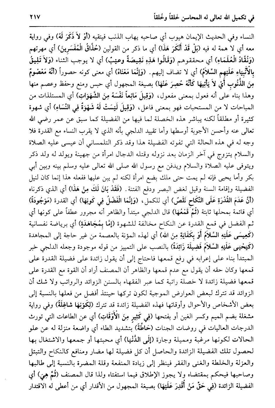 النساء وفي الحديث الإيمان هيوب أي صاحبه يهاب الذنب فيتقيه (أو لا ذكر له) وفي رواية معه أي لا همة له فيه (بل قد أنكر هذا) أي ما ذكر من القولين (حذّاق المفسرين) أي مهرتهم (ونقّاد العلماء) أي محققوهم (وقالوا هذه نقيصة وعيب) أي لا يوجب الثناء (ولا تليق بالأنبياء عليهم السّلام) أي لا تضاف إليهم. (وإنّما معناه) أي معنى كونه حصورا (أَنَّهُ مَعْصُومٌ مِنَ الذُّنُوبِ أَيْ لَا يَأْتِيهَا كأنّه حصر عنها) بصيغة المجهول أي حبس ومنع وحفظ وعصم منها وهذا بناء على أنه فعول بمعنى مفعول، (وقيل مانعا نفسه من الشّهوات) أي المستلذات من المباحات لا من المستحبات فهو بمعنى فاعل، (وقيل ليست له شهوة في النّساء) أي شهوة كثيرة أو مطلقا لكنه يباشر هذه الخصلة لما فيها من الفضيلة كما سبق عن عمر رضي الله تعالى عنه وأحسن الأجوبة أوسطها وأما تقييد الدلجي بأنه الذي لا يقرب النساء مع القدرة فلا وجه له في هذه الحالة التي تفوته الفضيلة هذا وقد ذكر التلمساني أن عيسى عليه الصلاة والسلام يتزوج في آخر الزمان بعد نزوله وقتله الدجال امرأة من جهينة ويولد له ولد ذكر ويتوفى عليه الصلاة والسلام ويدفن مع رسول الله صلى الله تعالى عليه وسلم بينه وبين أبي بكر وأما يحيى فإنه لم يمت حتى ملك بضع امرأة لكنه لم يبن عليها ففعله هذا إنما كان لنيل الفضيلة وإقامة السنة وقيل لغض البصر ودفع الفتنة. (فقد بان لك من هذا) أي الذي ذكرناه (أنّ عدم القدرة على النّكاح نقص) أي للكمل، (وإنّما الفضل في كونها) أي القدرة (موجودة) أي قائمة بمحلها ثابتة (ثمّ قمعها) قال الدلجي مبتدأ والظاهر أنه مجرور عطفا على كونها أي ثم الفضل في قمع القدرة عن النكاح مخالفة للشهوة (إمّا بمجاهدة) أي برياضة نفسانية (كَعِيسَى عَلَيْهِ السَّلَامُ أَوْ بِكِفَايَةٍ مِنَ اللَّهِ) أي لهذه المؤنة بالعصمة من غير حاجة إلى المجاهدة (كيحيى عليه السّلام فضيلة زائدة) بالنصب على التمييز من قوله موجودة وجعله الدلجي خبر المبتدأ بناء على إعرابه في رفع قمعها فاحتاج إلى أن يقول زائدة على فضيلة القدرة على قمعها وكان حقه أن يقول مع عدم قمعها والظاهر أن المصنف أراد أن القوة مع القدرة على قمعها فضيلة زائدة لا خصلة راتبة كما عبر الفقهاء بالسنن الزوائد والرواتب ولا شك أن الزوائد قد تترك لبعض العوارض الموجبة لكون تركها حينئذ أفضل من فعلها بالنسبة إلى بعض الأشخاص والأحوال وأوقاتها فهذه الفضيلة زائدة قد تترك (لكونها شاغلة) وفي رواية مشغلة بضم الميم وكسر الغين أو بفتحها (في كثير من الأوقات) أي عن الطاعات التي تورث الدرجات العاليات في روضات الجنات (حاطّة) بتشديد الطاء أي واضعة منزلة له من علو الحالات لكونها مرغبة ومميلة وجارة (إلى الدّنيا) أي محبتها أو جمعها والاشتغال بها لحصول تلك الفضيلة الزائدة والحاصل أن كل فضيلة لها مضار ومنافع كالنكاح والتبتل والعزلة والخلطة والغنى والفقر فينظر إلى زيادة المنفعة وقلة المضرة بالنسبة إلى طالبها وصاحبها فيحكم بمقتضاه ولا يجوز الإطلاق فيما استفتاه ولذا قال المصنف (ثمّ هي) أي الفضيلة الزائدة (في حقّ من أقدر عليها) بصيغة المجهول من الأقدار أي من أعطى له الاقتدار