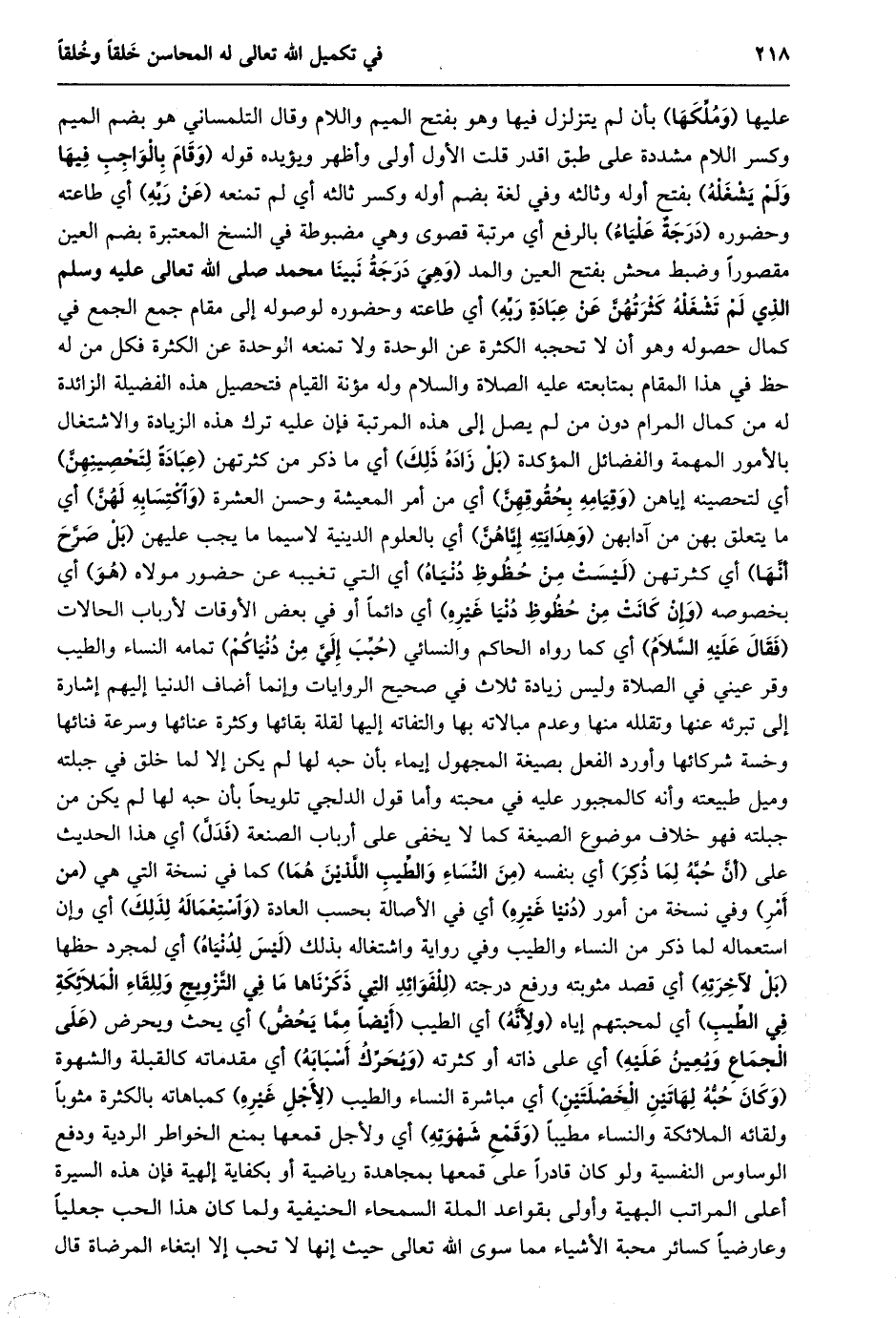 عليها (وملّكها) بأن لم يتزلزل فيها وهو بفتح الميم واللام وقال التلمساني هو بضم الميم وكسر اللام مشددة على طبق اقدر قلت الأول أولى وأظهر ويؤيده قوله (وقام بالواجب فيها ولم يشغله) بفتح أوله وثالثه وفي لغة بضم أوله وكسر ثالثه أي لم تمنعه (عن ربّه) أي طاعته وحضوره (درجة علياء) بالرفع أي مرتبة قصوى وهي مضبوطة في النسخ المعتبرة بضم العين مقصورا وضبط محش بفتح العين والمد (وهي درجة نبينا محمد صلى الله تعالى عَلَيْهِ وَسَلَّمَ الَّذِي لَمْ تَشْغَلْهُ كَثْرَتُهُنَّ عَنْ عبادة ربّه) أي طاعته وحضوره لوصوله إلى مقام جمع الجمع في كمال حصوله وهو أن لا تحجبه الكثرة عن الوحدة ولا تمنعه الوحدة عن الكثرة فكل من له حظ في هذا المقام بمتابعته عليه الصلاة والسلام وله مؤنة القيام فتحصيل هذه الفضيلة الزائدة له من كمال المرام دون من لم يصل إلى هذه المرتبة فإن عليه ترك هذه الزيادة والاشتغال بالأمور المهمة والفضائل المؤكدة (بل زاده ذلك) أي ما ذكر من كثرتهن (عبادة لتحصينهنّ) أي لتحصينه إياهن (وقيامه بحقوقهنّ) أي من أمر المعيشة وحسن العشرة (واكتسابه لهنّ) أي ما يتعلق بهن من آدابهن (وهدايته إيّاهنّ) أي بالعلوم الدينية لا سيما ما يجب عليهن (بل صرّح أنّها) أي كثرتهن (ليست من حظوظ دنياه) أي التي تغيبه عن حضور مولاه (هو) أي بخصوصه (وإن كانت من حظوظ دنيا غيره) أي دائما أو في بعض الأوقات لأرباب الحالات (فقال عليه السّلام) أي كما رواه الحاكم والنسائي (حبّب إليّ من دنياكم) تمامه النساء والطيب وقر عيني في الصلاة وليس زيادة ثلاث في صحيح الروايات وإنما أضاف الدنيا إليهم إشارة إلى تبرئه عنها وتقلله منها وعدم مبالاته بها والتفاته إليها لقلة بقائها وكثرة عنائها وسرعة فنائها وخسة شركائها وأورد الفعل بصيغة المجهول إيماء بأن حبه لها لم يكن إلا لما خلق في جبلته وميل طبيعته وأنه كالمجبور عليه في محبته وأما قول الدلجي تلويحا بأن حبه لها لم يكن من جبلته فهو خلاف موضوع الصيغة كما لا يخفى على أرباب الصنعة (فدلّ) أي هذا الحديث على (أنّ حبّه لما ذكر) أي بنفسه (من النّساء والطّيب اللّذين هما) كما في نسخة التي هي (من أمر) وفي نسخة من أمور (دنيا غيره) أي في الأصالة بحسب العادة (واستعماله لذلك) أي وإن استعماله لما ذكر من النساء والطيب وفي رواية واشتغاله بذلك (ليس لدنياه) أي لمجرد حظها (بل لآخرته) أي قصد مثوبته ورفع درجته (للفوائد التي ذكرناها ما في التّزويج وللقاء الملائكة في الطّيب) أي لمحبتهم إياه (ولأنّه) أي الطيب (أيضا ممّا يحضّ) أي يحث ويحرض (على الجماع ويعين عليه) أي على ذاته أو كثرته (ويحرّك أسبابه) أي مقدماته كالقبلة والشهوة (وكان حبّه لهاتين الخصلتين) أي مباشرة النساء والطيب (لأجل غيره) كمباهاته بالكثرة مثوبا ولقائه الملائكة والنساء مطيبا (وقمع شهوته) أي ولأجل قمعها بمنع الخواطر الردية ودفع الوساوس النفسية ولو كان قادرا على قمعها بمجاهدة رياضية أو بكفاية إلهية فإن هذه السيرة أعلى المراتب البهية وأولى بقواعد الملة السمحاء الحنيفية ولما كان هذا الحب جعليا وعارضيا كسائر محبة الأشياء مما سوى الله تعالى حيث إنها لا تحب إلا ابتغاء المرضاة قال