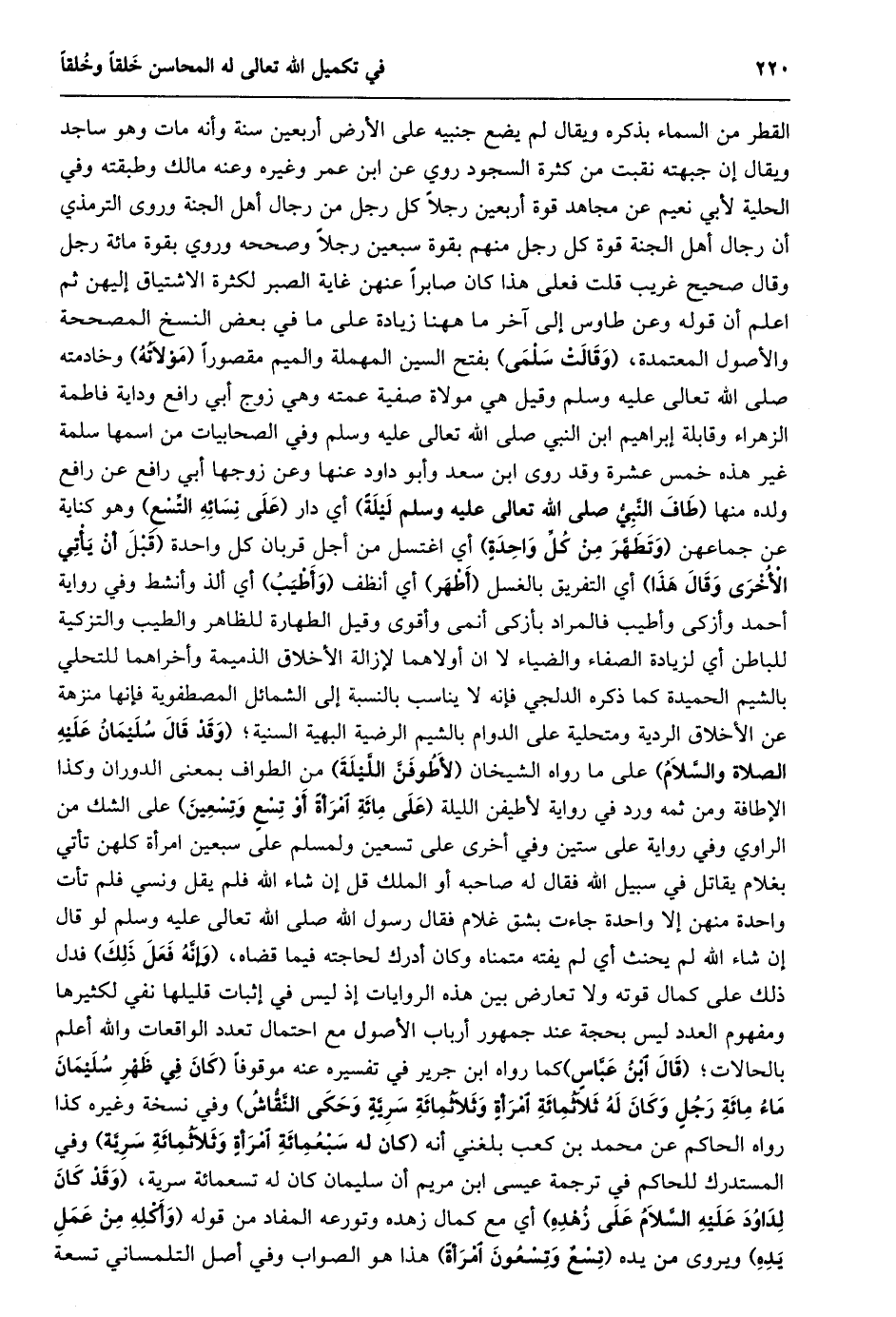 القطر من السماء بذكره ويقال لم يضع جنبيه على الأرض أربعين سنة وأنه مات وهو ساجد ويقال إن جبهته نقبت من كثرة السجود روي عن ابن عمر وغيره وعنه مالك وطبقته وفي الحلية لأبي نعيم عن مجاهد قوة أربعين رجلا كل رجل من رجال أهل الجنة وروى الترمذي أن رجال أهل الجنة قوة كل رجل منهم بقوة سبعين رجلا وصححه وروي بقوة مائة رجل وقال صحيح غريب قلت فعلى هذا كان صابرا عنهن غاية الصبر لكثرة الاشتياق إليهن ثم اعلم أن قوله وعن طاوس إلى آخر ما ههنا زيادة على ما في بعض النسخ المصححة والأصول المعتمدة، (وقالت سلمى) بفتح السين المهملة والميم مقصورا (مولاته) وخادمته صلى الله تعالى عليه وسلم وقيل هي مولاة صفية عمته وهي زوج أبي رافع وداية فاطمة الزهراء وقابلة إبراهيم ابن النبي صلى الله تعالى عليه وسلم وفي الصحابيات من اسمها سلمة غير هذه خمس عشرة وقد روى ابن سعد وأبو داود عنها وعن زوجها أبي رافع عن رافع ولده منها (طاف النّبيّ صلى الله تعالى عليه وسلم ليلة) أي دار (على نسائه التّسع) وهو كناية عن جماعهن (وتطهّر من كلّ واحدة) أي اغتسل من أجل قربان كُلِّ وَاحِدَةٍ (قَبْلَ أَنْ يَأْتِيَ الْأُخْرَى وَقَالَ هذا) أي التفريق بالغسل (أطهر) أي أنظف (وأطيب) أي ألذ وأنشط وفي رواية أحمد وأزكى وأطيب فالمراد بأزكى أنمى وأقوى وقيل الطهارة للظاهر والطيب والتزكية للباطن أي لزيادة الصفاء والضياء لا ان أولاهما لإزالة الأخلاق الذميمة وأخراهما للتحلي بالشيم الحميدة كما ذكره الدلجي فإنه لا يناسب بالنسبة إلى الشمائل المصطفوية فإنها منزهة عن الأخلاق الردية ومتحلية على الدوام بالشيم الرضية البهية السنية؛ (وقد قال سليمان عليه الصلاة والسّلام) على ما رواه الشيخان (لأطوفنّ اللّيلة) من الطواف بمعنى الدوران وكذا الإطافة ومن ثمه ورد في رواية لأطيفن اللَّيْلَةَ (عَلَى مِائَةِ امْرَأَةٍ أَوْ تِسْعٍ وَتِسْعِينَ) على الشك من الراوي وفي رواية على ستين وفي أخرى على تسعين ولمسلم على سبعين امرأة كلهن تأتي بغلام يقاتل في سبيل الله فقال له صاحبه أو الملك قل إن شاء الله فلم يقل ونسي فلم تأت واحدة منهن إلا واحدة جاءت بشق غلام فقال رسول الله صلى الله تعالى عليه وسلم لو قال إن شاء الله لم يحنث أي لم يفته متمناه وكان أدرك لحاجته فيما قضاه، (وإنّه فعل ذلك) فدل ذلك على كمال قوته ولا تعارض بين هذه الروايات إذ ليس في إثبات قليلها نفي لكثيرها ومفهوم العدد ليس بحجة عند جمهور أرباب الأصول مع احتمال تعدد الواقعات والله أعلم بالحالات؛ (قال ابن عبّاس) كما رواه ابن جرير في تفسيره عنه موقوفا (كَانَ فِي ظَهْرِ سُلَيْمَانَ مَاءُ مِائَةِ رَجُلٍ وكان لَهُ ثَلَاثُمِائَةِ امْرَأَةٍ وَثَلَاثُمِائَةِ سَرِيَّةٍ وَحَكَى النَّقَّاشُ) وفي نسخة وغيره كذا رواه الحاكم عن محمد بن كعب بلغني أنه (كان له سبعمائة امرأة وثلاثمائة سريّة) وفي المستدرك للحاكم في ترجمة عيسى ابن مريم أن سليمان كان له تسعمائة سَرِيَّةٍ، (وَقَدْ كَانَ لِدَاوُدَ عَلَيْهِ السَّلَامُ عَلَى زهده) أي مع كمال زهده وتورعه المفاد من قوله (وأكله من عمل يده) ويروى من يده (تسع وتسعون امرأة) هذا هو الصواب وفي أصل التلمساني تسعة