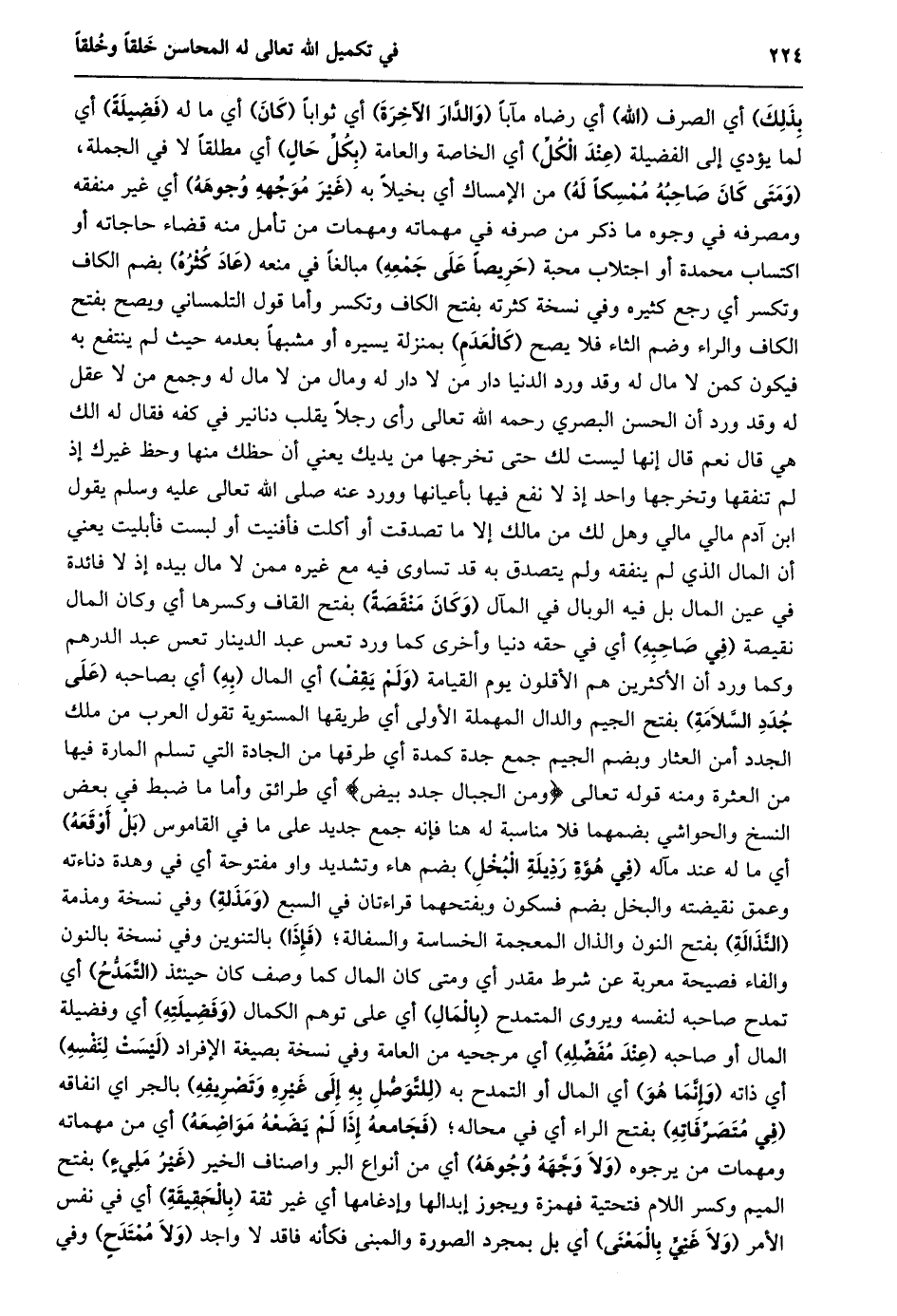 بذلك) أي الصرف (الله) أي رضاه مآبا (والدّار الآخرة) أي ثوابا (كان) أي ما له (فضيلة) أي لما يؤدي إلى الفضيلة (عند الكلّ) أي الخاصة والعامة (بكلّ حال) أي مطلقا لا في الجملة، (ومتى كان صاحبه ممسكا له) من الإمساك أي بخيلا به (غير موجّهه وجوهه) أي غير منفقه ومصرفه في وجوه ما ذكر من صرفه في مهماته ومهمات من تأمل منه قضاء حاجاته أو اكتساب محمدة أو اجتلاب محبة (حريصا على جمعه) مبالغا في منعه (عاد كثره) بضم الكاف وتكسر أي رجع كثيره وفي نسخة كثرته بفتح الكاف وتكسر وأما قول التلمساني ويصح بفتح الكاف والراء وضم الثاء فلا يصح (كالعدم) بمنزلة يسيره أو مشبها بعدمه حيث لم ينتفع به فيكون كمن لا مال له وقد ورد الدُّنْيَا دَارُ مَنْ لَا دَارَ لَهُ وَمَالُ من لا مال له وجمع من لا عقل له وقد ورد أن الحسن البصري رحمه الله تعالى رأى رجلا يقلب دنانير في كفه فقال له الك هي قال نعم قال إنها ليست لك حتى تخرجها من يديك يعني أن حظك منها وحظ غيرك إذ لم تنفقها وتخرجها واحد إذ لا نفع فيها بأعيانها وورد عنه صلى الله تعالى عليه وسلم يقول ابن آدم مالي مالي وهل لك من مالك إلا ما تصدقت أو أكلت فأفنيت أو لبست فأبليت يعني أن المال الذي لم ينفقه ولم يتصدق به قد تساوى فيه مع غيره ممن لا مال بيده إذ لا فائدة في عين المال بل فيه الوبال في المآل (وكان منقصة) بفتح القاف وكسرها أي وكان المال نقيصة (في صاحبه) أي في حقه دنيا وأخرى كما ورد تعس عبد الدينار تعس عبد الدرهم وكما ورد أن الأكثرين هم الأقلون يوم القيامة (ولم يقف) أي المال (به) أي بصاحبه (على جدد السّلامة) بفتح الجيم والدال المهملة الأولى أي طريقها المستوية تقول العرب من ملك الجدد أمن العثار وبضم الجيم جمع جدة كمدة أي طرقها من الجادة التي تسلم المارة فيها من العثرة ومنه قوله تعالى وَمِنَ الْجِبالِ جُدَدٌ بِيضٌ أي طرائق وأما ما ضبط في بعض النسخ والحواشي بضمهما فلا مناسبة له هنا فإنه جمع جديد على ما في القاموس (بل أوقعه) أي ما له عند مآله (في هوّة رذيلة البخل) بضم هاء وتشديد واو مفتوحة أي في وهدة دناءته وعمق نقيضته والبخل بضم فسكون وبفتحهما قراءتان في السبع (ومذلة) وفي نسخة ومذمة (النّذالة) بفتح النون والذال المعجمة الخساسة والسفالة؛ (فإذا) بالتنوين وفي نسخة بالنون والفاء فصيحة معربة عن شرط مقدر أي ومتى كان المال كما وصف كان حينئذ (التّمدّح) أي تمدح صاحبه لنفسه ويروى المتمدح (بالمال) أي على توهم الكمال (وفضيلته) أي وفضيلة المال أو صاحبه (عند مفضّله) أي مرجحيه من العامة وفي نسخة بصيغة الإفراد (ليست لنفسه) أي ذاته (وإنّما هو) أي المال أو التمدح به (للتّوصّل به إلى غيره وتصريفه) بالجر اي انفاقه (في متصرّفاته) بفتح الراء أي في محاله؛ (فجامعه إذا لم يضعه مواضعه) أي من مهماته ومهمات من يرجوه (ولا وجّهه وجوهه) أي من أنواع البر واصناف الخير (غير مليء) بفتح الميم وكسر اللام فتحتية فهمزة ويجوز إبدالها وإدغامها أي غير ثقة (بالحقيقة) أي في نفس الأمر (ولا غنيّ بالمعنى) أي بل بمجرد الصورة والمبنى فكأنه فاقد لا واجد (ولا ممتدح) وفي