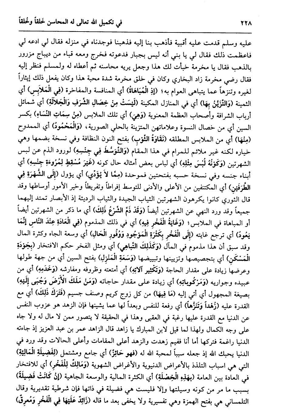 عليه وسلم قدمت عليه أقبية فأذهب بنا إليه فذهبنا فوجدناه في منزله فقال لي ادعه لي فاعظمت ذلك فقال لي يا بني أنه ليس بجبار فدعوته فخرج ومعه قباء من ديباج مزرور بالذهب فقال يا مخرمة خبأت لك هذا وجعل يريه محاسنه ثم أعطاه له ولمسلم فنظر إليه فقال رضي مخرمة زاد البخاري وكان في خلق مخرمة شدة محبة هذا وكان يفعل ذلك إيثارا لغيره وتنزها عما يتباهى العوام به؛ (إذ المباهاة) أي المنافسة والمفاخرة (في الملابس) أي الثمينة (والتّزيّن بها) أي في المنازل المكينة (ليست من خصال الشّرف والجلالة) أي شمائل أرباب الشرافة وأصحاب العظمة المعنوية (وهي) أي تلك الملابس (من سمات النّساء) بكسر السين أي من خصال النسوة وعلاماتهن المتزينة بالحلي الصورية، (والمحمود) أي الممدوح (منها) أي من الملابس المطلقه (نقاوة الثّوب) بفتح النون النظافة وفي نسخة بضمها وهي خياره لكنه غير ملائم للمرام في هذا المقام (والتّوسّط في جنسه) لورود الذم عن لبس الشهرتين (وكونه لبس مثله) أي لباس بعض أمثاله حال كونه (غير مسقط لمروءة جنسه) أي أبناء جنسه وفي نسخة حسبه بفتحتين فموحدة (ممّا لا يؤدّي) أي يؤول (إلى الشّهرة في الطّرفين) أي المكتنفين من الأعلى والأدنى للتوسط إفراطا وتفريطا وخير الأمور أوساطها وقد قال الثوري كانوا يكرهون الشهرتين الثياب الجيدة والثياب الرديئة إذ الأبصار تمتد إليهما جميعا وقد ورد النهي عن الشهرتين أيضا (وقد ذمّ الشّرع ذلك) أي ما ذكر من الشهرتين أيضا أو المباهاة في الملابس؛ (وغاية الفخر فيه) أي في ذلك المذموم (في العادة عند النّاس إنّما يعود) أي ترجع غايته (إلى الفخر بكثرة الموجود ووفور الحال) أي وسعة الجاه وكثرة المال وقد سبق أن هذا مذموم في المآل (وكذلك التّباهي) أي ومثل الفخر حكم الافتخار (بجودة المسكن) أي بتجصيصها وتزيينها وتبييضها (وسعة المنزل) بفتح السين أي من جهة طولها وعرضها زيادة على مقدار الحاجة (وتكثير آلاته) أي أمتعته وظروفه ومفارشه (وخدمه) أي من عبيده وجواريه (ومركوباته) أي زيادة على مقدار حاجاته (ومن ملك الأرض وجبى إليه) بصيغة المجهول أي أتي إليه (ما فيها) من كل زوج كريم وصنف جسيم (فترك ذلك) أي مع القدرة عليه (زهدا وتنزّها) أي رفعة للنفس وبعدا لها عما يشينها فإن الزهد هو عزوب النفس عن الدنيا مع القدرة عليها رغبة في العقبى وهذا في الحقيقة لا يتصور ممن لا مال له ولا جاه على وجه الكمال ولهذا لما قيل لابن المبارك يا زاهد قال الزاهد عمر بن عبد العزيز إذ جاءته الدنيا راغمة فتركها أما أنا ففيم زهدت والزهد أعلى المقامات وأعلى الحالات وقد ورد في الدنيا يحبك الله إذ جعله سببا لمحبة الله له (فهو حائز) أي جامع ومشتمل (لفضيلة الماليّة) التي هي اسباب التلذذ بالأعراض الدنيوية والأغراض الشهوية (ومالك للفخر) أي للافتخار في العادة بين العامة (بهذه الخصلة) أي الكثرة المالية والوسعة الجاهية (إن كانت فضيلة) بسبب ما مر من كونه وسيلتها وإلا فليست هي فضيلة في ذاتها فإن شرطية تقديرية وقال التلمساني هي بفتح الهمزة وهي تفسيرية ولا يخفى بعد ما قاله (زائد عليها في الفخر ومعرق)
