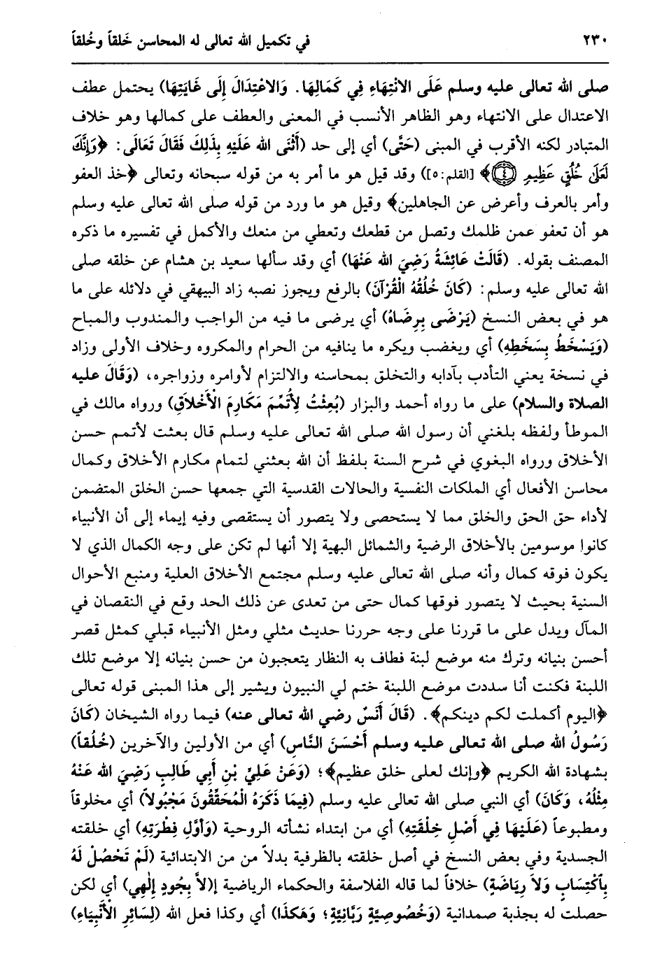 صلى الله تعالى عَلَيْهِ وَسَلَّمَ عَلَى الِانْتِهَاءِ فِي كَمَالِهَا. وَالِاعْتِدَالِ إلى غايتها) يحتمل عطف الاعتدال على الانتهاء وهو الظاهر الأنسب في المعنى والعطف على كمالها وهو خلاف المتبادر لكنه الأقرب في المبنى (حتّى) أي إلى حد (أثنى الله عليه بذلك فَقَالَ تَعَالَى: وَإِنَّكَ لَعَلى خُلُقٍ عَظِيمٍ (4) [الْقَلَمِ: 5] ) وقد قيل هو ما أمر به من قوله سبحانه وتعالى خُذِ الْعَفْوَ وَأْمُرْ بِالْعُرْفِ وَأَعْرِضْ عَنِ الْجاهِلِينَ وقيل هو ما ورد من قوله صلى الله تعالى عليه وسلم هو أن تعفو عمن ظلمك وتصل من قطعك وتعطي من منعك والأكمل في تفسيره ما ذكره المصنف بقوله. (قالت عائشة رضي الله عنها) أي وقد سألها سعيد بن هشام عن خلقه صلى الله تعالى عليه وسلم: (كان خلقه القرآن) بالرفع ويجوز نصبه زاد البيهقي في دلائله على ما هو في بعض النسخ (يرضى برضاه) أي يرضى ما فيه من الواجب والمندوب والمباح (ويسخط بسخطه) أي ويغضب ويكره ما ينافيه من الحرام والمكروه وخلاف الأولى وزاد في نسخة يعني التأدب بآدابه والتخلق بمحاسنه والالتزام لأوامره وزواجره، (وقال عليه الصلاة والسلام) على ما رواه أحمد والبزار (بعثت لأتمّم مكارم الأخلاق) ورواه مالك في الموطأ ولفظه بلغني أن رسول الله صلى الله تعالى عليه وسلم قال بعثت لأتمم حسن الأخلاق ورواه البغوي في شرح السنة بلفظ أن الله بعثني لتمام مكارم الأخلاق وكمال محاسن الأفعال أي الملكات النفسية والحالات القدسية التي جمعها حسن الخلق المتضمن لأداء حق الحق والخلق مما لا يستحصى ولا يتصور أن يستقصى وفيه إيماء إلى أن الأنبياء كانوا موسومين بالأخلاق الرضية والشمائل البهية إلا أنها لم تكن على وجه الكمال الذي لا يكون فوقه كمال وأنه صلى الله تعالى عليه وسلم مجتمع الأخلاق العلية ومنبع الأحوال السنية بحيث لا يتصور فوقها كمال حتى من تعدى عن ذلك الحد وقع في النقصان في المآل ويدل على ما قررنا على وجه حررنا حديث مثلي ومثل الأنبياء قبلي كمثل قصر أحسن بنيانه وترك منه موضع لبنة فطاف به النظار يتعجبون من حسن بنيانه إلا موضع تلك اللبنة فكنت أنا سددت موضع اللبنة ختم لي النبيون ويشير إلى هذا المبنى قوله تعالى الْيَوْمَ أَكْمَلْتُ لَكُمْ دِينَكُمْ. (قال أنس رضي الله تعالى عنه) فيما رواه الشيخان (كان رسول الله صلى الله تعالى عليه وسلم أحسن النّاس) أي من الأولين والآخرين (خلقا) بشهادة الله الكريم وَإِنَّكَ لَعَلى خُلُقٍ عَظِيمٍ؛ (وَعَنْ عَلِيِّ بْنِ أَبِي طَالِبٍ رَضِيَ اللَّهُ عنه مثله، وكان) أي النبي صلى الله تعالى عليه وسلم (فيما ذكره المحقّقون مجبولا) أي مخلوقا ومطبوعا (عليها في أصل خلقته) أي من ابتداء نشأته الروحية (وأوّل فطرته) أي خلقته الجسدية وفي بعض النسخ في أصل خلقته بالظرفية بدلا من من الابتدائية (لم تحصل له باكتساب ولا رياضة) خلافا لما قاله الفلاسفة والحكماء الرياضيةإ (لّا بجود إلهي) أي لكن حصلت له بجذبة صمدانية (وخصوصيّة ربّانيّة؛ وهكذا) أي وكذا فعل الله (لسائر الأنبياء)