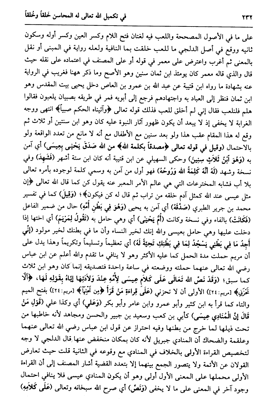 على ما في الأصول المصححة واللعب فيه لغتان فتح اللام وكسر العين وكسر أوله وسكون ثانيه ووقع في أصل الدلجي ما للعب خلقت بما النافية ولعله رواية في المبنى أو نقل بالمعنى ثم أغرب واعترض على معمر في قوله أو على المصنف في اعتماده على نقله حيث قال والذي قاله معمر كان يومئذ ابن ثمان سنين وهو الأصح وما ذكر ههنا فغريب في الرواية عنه بشهادة ما رواه ابن قتيبة عَنْ عَبْدِ اللَّهِ بْنِ عَمْرِو بْنِ الْعَاصِ دخل يحيى بيت المقدس وهو ابن ثمان فنظر إلى العباد به واجتهادهم فرجع إلى أبويه فمر في طريقه بصبيان يلعبون فقالوا هلم فلنلعب فقال إني لم أخلق للعب فذلك قوله تعالى وَآتَيْناهُ الْحُكْمَ صَبِيًّا انتهى ووجه الغرابة لا يخفى إذ لا يبعد أن يكون ظهور آثار النبوة عليه كان وهو ابن سنتين أو ثلاث ثم وقع له هذا المقام عقب هذا ولو بعد سنين مع الأطفال مع أنه لا مانع من تعدد الواقعة ولو بالاحتمال (وقيل في قوله تعالى مُصَدِّقاً بِكَلِمَةٍ مِنَ اللَّهِ من الله صدق يحيى بعيسى) أي آمن به (وهو ابن ثلاث سنين) وحكى السهيلي عن ابن قتيبة أنه كان ابن ستة أشهر (فشهد) وفي نسخة وشهد (له أنّه كلمة الله وروحه) فهو أول من آمن به وسمي كلمة لوجوده بأمره تعالى بلا أب فشابه المخترعات التي هي عالم الأمر المعبر عنه يقول كن كما قال الله تعالى إِنَّ مَثَلَ عِيسى عِنْدَ اللَّهِ كَمَثَلِ آدَمَ خَلَقَهُ مِنْ تُرابٍ ثُمَّ قالَ لَهُ كُنْ فَيَكُونُ؛ (وقيل) كما في تفسير محمد بن جرير الطبري (صدّقه) أي آمن به يحيى (وهو في بطن أمّه) حال من ضمير الفاعل (فكانت) بالفاء وفي نسخة وكانت (أمّ يحيى) أي وهي حامل به (تقول لمريم) أي اختها إذا دخلت عليها وهي حامل بعيسى والله إنك لخير النساء وأن ما في بطنك لخير مولود (إِنِّي أَجِدُ مَا فِي بَطْنِي يَسْجُدُ لِمَا في بطنك تحيّة له) أي تعظيما وتسليما وتكريما وهذا يدل على أن مريم حملت مدة الحمل كما عليه الأكثر وهو لا ينافي ما تقدم والله أعلم عن ابن عباس رضي الله تعالى عنهما حملته ووضعته في ساعة واحدة فتصديقه إنما كان وهو ابن ثلاث كما سبق؛ (وَقَدْ نَصَّ اللَّهُ تَعَالَى عَلَى كَلَامِ عِيسَى لِأُمِّهِ عِنْدَ وِلَادَتِهَا إِيَّاهُ بِقَوْلِهِ لَهَا، أَلَّا تَحْزَنِي [مريم: 24] ) الأولى أن لا تحزني (على قراءة من قرأ مِنْ تَحْتِها [مريم: 24] بفتح الميم والتاء كما قرأ به ابن كثير وأبو عمرو وابن عامر وأبو بكر (وعلي) أي وكذا علي (قول من قال إنّ المنادي عيسى) كأبي بن كعب وسعيد بن جبير والحسن ومجاهد لأنه خاطبها من تحت ذيلها لما خرج من بطنها وفيه احتراز عن قول ابن عباس رضي الله تعالى عنهما وعلقمة والضحاك أن المنادي جبريل لأنه كان بمكان منخفض عنها قال الدلجي لا وجه لتخصيص القراءة الأولى بالخلاف في المنادي مع وقوعه في الثانية قلت حيث تعارض القولان عن الأئمة ولا يتصور الجمع بينهما إلا بتعدد القضية أشار المصنف إلى أن القراءة الأولى محملها على المعنى الأول أولى وهو أن يكون المنادي عيسى فلا ينافي احتمال وجود آخر في المعنى على ما لا يخفى (ونصّ) أي صرح الله سبحانه وتعالى (على كلامه)