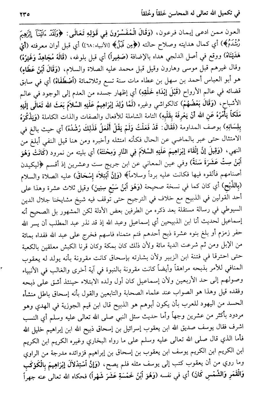 العون ممن ادعى إيمان فرعون، (وَقَالَ الْمُفَسِّرُونَ فِي قَوْلِهِ تَعَالَى: وَلَقَدْ آتَيْنا إِبْراهِيمَ رُشْدَهُ) أي كمال هدايته وصلاح حالته (مِنْ قَبْلُ [الأنبياء: 68] ) أي قبل أوان معرفته (أي هديناه) ووقع في أصل الدلجي هداه بالإضافة (صغيرا) أي قبل بلوغه، (قاله مجاهد وغيره) وقال غيرهم قبل موسى وهارون وقيل قبل محمد عليه الصلاة والسلام، (وقال ابن عطاء) هو أبو العباس أحمد بن سهل بن عطاء مات سنة تسع وثلاثمائة (اصطفاه) أي في سابق قضائه في عالم الأرواح (قبل إبداء خلقه) أي إظهار جسده من العدم إلى الوجود في عالم الأشباح، (وقال بعضهم) كالكواشي وغيره (لَمَّا وُلِدَ إِبْرَاهِيمُ عَلَيْهِ السَّلَامُ بَعَثَ اللَّهُ تَعَالَى إِلَيْهِ مَلَكًا يَأْمُرُهُ عَنِ اللَّهِ أَنْ يعرفه بقلبه) التامة الشاملة للأفعال والصفات والذات الكاملة (ويذكره بلسانه) بوصف المداومة (فَقَالَ: قَدْ فَعَلْتُ وَلَمْ يَقُلْ أَفْعَلُ فَذَلِكَ رشده) أي حيث بالغ في الامتثال حتى عبر بالماضي عن الحال فكأنه امتثله وأخبره ومن هنا قيل النفي أبلغ من النهي، (وَقِيلَ إِنَّ إِلْقَاءَ إِبْرَاهِيمَ عَلَيْهِ السَّلَامُ فِي النّار ومحنته) أي بليته من نمرود (كانت وهو ابن ستّ عشرة سنة) وفي عين المعاني عن ابن جريج ست وعشرين إذ أقسم (ليكيدن أصنامهم فألقوه فيها فكانت عليه بردا وسلاما) (وإنّ ابتلاء إسحاق) عليه الصلاة والسلام (بالذّبح) أي كان كما في نسخة صحيحة (وهو ابن سبع سنين) وقيل ثلاث عشرة وهذا على أحد القولين في الذبيح مع خلاف في الترجيح حتى توقف فيه شيخ مشايخنا جلال الدين السيوطي في رسالة مستقلة بعد ذكره من الطرفين بعض الأدلة لكن المشهور بل الصحيح أنه إسماعيل لحديث أنا ابن الذبيحين أي إسماعيل وعبد الله إذ قد نذر عبد المطلب أن يسر الله حفر زمزم أو بلغ بنوه عشرة ذبح أحدهم فتم متمناه فاسهم فخرج على عبد الله ففداه بمائة من الإبل ومن ثم شرعت الدية مائة ولأن ذلك كان بمكة وكان قرنا الكبش معلقين بالكعبة حتى احترقا في فتنة ابن الزبير ولأن بشارته بإسحاق كانت مقرونة بأنه يولد له يعقوب المنافي للأمر بذبحه مراهقا وأيضا كانت مقرونة بالنبوة في آية أخرى والغالب في الأنبياء وصولهم إلى حد الأربعين ولأن إسماعيل كان أول ولده الابتلاء حينئذ أشق على ذبحه وفقده قيل وهذا هو الصواب عند علماء الصحابة والتابعين والقول بأنه إسحاق باطل منشأه الحسد من اليهود للعرب بأن يكون أبوهم هو الذبيح قال ابن قيم الجوزية في الهدي وهو مردود بأكثر من عشرين وجها وأما حديث سئل النبي صلى الله تعالى عليه وسلم أي النسب اشرف فقال يوسف صديق الله ابن يعقوب إسرائيل بن إسحاق ذبيح الله ابن إبراهيم خليل الله فأما الذي قال صلى الله تعالى عليه وسلم على ما رواه البخاري وغيره الْكَرِيمُ ابْنُ الْكَرِيمِ ابْنُ الْكَرِيمِ ابْنُ الْكَرِيمِ يوسف ابن يعقوب بن إسحاق بن إبراهيم فزوائده مدرجة من الراوي وما روي من أن يعقوب كتب إلى يوسف مثله فلم يصح، (وَإِنَّ اسْتِدْلَالَ إِبْرَاهِيمَ بِالْكَوْكَبِ وَالْقَمَرِ وَالشَّمْسِ كَانَ) أي في نفسه (وهو ابن خمسة عشر شهرا) فحكاه الله تعالى عنه جهرا