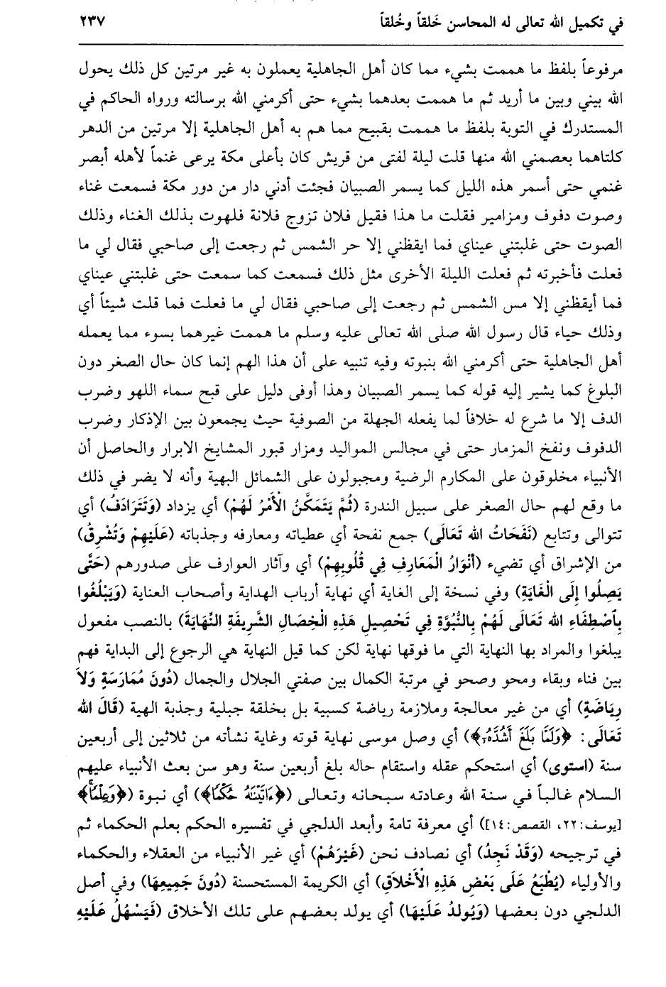 مرفوعا بلفظ مَا هَمَمْتُ بِشَيْءٍ مِمَّا كَانَ أَهْلُ الْجَاهِلِيَّةِ يَعْمَلُونَ بِهِ غَيْرَ مَرَّتَيْنِ كُلُّ ذَلِكَ يَحُولُ الله بيني وبين ما أريد ثم ما هممت بعدهما بشيء حتى أكرمني الله برسالته ورواه الحاكم في المستدرك في التوبة بلفظ ما هممت بقبيح مما هم به أهل الجاهلية إلا مرتين من الدهر كلتاهما بعصمني الله منها قلت ليلة لفتى من قريش كان بأعلى مكة يرعى غنما لأهله أبصر غنمي حتى أسمر هذه الليل كما يسمر الصبيان فجئت أدني دار من دور مكة فسمعت غناء وصوت دفوف ومزامير فقلت ما هذا فقيل فلان تزوج فلانة فلهوت بذلك الغناء وذلك الصوت حتى غلبتني عيناي فما ايقظني إلا حر الشمس ثم رجعت إلى صاحبي فقال لي ما فعلت فأخبرته ثم فعلت الليلة الأخرى مثل ذلك فسمعت كما سمعت حتى غلبتني عيناي فما أيقظني إلا مس الشمس ثم رجعت إلى صاحبي فقال لي ما فعلت فما قلت شيئا أي وذلك حياء قال رسول الله صلى الله تعالى عليه وسلم ما هممت غيرهما بسوء مما يعمله أهل الجاهلية حتى أكرمني الله بنبوته وفيه تنبيه على أن هذا الهم إنما كان حال الصغر دون البلوغ كما يشير إليه قوله كما يسمر الصبيان وهذا أوفى دليل على قبح سماء اللهو وضرب الدف إلا ما شرع له خلافا لما يفعله الجهلة من الصوفية حيث يجمعون بين الإذكار وضرب الدفوف ونفخ المزمار حتى في مجالس المواليد ومزار قبور المشايخ الابرار والحاصل أن الأنبياء مخلوقون على المكارم الرضية ومجبولون على الشمائل البهية وأنه لا يضر في ذلك ما وقع لهم حال الصغر على سبيل الندرة (ثمّ يتمكّن الأمر لهم) أي يزداد (وتترادف) أي تتوالى وتتابع (نفحات الله تعالى) جمع نفحة أي عطياته ومعارفه وجذباته (عليهم وتشرق) من الإشراق أي تضيء (أنوار المعارف في قلوبهم) أي وآثار العوارف على صدورهم (حتّى يصلوا إلى الغاية) وفي نسخة إلى الغاية أي نهاية أرباب الهداية وأصحاب العناية (وَيَبْلُغُوا بِاصْطِفَاءِ اللَّهِ تَعَالَى لَهُمْ بِالنُّبُوَّةِ فِي تحصيل هذه الخصال الشّريفة النّهاية) بالنصب مفعول يبلغوا والمراد بها النهاية التي ما فوقها نهاية لكن كما قيل النهاية هي الرجوع إلى البداية فهم بين فناء وبقاء ومحو وصحو في مرتبة الكمال بين صفتي الجلال والجمال (دون ممارسة ولا رياضة) أي من غير معالجة وملازمة رياضة كسبية بل بخلقة جبلية وجذبة الهية (قال الله تعالى: وَلَمَّا بَلَغَ أَشُدَّهُ) أي وصل موسى نهاية قوته وغاية نشأته من ثلاثين إلى أربعين سنة (استوى) أي استحكم عقله واستقام حاله بلغ أربعين سنة وهو سن بعث الأنبياء عليهم السلام غالبا في سنة الله وعادته سبحانه وتعالى (آتَيْناهُ حُكْماً) أي نبوة (وَعِلْماً [يوسف: 22، القصص: 14] ) أي معرفة تامة وأبعد الدلجي في تفسيره الحكم بعلم الحكماء ثم في ترجيحه (وقد نجد) أي نصادف نحن (غيرهم) أي غير الأنبياء من العقلاء والحكماء والأولياء (يطبع على بعض هذه الأخلاق) أي الكريمة المستحسنة (دون جميعها) وفي أصل الدلجي دون بعضها (ويولد عليها) أي يولد بعضهم على تلك الأخلاق (فيسهل عليه