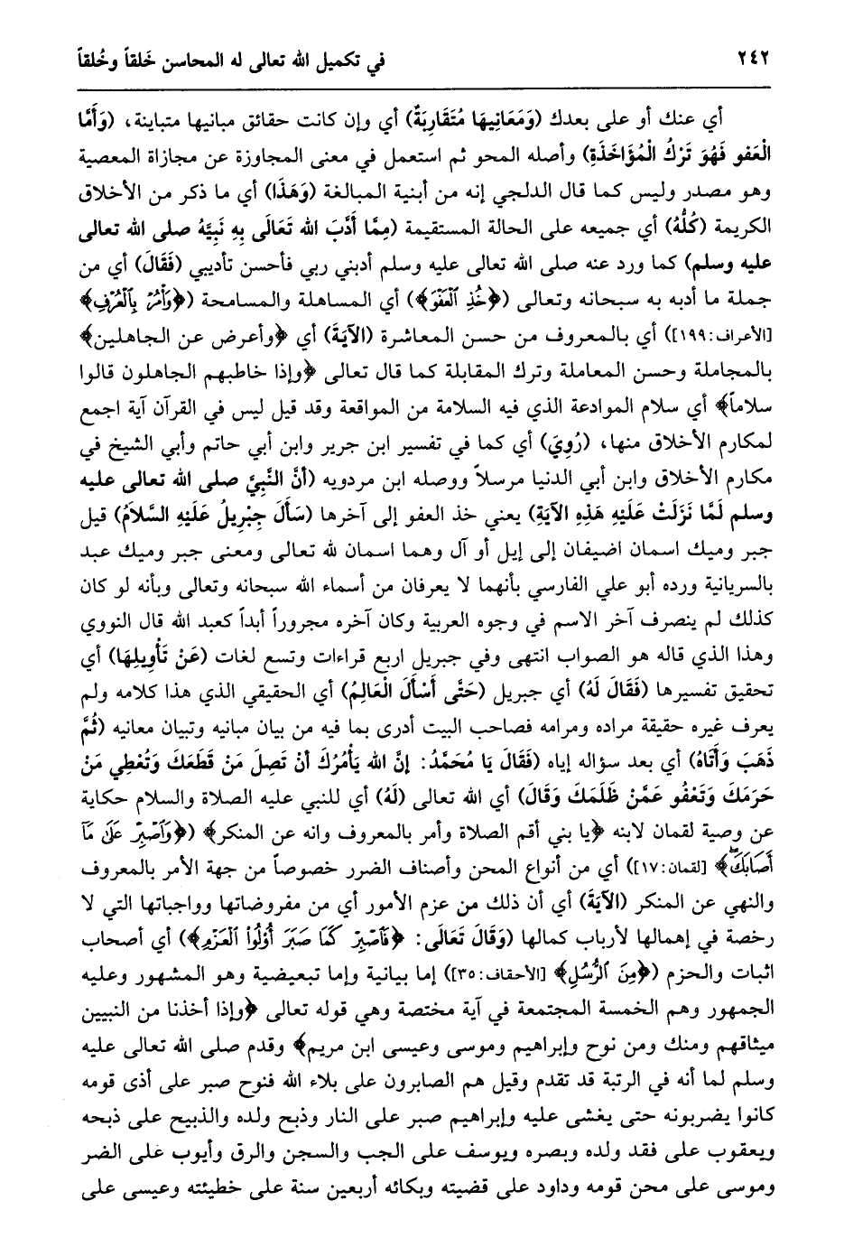 أي عنك أو على بعدك (ومعانيها متقاربة) أي وإن كانت حقائق مبانيها متباينة، (وأمّا العفو فهو ترك المؤاخذة) وأصله المحو ثم استعمل في معنى المجاوزة عن مجازاة المعصية وهو مصدر وليس كما قال الدلجي إنه من أبنية المبالغة (وهذا) أي ما ذكر من الأخلاق الكريمة (كلّه) أي جميعه على الحالة المستقيمة (مِمَّا أَدَّبَ اللَّهُ تَعَالَى بِهِ نَبِيَّهُ صَلَّى الله تعالى عليه وسلم) كما ورد عنه صلى الله تعالى عليه وسلم أدبني ربي فأحسن تأديبي (فقال) أي من جملة ما أدبه به سبحانه وتعالى (خُذِ الْعَفْوَ) أي المساهلة والمسامحة (وَأْمُرْ بِالْعُرْفِ [الأعراف: 199] ) أي بالمعروف من حسن المعاشرة (الآية) أي وَأَعْرِضْ عَنِ الْجاهِلِينَ بالمجاملة وحسن المعاملة وترك المقابلة كما قال تعالى وَإِذا خاطَبَهُمُ الْجاهِلُونَ قالُوا سَلاماً أي سلام الموادعة الذي فيه السلامة من المواقعة وقد قيل ليس في القرآن آية اجمع لمكارم الأخلاق منها، (روي) أي كما في تفسير ابن جرير وابن أبي حاتم وأبي الشيخ في مكارم الأخلاق وابن أبي الدنيا مرسلا ووصله ابن مردويه (أنّ النّبيّ صلى الله تعالى عَلَيْهِ وَسَلَّمَ لَمَّا نَزَلَتْ عَلَيْهِ هَذِهِ الْآيَةُ) يعني خذ العفو إلى آخرها (سأل جبريل عليه السّلام) قيل جبر وميك اسمان اضيفان إلى إيل أو آل وهما اسمان لله تعالى ومعنى جبر وميك عبد بالسريانية ورده أبو علي الفارسي بأنهما لا يعرفان من أسماء الله سبحانه وتعالى وبأنه لو كان كذلك لم ينصرف آخر الاسم في وجوه العربية وكان آخره مجرورا أبدا كعبد الله قال النووي وهذا الذي قاله هو الصواب انتهى وفي جبريل اربع قراءات وتسع لغات (عن تأويلها) أي تحقيق تفسيرها (فقال له) أي جبريل (حتّى أسأل العالم) أي الحقيقي الذي هذا كلامه ولم يعرف غيره حقيقة مراده ومرامه فصاحب البيت أدرى بما فيه من بيان مبانيه وتبيان معانيه (ثمّ ذهب وأتاه) أي بعد سؤاله إياه (فَقَالَ يَا مُحَمَّدُ: إِنَّ اللَّهَ يَأْمُرُكَ أَنْ تَصِلَ مَنْ قَطَعَكَ وَتُعْطِيَ مَنْ حَرَمَكَ وَتَعْفُوَ عمّن ظلمك وقال) أي الله تعالى (له) أي للنبي عليه الصلاة والسلام حكاية عن وصية لقمان لابنه يا بُنَيَّ أَقِمِ الصَّلاةَ وَأْمُرْ بِالْمَعْرُوفِ وَانْهَ عَنِ الْمُنْكَرِ (وَاصْبِرْ عَلى ما أَصابَكَ [لقمان: 17] ) أي من أنواع المحن وأصناف الضرر خصوصا من جهة الأمر بالمعروف والنهي عن المنكر (الآية) أي أن ذلك من عزم الأمور أي من مفروضاتها وواجباتها التي لا رخصة في إهمالها لأرباب كمالها (وقال تعالى: فَاصْبِرْ كَما صَبَرَ أُولُوا الْعَزْمِ) أي أصحاب اثبات والحزم (مِنَ الرُّسُلِ [الأحقاف: 35] ) إما بيانية وإما تبعيضية وهو المشهور وعليه الجمهور وهم الخمسة المجتمعة في آية مختصة وهي قَوْلُهُ تَعَالَى وَإِذْ أَخَذْنا مِنَ النَّبِيِّينَ مِيثاقَهُمْ وَمِنْكَ وَمِنْ نُوحٍ وَإِبْراهِيمَ وَمُوسى وَعِيسَى ابْنِ مَرْيَمَ وقدم صلى الله تعالى عليه وسلم لما أنه في الرتبة قد تقدم وقيل هم الصابرون على بلاء الله فنوح صبر على أذى قومه كانوا يضربونه حتى يغشى عليه وإبراهيم صبر على النار وذبح ولده والذبيح على ذبحه ويعقوب على فقد ولده وبصره ويوسف على الجب والسجن والرق وأيوب على الضر وموسى على محن قومه وداود على قضيته وبكائه أربعين سنة على خطيئته وعيسى على