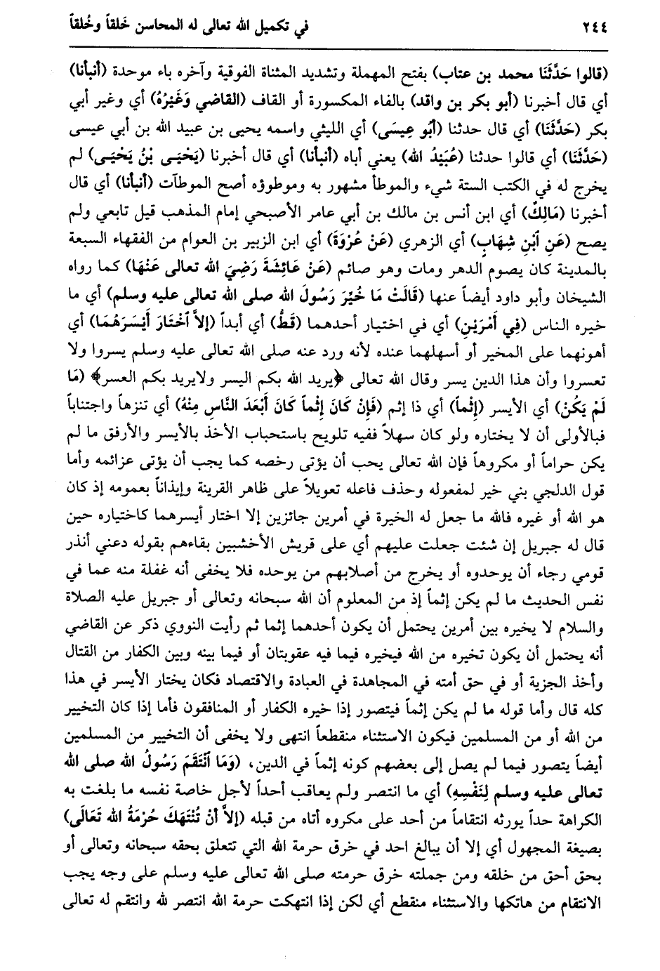 (قالوا حدّثنا محمد بن عتاب) بفتح المهملة وتشديد المثناة الفوقية وآخره باء موحدة (أنبأنا) أي قال أخبرنا (أبو بكر بن واقد) بالفاء المكسورة أو القاف (القاضي وغيره) أي وغير أبي بكر (حدّثنا) أي قال حدثنا (أبو عيسى) أي الليثي واسمه يحيى بن عبيد الله بن أبي عيسى (حدّثنا) أي قالوا حدثنا (عبيد الله) يعني أباه (أنبأنا) أي قال أخبرنا (يحيى بن يحيى) لم يخرج له في الكتب الستة شيء والموطأ مشهور به وموطوؤه أصح الموطآت (أنبأنا) أي قال أخبرنا (مالك) أي ابن أنس بن مالك بن أبي عامر الأصبحي إمام المذهب قيل تابعي ولم يصح (عن ابن شهاب) أي الزهري (عن عروة) أي ابن الزبير بن العوام من الفقهاء السبعة بالمدينة كان يصوم الدهر ومات وهو صائم (عن عائشة رضي الله تعالى عنها) كما رواه الشيخان وأبو داود أيضا عَنْهَا (قَالَتْ مَا خُيِّرَ رَسُولُ اللَّهِ صَلَّى الله تعالى عليه وسلم) أي ما خيره الناس (في أمرين) أي في اختيار أحدهما (قطّ) أي أبدا (إلّا اختار أيسرهما) أي أهونهما على المخير أو أسهلهما عنده لأنه ورد عنه صلى الله تعالى عليه وسلم يسروا ولا تعسروا وأن هذا الدين يسر وقال الله تعالى يُرِيدُ اللَّهُ بِكُمُ الْيُسْرَ وَلا يُرِيدُ بِكُمُ الْعُسْرَ (ما لم يكن) أي الأيسر (إثما) أي ذا إثم (فَإِنْ كَانَ إِثْمًا كَانَ أَبْعَدَ النَّاسِ مِنْهُ) أي تنزها واجتنابا فبالأولى أن لا يختاره ولو كان سهلا ففيه تلويح باستحباب الأخذ بالأيسر والأرفق ما لم يكن حراما أو مكروها فإن الله تعالى يحب أن يؤتى رخصه كما يجب أن يؤتى عزائمه وأما قول الدلجي بني خير لمفعوله وحذف فاعله تعويلا على ظاهر القرينة وإيذانا بعمومه إذ كان هو الله أو غيره فالله ما جعل له الخيرة في أمرين جائزين إلا اختار أيسرهما كاختياره حين قال له جبريل إن شئت جعلت عليهم أي على قريش الأخشبين بقاءهم بقوله دعني أنذر قومي رجاء أن يوحدوه أو يخرج من أصلابهم من يوحده فلا يخفى أنه غفلة منه عما في نفس الحديث ما لم يكن إثما إذ من المعلوم أن الله سبحانه وتعالى أو جبريل عليه الصلاة والسلام لا يخيره بين أمرين يحتمل أن يكون أحدهما إثما ثم رأيت النووي ذكر عن القاضي أنه يحتمل أن يكون تخيره من الله فيخيره فيما فيه عقوبتان أو فيما بينه وبين الكفار من القتال وأخذ الجزية أو في حق أمته في المجاهدة في العبادة والاقتصاد فكان يختار الأيسر في هذا كله قال وأما قوله ما لم يكن إثما فيتصور إذا خيره الكفار أو المنافقون فأما إذا كان التخيير من الله أو من المسلمين فيكون الاستثناء منقطعا انتهى ولا يخفى أن التخيير من المسلمين أيضا يتصور فيما لم يصل إلى بعضهم كونه إثما في الدين، (وما انتقم رسول الله صلى الله تعالى عليه وسلم لنفسه) أي ما انتصر ولم يعاقب أحدا لأجل خاصة نفسه ما بلغت به الكراهة حدا يورثه انتقاما من أحد على مكروه أتاه من قبله (إلّا أن تنتهك حرمة الله تعالى) بصيغة المجهول أي إلا أن يبالغ احد في خرق حرمة الله التي تتعلق بحقه سبحانه وتعالى أو بحق أحق من خلقه ومن جملته خرق حرمته صلى الله تعالى عليه وسلم على وجه يجب الانتقام من هاتكها والاستثناء منقطع أي لكن إذا انتهكت حرمة الله انتصر لله وانتقم له تعالى
