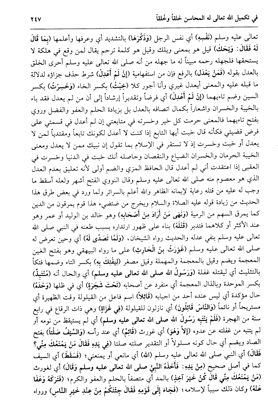 تعالى عليه وسلم (نفسه) أي نفس الرجل (وذكّرها) بالتشديد أي وعرفها وأعلمها (بما قال له فقال: ويحك) قيل هو بمعنى ويلك وقيل هو كلمة ترحم يقال لمن وقع في هلكة لا يستحقها فلجهله رحمه مبينا له ما جهله من أنه صلى الله تعالى عليه وسلم أحرى الخلق بالعدل بقوله (فمن يعدل) بالرفع فإن من استفهامية (إن لم أعدل) شرط حذف جزاؤه لدلالة ما قبله عليه والمعنى أيعدل غيري وأنا أجور كلا (خبت) بكسر الخاء (وخسرت) بكسر السين وضم تاءيهما (إن لم أعدل) أي فرضا وتقديرا إرشادا إلى أن من لم يعدل فقد باء بالخيبة والخسران واشعارا بكمال اتصافه بالعدل بل بزيادة الحلم والعفو والفضل وروي بفتح تاءيهما فالمعنى حرمت كل خير وخسرته في متابعتي إن لم أعدل في قسمتي على فرض قضيتي فكأنه قال خبت أيها التابع إذا كنت لا أعدل لكونك تابعا ومقتديا لمن لا يعدل أو خبت وخسرت إذ لا تستقر في الإسلام بما تقول إن نبيك ممن لا يعدل ومعنى الخيبة الحرمان والخسران الضياع والنقصان وحاصله أنك خبت في الدنيا وخسرت في العقبى إذا اعتقدت أني لم أعدل قال الحافظ المزي والضم أولى لأنه تعليق بعدم العدل الذي هو معصوم منه صلى الله تعالى عليه وسلم وقال النووي الفتح أشهر ولعله أسقط ما وجب له عليه من قتله رعاية لإيمانه الظاهر والله أعلم بالسرائر ولما ورد في بعض طرق هذا الحديث من زيادة قوله عليه الصلاة والسلام ويخرج من ضئضيء هذا قوم يمرقون من الدين كما يمرق السهم من الرمية (ونهى من أراد من أصحابه) وهو خالد بن الوليد أو عمر وهو عند الأكثر أو كلاهما فتدبر (قتله) بناء على ظهور ارتداره بسبب طعنه في النبي صلى الله تعالى عليه وسلم بنفي عدله والحديث رواه الشيخان، (ولمّا تصدّى له) أي وحين تعرض له صلى الله تعالى عليه وسلم (غورث بن الحارث) على ما رواه البيهقي وهو بفتح الغين المعجمة ويضم وقيل بالمعجمة والمهملة وقيل مصغر (ليفتك به) بكسر التاء وضمها فتكا بالتثليث أي ليقتله غفلة (ورسول الله صلى الله تعالى عليه وسلم) أي والحال أنه (منتبذ) بكسر الموحدة وبالذال المعجمة أي منفرد عن أصحابه (تحت شجرة) أي في ظلها (وحده) حال مؤكدة أي ليس عنده أحد من احبابه (قائلا) اسم فاعل من القيلولة وقت الظهيرة أي مستريحا أو نائما (والنّاس قائلون) أي نازلون للقيلولة (في غزاة) وهي ذات الرقاع في رابع سنة من الهجرة (فلم ينتبه رسول الله صلى الله تعالى عليه وسلم) أي لم يستيقظ من نومه أو لم يتنبه من غفلته عن عدوه (إلّا وهو) أي غورث (قائم) أي عند رأسه (والسّيف صلتا) بفتح الصاد ويضم أي حال كونه مسلولا أو التقدير صلته صَلْتًا (فِي يَدِهِ فَقَالَ مَنْ يَمْنَعُكَ مِنِّي؟