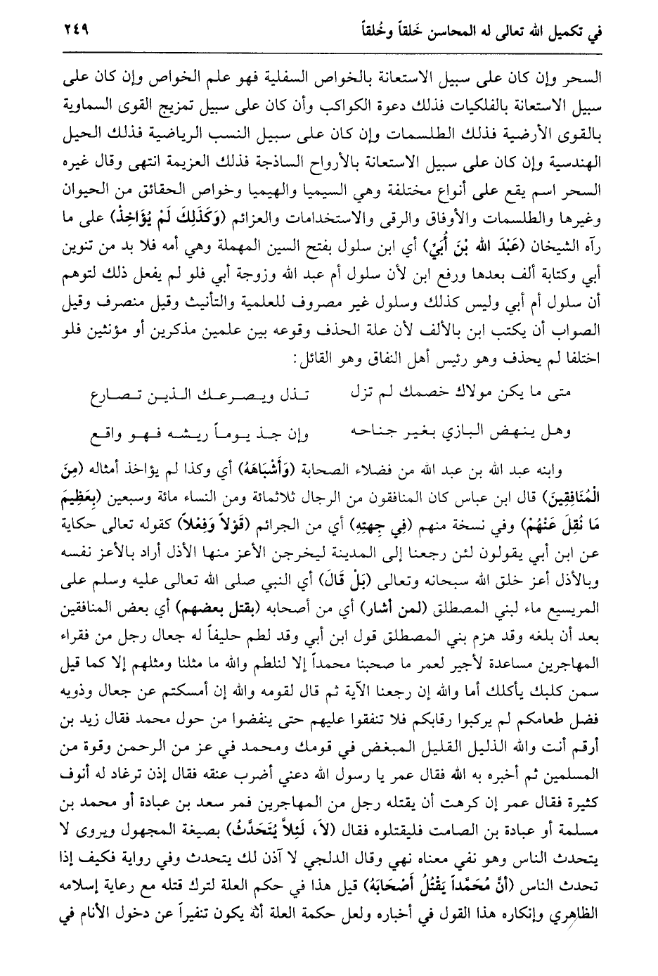 السحر وإن كان على سبيل الاستعانة بالخواص السفلية فهو علم الخواص وإن كان على سبيل الاستعانة بالفلكيات فذلك دعوة الكواكب وأن كان على سبيل تمزيج القوى السماوية بالقوى الأرضية فذلك الطلسمات وإن كان على سبيل النسب الرياضية فذلك الحيل الهندسية وإن كان على سبيل الاستعانة بالأرواح الساذجة فذلك العزيمة انتهى وقال غيره السحر اسم يقع على أنواع مختلفة وهي السيميا والهيميا وخواص الحقائق من الحيوان وغيرها والطلسمات والأوفاق والرقى والاستخدامات والعزائم (وكذلك لم يؤاخذ) على ما رآه الشيخان (عبد الله بن أبيّ) أي ابن سلول بفتح السين المهملة وهي أمه فلا بد من تنوين أبي وكتابة ألف بعدها ورفع ابن لأن سلول أم عبد الله وزوجة أبي فلو لم يفعل ذلك لتوهم أن سلول أم أبي وليس كذلك وسلول غير مصروف للعلمية والتأنيث وقيل منصرف وقيل الصواب أن يكتب ابن بالألف لأن علة الحذف وقوعه بين علمين مذكرين أو مؤنثين فلو اختلفا لم يحذف وهو رئيس أهل النفاق وهو القائل: