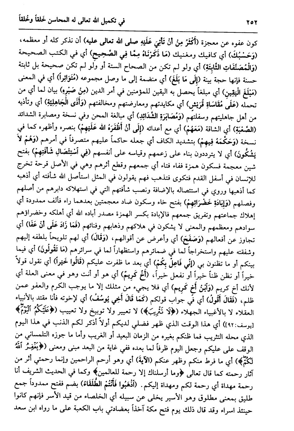 كون عفوه عن معجزة (أكثر من أن تأتي عليه صلى الله تعالى عليه) أن نذكر كله أو معظمه، (وحسبك) أي كافيك ومغنيك (ما ذكرناه ممّا في الصّحيح) أي في الكتب الصحيحة (والمصنّفات الثّابتة) أي ولو لم تكن من الصحاح الستة أو ولو لم تكن صحيحة بل ثابتة حسنة فإنها حجة بينة (إلى ما بلغ) أي منضمة إلى ما وصل مجموعه (متواترا) أي في المعنى (مبلغ اليقين) أي مبلغا يحصل به اليقين للمؤمنين في أمر الدين (من صبره) بيان لما أي من تحمله (على مقاساة قريش) أي مكايدتهم ومعارضتهم ومخالفتهم (وأذى الجاهليّة) أي وتأذيه من أهل جاهليتهم وسفلتهم (ومصابرة الشّدائد) أي مبالغة المحن وفي نسخة ومصابرة الشدائد (الصّعبة) أي الشاقة (معهم) أي مع أعدائه (إلى أن أظفره الله عليهم) بنصره وأظهره كما في نسخة (وحكّمه فيهم) بتشديد الكاف أي جعله حاكما عليهم متصرفا في أمرهم (وهم لا يشكّون) أي لا يترددون بناء على زعمهم وقياسه على أنفسهم (في استئصال شأفتهم) بفتح شين معجمة فسكون همزة ففاء فتاء أي جمعهم وقطع أثرهم وهي في الأصل قرحة تخرج للإنسان في أسفل القدم فتكوى فتذهب فهم يقولون في المثل استأصل الله شأفته أي أذهبه كما أذهبها وروي في استئصاله بالإضافة ونصب شأفتهم التي في استهلاكه دابرهم من أصلهم وفصلهم (وإبادة خضرائهم) بفتح خاء وسكون ضاد معجمتين بعدهما راء فألف ممدودة أي إهلاك جماعتهم وتفريق جمعهم فالإبادة بكسر الهمزة مصدر أباده الله أي أهلكه وخضراؤهم سوادهم ومعظمهم والمعنى لا يشكون في هلاكهم وذهابهم وفنائهم (فما زاد على أن عفا) أي تجاوز عن أفعالهم (وصفح) أي وأعرض عن أقوالهم، (وقال) أي لهم تلويحا بلطفه إليهم وشفقته عليهم واستخراجا لما في ضمائرهم واستظهارا لما في سرائرهم (ما تقولون) أي فيما بينكم أو ما تظنون بي (إنّي فاعل بكم) أي بعد ما ظفرت عليكم (قالوا خيرا) أي نقول قولا خيرا أو نظن ظنا خيرا أو نفعل خيرا، (أخ كريم) أي هو أو أنت وهو في معنى العلة أي لأنك أخ كريم (وابن أخ كريم) أي فلا يجيء من مثلك إلا ما يوجب الكرم والعفو عمن ظلم، (فقال أقول) أي في جواب قولكم (كما قال أخي يوسف) أي لإخوته فأنا مقتد بالأنبياء العقلاء لا بالأغبياء الجهلاء (لا تَثْرِيبَ) لا تعيير ولا توبيخ ولا تعييب (عَلَيْكُمُ الْيَوْمَ [يوسف: 92] ) أي هذا الوقت الذي ظهر فضلي لديكم أولا أذكر لكم الذنب في هذا اليوم الذي محله التثريب فما ظنكم بغيره من الزمان البعيد أو الغريب وأما ما جوزه التلمساني من الوقف على عليكم وجعل اليوم ظرفا لما بعده ففي غاية من البعد مبنى ومعنى (يَغْفِرُ اللَّهُ لَكُمْ) أي ما فرط منكم وظهر عنكم (الآية) أي وهو أرحم الراحمين وإنما رحمتي أثر من آثار رحمته كما قال تعالى وَما أَرْسَلْناكَ إِلَّا رَحْمَةً لِلْعالَمِينَ وكما في الحديث الشريف أنا رحمة مهداة أي رحمة لكم ومهداة إليكم. (اذهبوا فأنتم الطّلقاء) بضم ففتح ممدودا جمع طليق بمعنى مطلوق وهو الأسير يخلى عن سبيله أي الخلصاء من قيد الأسر فإنهم كانوا حينئذ اسراء وقد قال ذلك يوم فتح مكة آخذا بعضادتي باب الكعبة على ما رواه ابن سعد