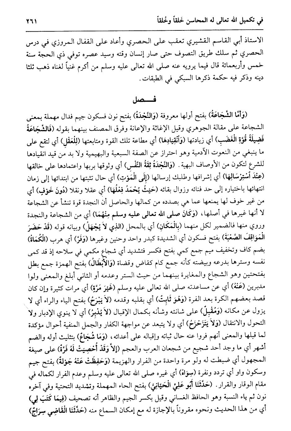 (وأمّا الشّجاعة) بفتح أولها معروفة (والنّجدة) بفتح نون فسكون جيم فدال مهملة بمعنى الشجاعة على مقالة الجوهري وقيل الإغاثة والإعانة وفرق المصنف بينهما بقوله (فالشّجاعة فضيلة قوّة الغضب) أي زيادتها (وانقيادها) أي مطاعة تلك القوة ومتابعتها (للعقل) أي لتقع على ما ينبغي من النعوت الآدمية وهو احتراز عن الصفة السبعية والبهيمية ولا بد من قيد انقيادها للشرع لتكون من الأوصاف البهية. (والنّجدة ثقة النّفس) أي وثوقها بربها واعتمادها على خالقها (عند استرسالها) أي إشرافها وطلبك إرسالها (إلى الموت) أي حال تثبتها من ابتدائها إلى زمان انتهائها باختياره إلى حد فنائه وزوال بقائه (حيث يحمد فعلها) أي عقلا ونقلا (دون خوف) أي من غير خوف لها يمنعها عما هي بصدده من كمالها والحاصل أن النجدة قوة تنشأ عن الشجاعة لا أنها غيرها في أصلها، (وكان صلى الله تعالى عليه وسلم منهما) أي من الشجاعة والنجدة وروي منها فالضمير لكل منهما (بالمكان) أي بالمحل (الذي لا يجهل) وبيانه قوله (قد حضر المواقف الصّعبة) بفتح فسكون أي الشديدة كبدر واحد وحنين وغيرها (وفرّ) أي هرب (الكماة) بضم كاف وتخفيف ميم جمع كمي بفتح فكسر فتشديد أي شجاع مكمي في سلاحه إذ قد كمى نفسه وسترها بدرعه وبيضته كأنه جمع كام كقاض وقضاة (والأبطال) بفتح الهمزة جمع بطل بفتحتين وهو الشجاع والمغايرة بينهما من حيث الستر وعدمه أو الثاني أبلغ والمعنى ولوا مدبرين (عنه) أي عن مساعدته صلى الله تعالى عليه وسلم (غير مرّة) أي مرات كثيرة وإن كان قصد بعضهم الكرة بعد الفرة (وهو ثابت) أي بقلبه وقدمه (لا يبرح) بفتح الياء والراء أي لا يزول عن مكانه (ومقبل) على شانئه وشأنه بكمال الإقبال (لا يدبر) أي لا ينوي الإدبار ولا التحول والانتقال (ولا يتزحزح) أي ولا يتبعد عن مواجهة الكفار والجمل المنفية أحوال مؤكدة لما قبلها والمعنى أنهم فروا عنه حال ثباته وإقباله على أعدائه، (وما شجاع) بتثليث أوله والضم أشهر أي ما وجد أحد شجيع من شجعان العرب والعجم (إلّا وقد أحصيت له فرّة) على صيغة المجهول أي ضبطت له ولو مرة واحدة من الفرار والهزيمة (وحفظت عنه جولة) بفتح جيم وسكون واو أي تردد ونفرة (سواه) أي غيره صلى الله تعالى عليه وسلم وعدم الفرار لكماله في مقام الوقار والقرار. (حدّثنا أبو عليّ الحيّانيّ) بفتح الحاء المهملة وتشديد التحتية وفي آخره نون ثم ياء النسبة وهو الحافظ الغساني وقيل بكسر الجيم والظاهر أنه تصحيف (فيما كتب لي) أي من هذا الحديث ونحوه مقرونا بالإجازة له مع إمكان السماع منه (حدّثنا القاضي سراج)
