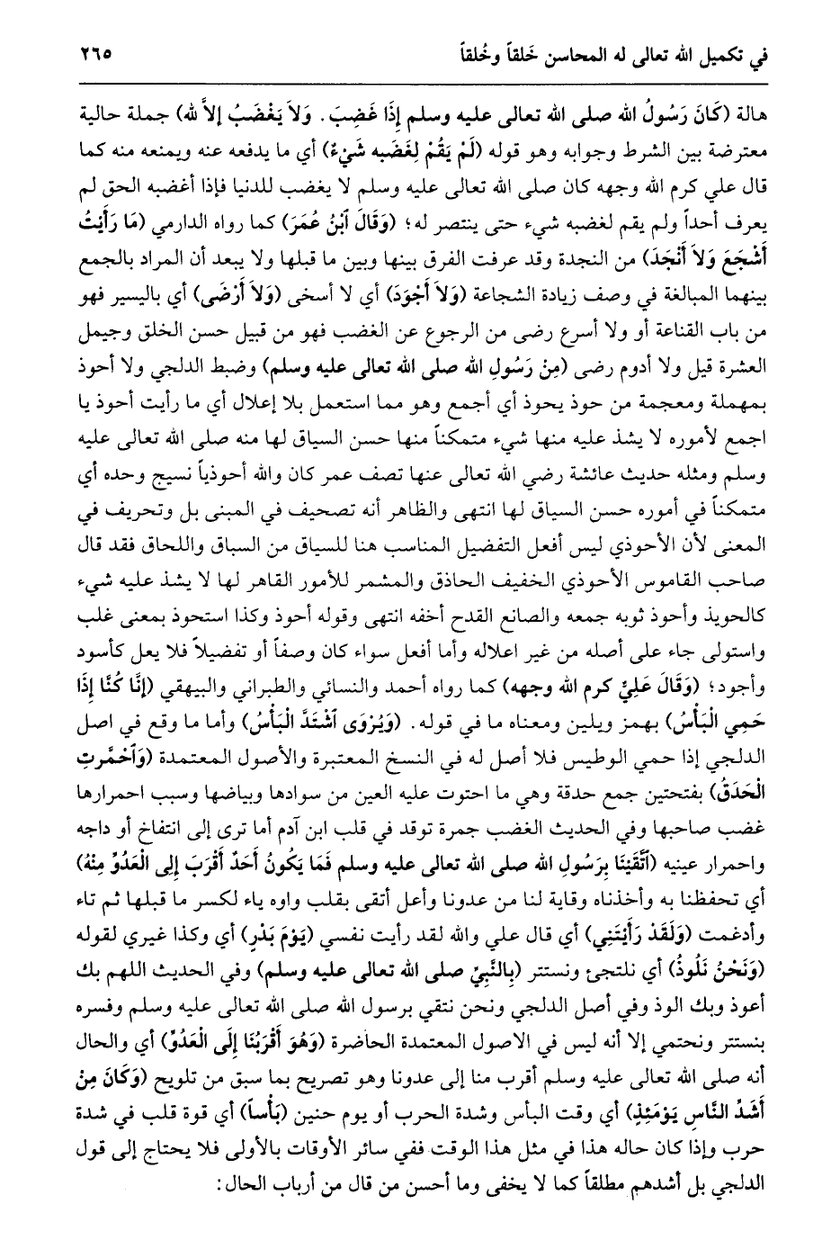 هالة (كان رسول الله صلى الله تعالى عَلَيْهِ وَسَلَّمَ إِذَا غَضِبَ. وَلَا يَغْضَبُ إِلَّا لله) جملة حالية معترضة بين الشرط وجوابه وهو قوله (لم يقم لغضبه شيء) أي ما يدفعه عنه ويمنعه منه كما قال علي كرم الله وجهه كان صلى الله تعالى عليه وسلم لا يغضب للدنيا فإذا أغضبه الحق لم يعرف أحدا ولم يقم لغضبه شيء حتى ينتصر له؛ (وقال ابن عمر) كما رواه الدارمي (ما رأيت أشجع ولا أنجد) من النجدة وقد عرفت الفرق بينها وبين ما قبلها ولا يبعد أن المراد بالجمع بينهما المبالغة في وصف زيادة الشجاعة (ولا أجود) أي لا أسخى (ولا أرضى) أي باليسير فهو من باب القناعة أو ولا أسرع رضى من الرجوع عن الغضب فهو من قبيل حسن الخلق وجيمل العشرة قيل ولا أدوم رضى (من رسول الله صلى الله تعالى عليه وسلم) وضبط الدلجي ولا أحوذ بمهملة ومعجمة من حوذ يحوذ أي أجمع وهو مما استعمل بلا إعلال أي ما رأيت أحوذ يا اجمع لأموره لا يشذ عليه منها شيء متمكنا منها حسن السياق لها منه صلى الله تعالى عليه وسلم ومثله حديث عائشة رضي الله تعالى عنها تصف عمر كان والله أحوذيا نسيج وحده أي متمكنا في أموره حسن السياق لها انتهى والظاهر أنه تصحيف في المبنى بل وتحريف في المعنى لأن الأحوذي ليس أفعل التفضيل المناسب هنا للسياق من السباق واللحاق فقد قال صاحب القاموس الأحوذي الخفيف الحاذق والمشمر للأمور القاهر لها لا يشذ عليه شيء كالحويذ وأحوذ ثوبه جمعه والصانع القدح أخفه انتهى وقوله أحوذ وكذا استحوذ بمعنى غلب واستولى جاء على أصله من غير اعلاله وأما أفعل سواء كان وصفا أو تفضيلا فلا يعل كأسود وأجود؛ (وقال عليّ كرم الله وجهه) كما رواه أحمد والنسائي والطبراني والبيهقي (إنّا كنّا إذا حمي البأس) بهمز ويلين ومعناه ما في قوله. (ويروى اشتدّ البأس) وأما ما وقع في اصل الدلجي إذا حمي الوطيس فلا أصل له في النسخ المعتبرة والأصول المعتمدة (واحمّرت الحدق) بفتحتين جمع حدقة وهي ما احتوت عليه العين من سوادها وبياضها وسبب احمرارها غضب صاحبها وفي الحديث الغضب جمرة توقد في قلب ابن آدم أما ترى إلى انتفاخ أو داجه واحمرار عينيه (اتّقينا برسول الله صلى الله تعالى عليه وسلم فَمَا يَكُونُ أَحَدٌ أَقْرَبَ إِلَى الْعَدُوِّ مِنْهُ) أي تحفظنا به وأخذناه وقاية لنا من عدونا وأعل أتقى بقلب واوه ياء لكسر ما قبلها ثم تاء وأدغمت (ولقد رأيتني) أي قال علي والله لقد رأيت نفسي (يوم بدر) أي وكذا غيري لقوله (ونحن نلوذ) أي نلتجئ ونستتر (بالنّبيّ صلى الله تعالى عليه وسلم) وفي الحديث اللهم بك أعوذ وبك الوذ وفي أصل الدلجي ونحن نتقي برسول الله صلى الله تعالى عليه وسلم وفسره بنستتر ونحتمي إلا أنه ليس في الاصول المعتمدة الحاضرة (وهو أقربنا إلى العدوّ) أي والحال أنه صلى الله تعالى عليه وسلم أقرب منا إلى عدونا وهو تصريح بما سبق من تلويح (وكان من أشدّ النّاس يومئذ) أي وقت البأس وشدة الحرب أو يوم حنين (بأسا) أي قوة قلب في شدة حرب وإذا كان حاله هذا في مثل هذا الوقت ففي سائر الأوقات بالأولى فلا يحتاج إلى قول الدلجي بل أشدهم مطلقا كما لا يخفى وما أحسن من قال من أرباب الحال:
