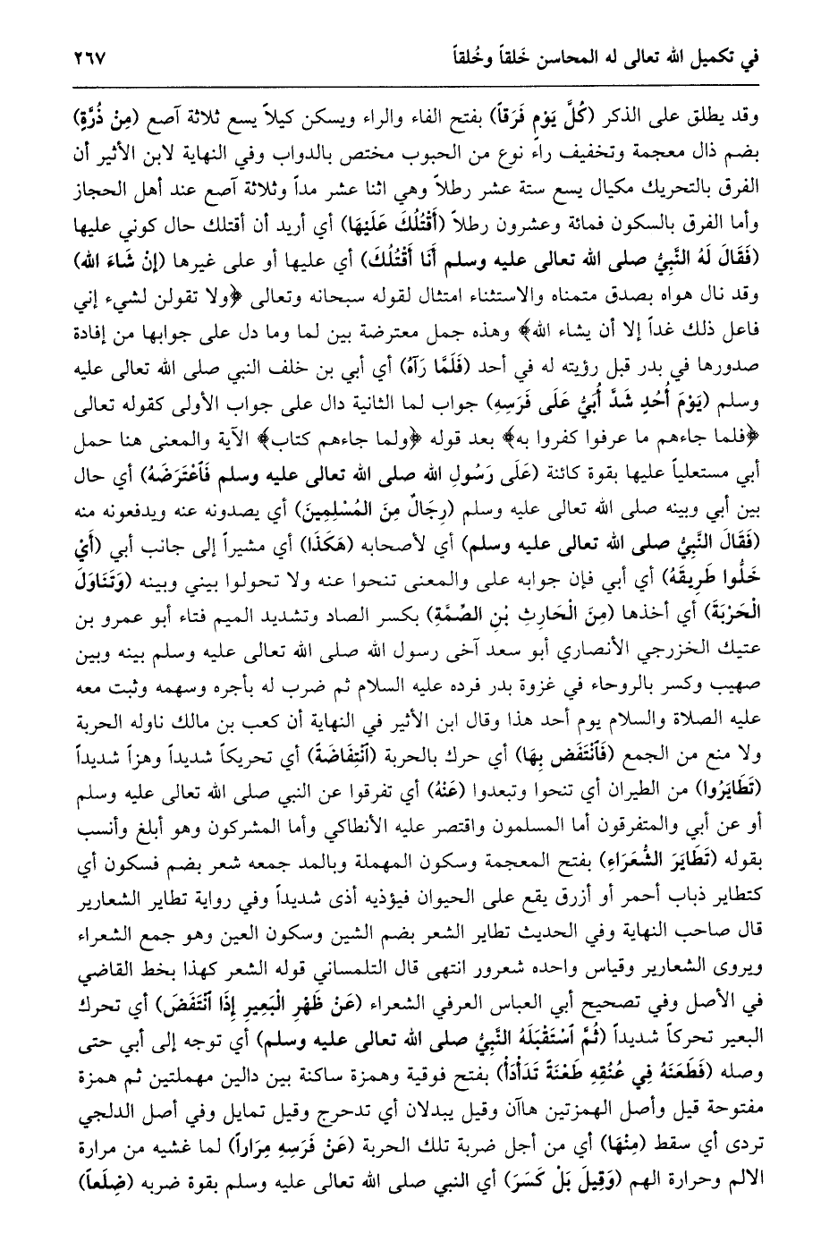 وقد يطلق على الذكر (كلّ يوم فرقا) بفتح الفاء والراء ويسكن كيلا يسع ثلاثة آصع (من ذرّة) بضم ذال معجمة وتخفيف راء نوع من الحبوب مختص بالدواب وفي النهاية لابن الأثير أن الفرق بالتحريك مكيال يسع ستة عشر رطلا وهي اثنا عشر مدا وثلاثة آصع عند أهل الحجاز وأما الفرق بالسكون فمائة وعشرون رطلا (أقتلك عليها) أي أريد أن أقتلك حال كوني عليها (فقال له النّبيّ صلى الله تعالى عليه وسلم أنا أقتلك) أي عليها أو على غيرها (إن شاء الله) وقد نال هواه بصدق متمناه والاستثناء امتثال لقوله سبحانه وتعالى وَلا تَقُولَنَّ لِشَيْءٍ إِنِّي فاعِلٌ ذلِكَ غَداً إِلَّا أَنْ يَشاءَ اللَّهُ وهذه جمل معترضة بين لما وما دل على جوابها من إفادة صدورها في بدر قبل رؤيته له في أحد (فلمّا رآه) أي أبي بن خلف النبي صلى الله تعالى عليه وسلم (يوم أحد شدّ أبيّ على فرسه) جواب لما الثانية دال على جواب الأولى كقوله تعالى فَلَمَّا جاءَهُمْ ما عَرَفُوا كَفَرُوا بِهِ بعد قوله وَلَمَّا جاءَهُمْ كِتابٌ الآية والمعنى هنا حمل أبي مستعليا عليها بقوة كائنة (على رسول الله صلى الله تعالى عليه وسلم فاعترضه) أي حال بين أبي وبينه صلى الله تعالى عليه وسلم (رجال من المسلمين) أي يصدونه عنه ويدفعونه منه (فقال النّبيّ صلى الله تعالى عليه وسلم) أي لأصحابه (هكذا) أي مشيرا إلى جانب أبي (أي خلّوا طريقه) أي أبي فإن جوابه على والمعنى تنحوا عنه ولا تحولوا بيني وبينه (وتناول الحربة) أي أخذها (من الحارث بن الصّمّة) بكسر الصاد وتشديد الميم فتاء أبو عمرو بن عتيك الخزرجي الأنصاري أبو سعد آخى رسول الله صلى الله تعالى عليه وسلم بينه وبين صهيب وكسر بالروحاء في غزوة بدر فرده عليه السلام ثم ضرب له بأجره وسهمه وثبت معه عليه الصلاة والسلام يوم أحد هذا وقال ابن الأثير في النهاية أن كعب بن مالك ناوله الحربة ولا منع من الجمع (فانتفض بها) أي حرك بالحربة (انتفاضة) أي تحريكا شديدا وهزا شديدا (تطايروا) من الطيران أي تنحوا وتبعدوا (عنه) أي تفرقوا عن النبي صلى الله تعالى عليه وسلم أو عن أبي والمتفرقون أما المسلمون واقتصر عليه الأنطاكي وأما المشركون وهو أبلغ وأنسب بقوله (تطاير الشّعراء) بفتح المعجمة وسكون المهملة وبالمد جمعه شعر بضم فسكون أي كتطاير ذباب أحمر أو أزرق يقع على الحيوان فيؤذيه أذى شديدا وفي رواية تطاير الشعارير قال صاحب النهاية وفي الحديث تطاير الشعر بضم الشين وسكون العين وهو جمع الشعراء ويروى الشعارير وقياس واحده شعرور انتهى قال التلمساني قوله الشعر كهذا بخط القاضي في الأصل وفي تصحيح أبي العباس العرفي الشعراء (عن ظهر البعير إذا انتفض) أي تحرك البعير تحركا شديدا (ثمّ استقبله النّبيّ صلى الله تعالى عليه وسلم) أي توجه إلى أبي حتى وصله (فطعنه في عنقه طعنة تدأدأ) بفتح فوقية وهمزة ساكنة بين دالين مهملتين ثم همزة مفتوحة قيل وأصل الهمزتين هاآن وقيل يبدلان أي تدحرج وقيل تمايل وفي أصل الدلجي تردى أي سقط (منها) أي من أجل ضربة تلك الحربة (عن فرسه مرارا) لما غشيه من مرارة الالم وحرارة الهم (وقيل بل كسر) أي النبي صلى الله تعالى عليه وسلم بقوة ضربه (ضلعا)