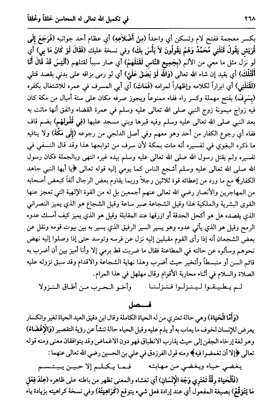 بكسر معجمة ففتح لام وتسكن أي واحدا (من أضلاعه) أي عظام أحد جوانبه (فَرَجَعَ إِلَى قُرَيْشٍ يَقُولُ قَتَلَنِي مُحَمَّدٌ وَهُمْ يقولون لا بأس بك) وفي نسخة عليك (فقال لو كان ما بي) أي لو نزل مثل ما معي من الألم (بجميع النّاس لقتلهم) أي صار سببا لقتلهم (أليس قد قال أنا أقتلك) أي بقيد إن شاء الله تعالى (والله لو بصق عليّ) أي لو رمى بزاقه على بدني بقصد قتلي (لقتلني) أي ابرارا لكلامه وإظهارا لمرامه (فمات) أي أبي المسرف في عمره للاشتغال بكفره (بسرف) بفتح مهملة وكسر راء ففاء ممنوعا ويجوز صرفه مكان على ستة أميال من مكة كان فيه زواج ميمونة زوج النبي صلى الله تعالى عليه وسلم في عمرة القضاء واتفق أنها ماتت به بعد النبي صلى الله تعالى عليه وسلم وفيه قبرها وبني مسجد عليها (في قفولهم) بضم قاف ففاء أي رجوع الكفار من أحد وهو معهم وفي أصل الدلجي من رجوعه (إلى مكّة) ولا ينافيه ما ذكره البغوي في تفسيره أنه مات بمكة لأن سرف من توابعها هذا وقد قال النسفي في تفسيره ولم يقتل رسول الله صلى الله تعالى عليه وسلم بيده غيره انتهى وبالجملة فكان رسول الله صلى الله تعالى عليه وسلم أشجع الناس كما يومي إليه قوله تعالى يا أَيُّهَا النَّبِيُّ جاهِدِ الْكُفَّارَ مع ما ورد من إعطائه قوة ثلاثين رجلا وربما يقاوم بعض الرجال ألفا كبعض أصحابه من المهاجرين والأنصار رضي الله تعالى عنهم أجمعين بل له من القوة الإلهية التي تعجز عنها القوى البشرية والملكية هذا وقيل الشجاعة صبر ساعة وقيل الشجاع هو الذي يميز النصراني الذي يقصده هل هو أكحل الحدقة أو ازرقها عند المقابلة وقيل هو الذي يميز كيف أمسك عدوه الرمح وقيل هو الذي يأتي عدوه وهو يسير السير الرفيق الذي يسير به بين بيوت قومه ونقل عن بعض الشجعان أنه إذا رأى القوم مقبلين إليه نزل عن فرسه وتوسد حتى إذا وصلوا إليه نهض نحوهم وسألوه عن حالته في المطاعنة فقال ما ضربت قط برمي إلا وأنا أميز بين أن أضرب به قائم السن أو منبسطا وأتخير حيث أضرب وهذا نهاية الشجاعة والاقدام وقد سبق نزوله عليه الصلاة والسلام في أثناء محاربة الأقوام وقال مهلهل في هذا المرام.