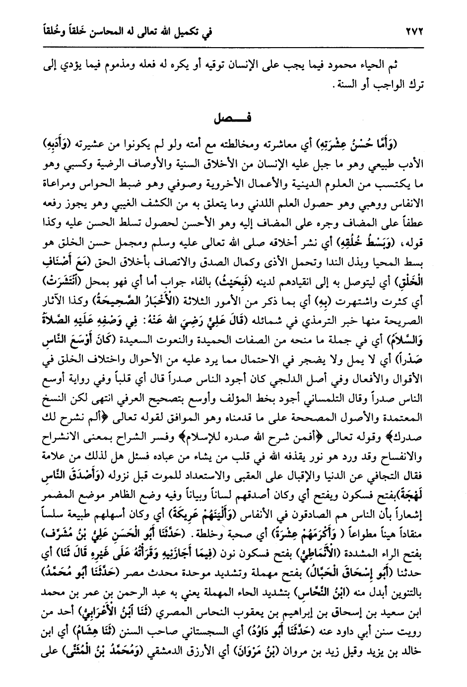 (وأمّا حسن عشرته) أي معاشرته ومخالطته مع أمته ولو لم يكونوا من عشيرته (وأدبه) الأدب طبيعي وهو ما جبل عليه الإنسان من الأخلاق السنية والأوصاف الرضية وكسبي وهو ما يكتسب من العلوم الدينية والأعمال الأخروية وصوفي وهو ضبط الحواس ومراعاة الانفاس ووهبي وهو حصول العلم اللدني وما يتعلق به من الكشف الغيبي وهو يجوز رفعه عطفا على المضاف وجره على المضاف إليه وهو الأحسن لحصول تسلط الحسن عليه وكذا قوله، (وبسط خلقه) أي نشر أخلاقه صلى الله تعالى عليه وسلم ومجمل حسن الخلق هو بسط المحيا وبذل الندا وتحمل الأذى وكمال الصدق والاتصاف بأخلاق الحق (مع أصناف الخلق) أي ليتوصل به إلى انقيادهم لدينه (فبحيث) بالفاء جواب أما أي فهو بمحل (انتشرت) أي كثرت واشتهرت (به) أي بما ذكر من الأمور الثلاثة (الأخبار الصّحيحة) وكذا الآثار الصريحة منها خبر الترمذي في شمائله (قَالَ عَلِيٌّ رَضِيَ اللَّهُ عَنْهُ: فِي وَصْفِهِ عليه الصّلاة والسّلام) أي في جملة ما منحه من الصفات الحميدة والنعوت السعيدة (كان أوسع النّاس صدرا) أي لا يمل ولا يضجر في الاحتمال مما يرد عليه من الأحوال واختلاف الخلق في الأقوال والأفعال وفي أصل الدلجي كان أجود الناس صدرا قال أي قلبا وفي رواية أوسع الناس صدرا وقال التلمساني أجود بخط المؤلف وأوسع بتصحيح العرفي انتهى لكن النسخ المعتمدة والأصول المصححة على ما قدمناه وهو الموافق لقوله تعالى أَلَمْ نَشْرَحْ لَكَ صَدْرَكَ وقوله تعالى أَفَمَنْ شَرَحَ اللَّهُ صَدْرَهُ لِلْإِسْلامِ وفسر الشراح بمعنى الانشراح والانفساح وقد ورد هو نور يقذفه الله في قلب من يشاء من عباده فسئل هل لذلك من علامة فقال التجافي عن الدنيا والإقبال على العقبى والاستعداد للموت قبل نزوله (وأصدق النّاس لهجة) بفتح فسكون ويفتح أي وكان أصدقهم لسانا وبيانا وفيه وضع الظاهر موضع المضمر إشعارا بأن الناس هم الصادقون في الأنفاس (وألينهم عريكة) أي وكان أسهلهم طبيعة سلسا منقادا هينا مطواعا (وأكرمهم عشرة) أي صحبة وخلطة. (حدّثنا أبو الحسن عليّ بن مشرّف) بفتح الراء المشددة (الأنماطيّ) بفتح فسكون نون (فيما أجازنيه وقرأته على غيره قال ثنا) أي حدثنا (أبو إسحاق الحبّال) بفتح مهملة وتشديد موحدة محدث مصر (حدّثنا أبو محمّد) بالتنوين أبدل منه (ابن النّحّاس) بتشديد الحاء المهملة يعني به عبد الرحمن بن عمر بن محمد ابن سعيد بن إسحاق بن إبراهيم بن يعقوب النحاس المصري (ثنا ابن الأعرابيّ) أحد من رويت سنن أبي داود عنه (حدّثنا أبو داود) أي السجستاني صاحب السنن (ثنا هشام) أي ابن خالد بن يزيد وقيل زيد بن مروان (بن مروان) أي الأرزق الدمشقي (ومحمّد بن المثنّى) على