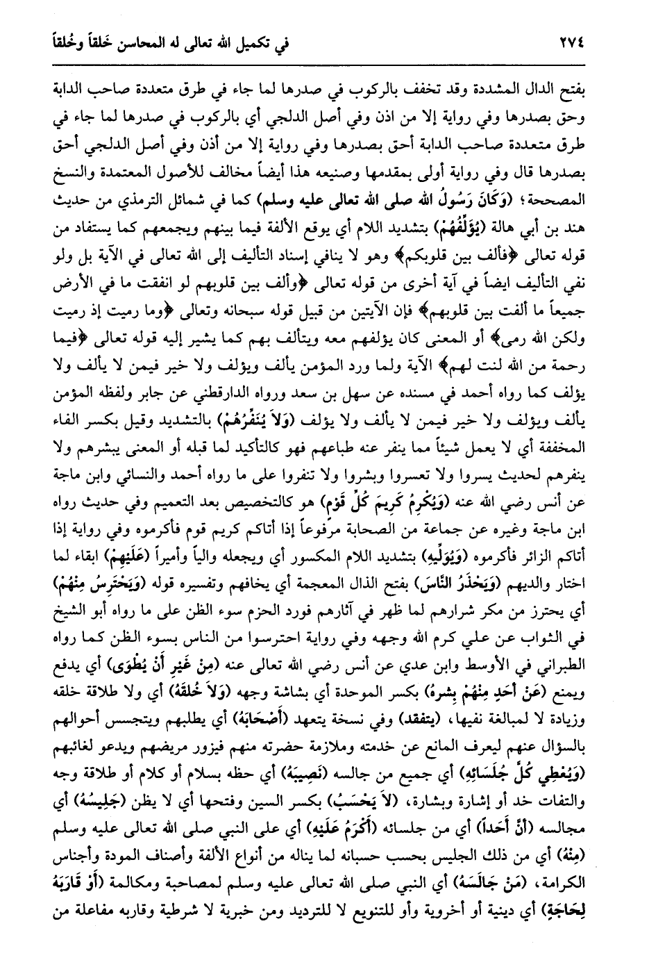 بفتح الدال المشددة وقد تخفف بالركوب في صدرها لما جاء في طرق متعددة صاحب الدابة وحق بصدرها وفي رواية إلا من اذن وفي أصل الدلجي أي بالركوب في صدرها لما جاء في طرق متعددة صاحب الدابة أحق بصدرها وفي رواية إلا من أذن وفي أصل الدلجي أحق بصدرها قال وفي رواية أولى بمقدمها وصنيعه هذا أيضا مخالف للأصول المعتمدة والنسخ المصححة؛ (وكان رسول الله صلى الله تعالى عليه وسلم) كما في شمائل الترمذي من حديث هند بن أبي هالة (يؤلّفهم) بتشديد اللام أي يوقع الألفة فيما بينهم ويجمعهم كما يستفاد من قوله تعالى فَأَلَّفَ بَيْنَ قُلُوبِكُمْ وهو لا ينافي إسناد التأليف إلى الله تعالى في الآية بل ولو نفي التأليف ايضا في آية أخرى من قوله تعالى وَأَلَّفَ بَيْنَ قُلُوبِهِمْ لَوْ أَنْفَقْتَ ما فِي الْأَرْضِ جَمِيعاً ما أَلَّفْتَ بَيْنَ قُلُوبِهِمْ فإن الآيتين من قبيل قوله سبحانه وتعالى وَما رَمَيْتَ إِذْ رَمَيْتَ وَلكِنَّ اللَّهَ رَمى أو المعنى كان يؤلفهم معه ويتألف بهم كما يشير إليه قوله تَعَالَى فَبِما رَحْمَةٍ مِنَ اللَّهِ لِنْتَ لَهُمْ الآية ولما ورد المؤمن يألف ويؤلف ولا خير فيمن لا يألف ولا يؤلف كما رواه أحمد في مسنده عن سهل بن سعد ورواه الدارقطني عن جابر ولفظه المؤمن يألف ويؤلف ولا خير فيمن لا يألف ولا يؤلف (ولا ينفّرهم) بالتشديد وقيل بكسر الفاء المخففة أي لا يعمل شيئا مما ينفر عنه طباعهم فهو كالتأكيد لما قبله أو المعنى يبشرهم ولا ينفرهم لحديث يسروا ولا تعسروا وبشروا ولا تنفروا على ما رواه أحمد والنسائي وابن ماجة عن أنس رضي الله عنه (ويكرم كريم كلّ قوم) هو كالتخصيص بعد التعميم وفي حديث رواه ابن ماجة وغيره عن جماعة من الصحابة مرفوعا إذا أتاكم كريم قوم فأكرموه وفي رواية إذا أتاكم الزائر فأكرموه (ويولّيه) بتشديد اللام المكسور أي ويجعله واليا وأميرا (عليهم) ابقاء لما اختار والديهم (ويحذر النّاس) بفتح الذال المعجمة أي يخافهم وتفسيره قوله (ويحترس منهم) أي يحترز من مكر شرارهم لما ظهر في آثارهم فورد الحزم سوء الظن على ما رواه أبو الشيخ في الثواب عن علي كرم الله وجهه وفي رواية احترسوا من الناس بسوء الظن كما رواه الطبراني في الأوسط وابن عدي عن أنس رضي الله تعالى عنه (من غير أن يطوى) أي يدفع ويمنع (عن أحد منهم بشره) بكسر الموحدة أي بشاشة وجهه (ولا خلقه) أي ولا طلاقة خلقه وزيادة لا لمبالغة نفيها، (يتفقد) وفي نسخة يتعهد (أصحابه) أي يطلبهم ويتجسس أحوالهم بالسؤال عنهم ليعرف المانع عن خدمته وملازمة حضرته منهم فيزور مريضهم ويدعو لغائبهم (ويعطي كلّ جلسائه) أي جميع من جالسه (نصيبه) أي حظه بسلام أو كلام أو طلاقة وجه والتفات خد أو إشارة وبشارة، (لا يحسب) بكسر السين وفتحها أي لا يظن (جليسه) أي مجالسه (أنّ أحدا) أي من جلسائه (أكرم عليه) أي على النبي صلى الله تعالى عليه وسلم (منه) أي من ذلك الجليس بحسب حسبانه لما يناله من أنواع الألفة وأصناف المودة وأجناس الكرامة، (من جالسه) أي النبي صلى الله تعالى عليه وسلم لمصاحبة ومكالمة (أو قاربه لحاجة) أي دينية أو أخروية وأو للتنويع لا للترديد ومن خبرية لا شرطية وقاربه مفاعلة من