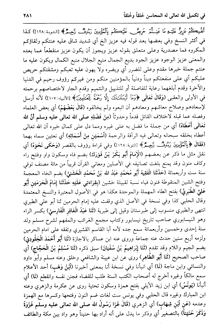 أَنْفُسِكُمْ عَزِيزٌ عَلَيْهِ مَا عَنِتُّمْ حَرِيصٌ عَلَيْكُمْ بِالْمُؤْمِنِينَ رَؤُفٌ رَحِيمٌ [التوبة: 128] ) كذا في أكثر النسخ وفي بعضها بعد قوله فيه عزيز الخ أي شديد شاق عليه عنتكم ولقاؤكم المكروه فما مصدرية وعلى متعلق بقوله عزيز ويجوز أن يكون عزيز منقطعا عما بعده والمعنى عزيز الوجود عزيز الجود بديع الجمال منيع الجلال منبع الكمال ويكون عليه ما عنتم جملة خبرها مقدم وعلى للضرر أي ويضره ولا يهون عليه تعبكم ومشقتكم حريص عليكم أي على منفعتكم دينا ودنيا بالمؤمنين منكم ومن غيركم رؤوف رحيم في الدنيا والآخرة وقدم أبلغهما رعاية للفاصلة أو للتذييل والتتميم وقدم الجار لاختصاصهم برحمته في الأولى والعقبى (وَقَالَ تَعَالَى وَما أَرْسَلْناكَ إِلَّا رَحْمَةً لِلْعالَمِينَ [الأنبياء: 107] ) لأنه أرسل لإسعادهم وصلاح معاشهم ومعادهم أن اتبعوه ولم يخالفوه (قال بعضهم) أي بعض العلماء وفصله عما قبله لاختلاف القائل قدما وحدوثا (من فضله صلى الله تعالى عليه وسلم أنّ الله تعالى أعطاه) أي من جملة ما فضل به على غيره ومما دل على كمال خيره أن الله تعالى أعطاه بخلقه سبحانه وتعالى فيه الرأفة والرحمة (اسمين من أسمائه) أي نعتين سماه بهما (فقال بِالْمُؤْمِنِينَ رَؤُفٌ رَحِيمٌ [التوبة: 128] ) وفي قراءة رؤوف بالقصر (وحكى نحوه) أي نقل مثل ما ذكر عن بعضهم (الإمام أبو بكر بن فورك) بضم فاء وسكون واو وفتح راء وكاف منون وقد يمنع بلغت تصانيفه في الأصلين ومعاني القرآن قريبا من مائة مصنف توفي سنة ست وأربعمائة (حَدَّثَنَا الْفَقِيهُ أَبُو مُحَمَّدٍ عَبْدُ اللَّهِ بْنُ محمّد الخشنيّ) بضم الخاء المعجمة وفتح الشين المنقوطة فنون فياء نسبة لقبيلة خشين (بِقِرَاءَتِي عَلَيْهِ حَدَّثَنَا إِمَامُ الْحَرَمَيْنِ أَبُو عَلِيٍّ الطّبريّ) بفتح الطاء المهملة والموحدة هكذا هو في الأصول المعتبرة والنسخ المعتمدة وقال الحلبي كذا وفي نسخة في الأصل الذي وقفت عليه إمام الحرمين ثنا أبو علي الطبري انتهى والطبري منسوب إلى طبرستان وقيل إلى طبرية (ثنا عبد الغافر الفارسيّ) بكسر الراء وهو النيسابوري صاحب تاريخ نيسابور وكتاب مجمع الغرائب والمفهم لشرح مسلم ولد سنة إحدى وخمسين وأربعمائة سمع جده لأمه أبا القاسم القشيري وتفقه على امام الحرمين ولزمه أربع سنين حدث عنه جماعة وروى عنه ابن عساكر بالاجازة (ثنا أبو أحمد الجلوديّ) بضم الجيم واللام وقد تقدم (ثنا إبراهيم بن سفيان) سبق ذكره (ثنا مسلم بن الحجّاج) أي صاحب الصحيح (ثنا أبو الطّاهر) روى عن ابن عيينة والشافعي وخلق وعنه مسلم وأبو داود والنسائي وابن ماجة (نا) أي انبأنا وفي نسخة أنا بمعنى أخبرنا (ابن وهب) أحد الأعلام سمع مالكا وغيره أخرج له أصحاب الكتب الستة طلب للقضاء فجنن نفسه وانقطع (نا) أي أنبأنا (يونس) أي ابن زيد الأيلي بفتح همزة وسكون تحتية روى عن عكرمة والزهري وعنه ابن المبارك وغيره قال الحلبي وفي يونس ست لغات ضم النون وفتحها وكسرها مع الهمزة وعدمه (عن ابن شهاب) أي الزهري (قال غزا رسول الله صلى الله تعالى عليه وسلم غزوة وذكر حنينا) بالتصغير أي وذكر ما يدل على أنه أراد بها حنينا وهو واد بين مكة والطائف