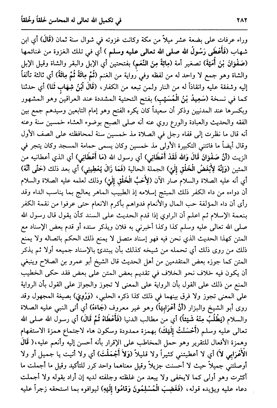 وراء عرفات على بضعة عشر ميلا من مكة وكانت غزوته في شوال سنة ثمان (قال) أي ابن شهاب (فأعطى رسول الله صلى الله تعالى عليه وسلم) أي في تلك الغزوة من غنائمها (صفوان بن أميّة) تصغير أمة (مائة من النّعم) بفتحتين أي الإبل والبقر والشاة وقيل الإبل والشاة وهو جمع لا واحد له من لفظه وفي رواية من الغنم (ثمّ مائة ثمّ مائة) أي ثالثة تألفا إليه وشفقة عليه وانقاذا له من النار ولمن تبعه من الكفار، (قال ابن شهاب ثنا) أي حدثنا كما في نسخة (سعيد بن المسيّب) بفتح التحتية المشددة عند العراقين وهو المشهور وبكسرها عند المدنيين وذكر أن سعيدا كان يكره الفتح وهو إمام التابعين وسيدهم جمع بين الفقه والحديث والعبادة والورع روي عنه أنه صلى الصبح بوضوء العشاء خمسين سنة وعنه أنه قال ما نظرت إلى قفاء رجل في الصلاة مذ خمسين سنة لمحافظته على الصف الأول وقال أيضا ما فاتتني التكبيرة الأولى مذ خمسين وكان يسمى حمامة المسجد وكان يتجر في الزيت (أنّ صفوان قال والله لقد أعطاني) أي رسول الله (ما أعطاني) أي الذي أعطانيه من المئين (وإنّه لأبغض الخلق إليّ) الجملة الحالية (فما زال يعطيني) أي بعد ذلك (حتّى أنّه) أي أنه عليه الصلاة والسلام صار الآن (لأحبّ الخلق إليّ) وذلك لعلمه عليه الصلاة والسلام أن دواءه من داء الكفر ذلك المبتج إسلامه إذ الطبيب الماهر يعالج بما يناسب الداء وقد رأى أن داء المؤلفة حب المال والأنعام فدواهم بأكرم الانعام حتى عرفوا من نقمة الكفر بنعمة الإسلام ثم اعلم أن الراوي إذا قدم الحديث على السند كَانَ يَقُولُ قَالَ رَسُولُ اللَّهِ صَلَّى اللَّهُ تعالى عليه وسلم كذا وكذا أخبرني به فلان ويذكر سنده أو قدم بعض الإسناد مع المتن كهذا الحديث الذي نحن فيه فهو إسناد متصل لا يمنع ذلك الحكم باتصاله ولا يمنع ذلك من روى ذلك أي تحمله من شيخه كذلك بأن يبتدئ بالإسناد جميعه أولا ثم يذكر المتن كما جوزه بعض المتقدمين من أهل الحديث قال الشيخ أبو عمرو بن الصلاح وينبغي أن يكون فيه خلاف نحو الخلاف في تقديم بعض المتن على بعض فقد حكى الخطيب المنع من ذلك على القول بأن الرواية على المعنى لا تجوز والجواز على القول بأن الرواية على المعنى تجوز ولا فرق بينهما في ذلك كذا ذكره الحلبي، (وروي) بصيغة المجهول وقد روى أبو الشيخ والبزار (أنّ أعرابيّا) وهو غير معروف (جاءه) أي أتى النبي عليه الصلاة والسلام (يطلب منه شيئا) أي من مطالب الدنيا (فأعطاه ثمّ قال) أي رسول الله صلى الله تعالى عليه وسلم (أحسنت إليك) بهمزة ممدودة وسكون هاء لاجتماع همزة الاستفهام وهمزة الأفعال للتقرير وهو حمل المخاطب على الإقرار بأنه أحسن إليه وأنعم عليه، (قال الأعرابي لا) أي لا أعطيتني كثيرا ولا قليلا (ولا أجملت) أي ولا أتيت يا جميل أو ولا أوصلتني جميلا حيث لا أحسنت جزيلا وقيل معناهما واحد كرر للتأكيد وقيل ما أجملت ما أكثرت وهو أولى كما لا يخفى ولا يبعد من غلظته وجلفته لديه إن أراد بقوله ولا أجملت دعاء عليه ويؤيده قوله، (فغضب المسلمون وقاموا إليه) ليوافوه بما استحقه زجرا عليه