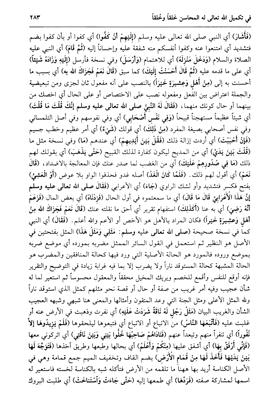 (فأشار) أي النبي صلى الله تعالى عليه وسلم (إليهم أن كفّوا) أي كفوا أو بأن كفوا بضم فتشديد أي امتنعوا عنه وكفوا أنفسكم منه شفقة عليه وإحسانا إليه (ثمّ قام) أي النبي عليه الصلاة والسلام (ودخل منزله) أي للاهتمام (وأرسل) وفي نسخة فأرسل (إليه وزاده شيئا) أي على ما قدمه عليه (ثمّ قال أحسنت إليك) كما سبق (قال نعم فجزاك الله به) أي بسبب ما أحسنت به إلى (من أهل وعشيرة خيرا) بالنصب على أنه مفعول ثان لجزى ومن تبعيضية والجملة اعتراض بين الفعل ومفعوله نصب على الاختصاص أو على الحال أي اخصك من بينهما أو حال كونك منهما، (فقال له النّبيّ صلى الله تعالى عليه وسلم إنّك قلت ما قلت) أي شيئا عظيما مستهجنا قبيحا (وفي نفس أصحابي) أي وفي نفوسهم وفي أصل التلمساني وفي نفس أصحابي بصيغة المفرد (من ذلك) أي قولك (شيء) أي أمر عظيم وخطب جسيم (فإن أحببت) أي أردت إزالة ذلك (فقل بين أيديهم) أي عندهم (ما) وفي نسخة مثل ما (قلت بين يديّ) أي من المديح ليكون كفارة لذلك القبيح (حتّى يذهب) أي بقولك لهم ذلك (ما في صدورهم عليك) أي من الغضب لما صدر عنك فإن المعالجة بالاضداد، (قال نعم) أي أقول لهم ذلك. (فلمّا كان الغد) أصله غدو فحذفوا الواو بلا عوض (أو العشيّ) بفتح فكسر فتشديد وأو لشك الراوي (جاء) أي الأعرابي (فقال صلى الله تعالى عَلَيْهِ وَسَلَّمَ إِنَّ هَذَا الْأَعْرَابِيَّ قَالَ مَا قال) أي ما سمعتموه في أول الحال (فزدناه) أي بعض المال (فزعم أنّه رضي) أي به عنا (أكذلك) استفهام تقرير أي أحق ما نقلته عنك (قَالَ نَعَمْ فَجَزَاكَ اللَّهُ مِنْ أَهْلٍ وَعَشِيرَةٍ خيرا) فكان المراد بالأهل هو الأخص أو الأعم والله أعلم. (فقال) أي النبي كما في نسخة صحيحة (صلى الله تعالى عليه وسلم: مثلي ومثل هذا) المثل بفتحتين في الأصل هو النظير ثم استعمل في القول السائر الممثل مضربه بمورده أي موضع ضربه بموضع وروده فالمورد هو الحالة الأصلية التي ورد فيها كحالة المنافقين والمضرب هو الحالة المشبهة كحالة المستوقد نارا ولا يضرب إلا بما فيه غرابة زيادة في التوضيح والتقرير فإنه أوقع للنفس وأقمع للخصم ويريك المخيل محققا والمعقول محسوسا ثم استعير لما له شأن عجيب وفيه أمر غريب من صفة أو حال أو قصة نحو مثلهم كمثل الذي استوقد نارا ولله المثل الأعلى ومثل الجنة التي وعد المتقون وأمثالها والمعنى هنا شبهي وشبه العجيب الشأن والغريب البيان (مثل رجل له ناقة شردت عليه) أي نفرت وذهبت في الأرض عنه أو غلبت عليه (فأتبعها النّاس) من الاتباع أو الاتباع أي فتبعوها ليلحقوها (فلم يريدوها إلّا نفورا) أي تنفرا منهم وتبعدا عنهم (فناداهم صاحبها خلّوا بيني وبين ناقتي) أي اتركوني معها (فإنّي أرفق بها) أي أشفق عليها (منكم وأعلم) أي بحالها وطبعها وطريق أخذها (فَتَوَجَّهَ لَهَا بَيْنَ يَدَيْهَا فَأَخَذَ لَهَا مَنْ قمام الأرض) بضم القاف وتخفيف الميم جمع قمامة وهي في الأصل الكناسة أريد بها ههنا ما تلقمه من الأرض فتأكله شبه بالكناسة لخسته فاستعير له اسمها لمشاركة صفته (فردّها) أي طمعها إليه (حتّى جاءت واستناخت) أي طلبت البروك