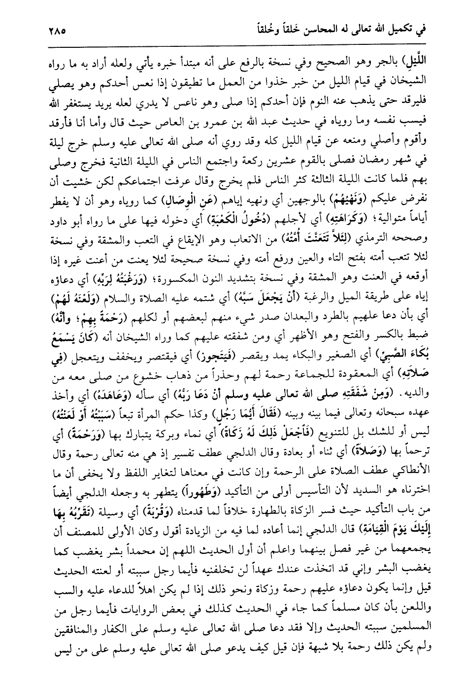 اللّيل) بالجر وهو الصحيح وفي نسخة بالرفع على أنه مبتدأ خبره يأتي ولعله أراد به ما رواه الشيخان في قيام الليل من خبر خذوا من العمل ما تطيقون إذا نعس أحدكم وهو يصلي فليرقد حتى يذهب عنه النوم فإن أحدكم إذا صلى وهو ناعس لا يدري لعله يريد يستغفر الله فيسب نفسه وما روياه في حديث عبد الله بن عمرو بن العاص حيث قال وأما أنا فأرقد وأقوم وأصلي ومنعه عن قيام الليل كله وقد روي أنه صلى الله تعالى عليه وسلم خرج ليلة في شهر رمضان فصلى بالقوم عشرين ركعة واجتمع الناس في الليلة الثانية فخرج وصلى بهم فلما كانت الليلة الثالثة كثر الناس فلم يخرج وقال عرفت اجتماعكم لكن خشيت أن نفرض عليكم (ونهيهم) بالوجهين أي ونهيه إياهم (عن الوصال) كما روياه وهو أن لا يفطر أياما متوالية؛ (وكراهته) أي لأجلهم (دخول الكعبة) أي دخوله فيها على ما رواه أبو داود وصححه الترمذي (لئلّا تتعنّت أمّته) من الاتعاب وهو الإيقاع في التعب والمشقة وفي نسخة لئلا تتعب أمته بفتح التاء والعين ورفع أمته وفي نسخة صحيحة لئلا يعنت من أعنت غيره إذا أوقعه في العنت وهو المشقة وفي نسخة بتشديد النون المكسورة؛ (ورغبته لربّه) أي دعاؤه إياه على طريقة الميل والرغبة (أن يجعل سبّه) أي شتمه عليه الصلاة والسلام (ولعنه لهم) أي بأن دعا عليهم بالطرد والبعدان صدر شيء منهم لبعضهم أو لكلهم (رحمة بهم؛ وأنّه) ضبط بالكسر والفتح وهو الأظهر أي ومن شفقته عليهم كما وراه الشيخان أنه (كان يسمع بكاء الصّبيّ) أي الصغير والبكاء يمد ويقصر (فيتجوز) أي فيقتصر ويخفف ويتعجل (في صلاته) أي المعقودة للجماعة رحمة لهم وحذرا من ذهاب خشوع من صلى معه من والديه. (ومن شفقته صلى الله تعالى عليه وسلم أن دعا ربّه) أي سأله (وعاهده) أي وأخذ عهده سبحانه وتعالى فيما بينه وبينه (فقال أيّما رجل) وكذا حكم المرأة تبعا (سببته أو لعنته) ليس أو للشك بل للتنويع (فاجعل ذلك له زكاة) أي نماء وبركة يتبارك بها (ورحمة) أي ترحما بها (وصلاة) أي ثناء أو بعادة وقال الدلجي عطف تفسير إذ هي منه تعالى رحمة وقال الأنطاكي عطف الصلاة على الرحمة وإن كانت في معناها لتغاير اللفظ ولا يخفى أن ما اخترناه هو السديد لأن التأسيس أولى من التأكيد (وطهورا) يتطهر به وجعله الدلجي أيضا من باب التأكيد حيث فسر الزكاة بالطهارة خلافا لما قدمناه (وقربة) أي وسيلة (تقرّبه بها إليك يوم القيامة) قال الدلجي إنما أعاده لما فيه من الزيادة أقول وكان الأولى للمصنف أن يجمعهما من غير فصل بينهما واعلم أن أول الحديث اللهم إن محمدا بَشَرٌ يَغْضَبُ كَمَا يَغْضَبُ الْبَشَرُ وَإِنِّي قَدِ اتخذت عندك عهدا لن تخلفنيه فأيما رجل سببته أو لعنته الحديث قيل وإنما يكون دعاؤه عليهم رحمة وزكاة ونحو ذلك إذا لم يكن اهلا للدعاء عليه والسب واللعن بأن كان مسلما كما جاء في الحديث كذلك في بعض الروايات فأيما رجل من المسلمين سببته الحديث وإلا فقد دعا صلى الله تعالى عليه وسلم على الكفار والمنافقين ولم يكن ذلك رحمة بلا شبهة فإن قيل كيف يدعو صلى الله تعالى عليه وسلم على من ليس