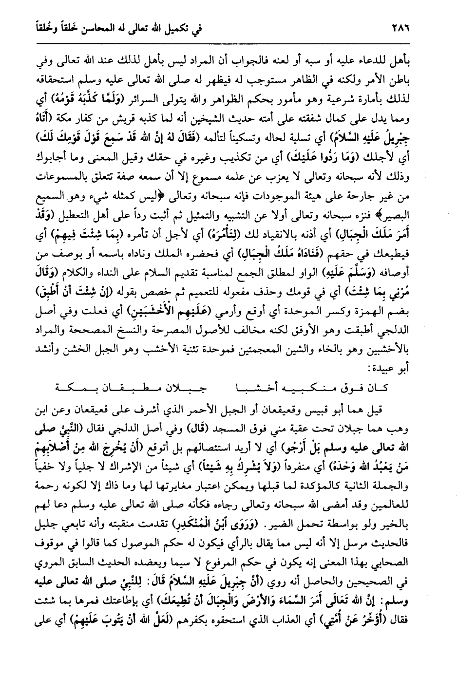 بأهل للدعاء عليه أو سبه أو لعنه فالجواب أن المراد ليس بأهل لذلك عند الله تعالى وفي باطن الأمر ولكنه في الظاهر مستوجب له فيظهر له صلى الله تعالى عليه وسلم استحقاقه لذلك بأمارة شرعية وهو مأمور بحكم الظواهر والله يتولى السرائر (ولمّا كذّبه قومه) أي ومما يدل على كمال شفقته على أمته حديث الشيخين أنه لما كذبه قريش من كفار مكة (أتاه جبريل عليه السّلام) أي تسلية لحاله وتسكينا لتألمه (فقال له إنّ الله قد سمع قول قومك لك) أي لأجلك (وما ردّوا عليك) أي من تكذيب وغيره في حقك وقيل المعنى وما أجابوك وذلك لأنه سبحانه وتعالى لا يعزب عن علمه مسموع إلا أن سمعه صفة تتعلق بالمسموعات من غير جارحة على هيئة الموجودات فإنه سبحانه وتعالى لَيْسَ كَمِثْلِهِ شَيْءٌ وَهُوَ السَّمِيعُ الْبَصِيرُ فنزه سبحانه وتعالى أولا عن التشبيه والتمثيل ثم أثبت ردا على أهل التعطيل (وقد أمر ملك الجبال) أي أذنه بالانقياد لك (لتأمره) أي لأجل أن تأمره (بما شئت فيهم) أي فيطيعك في حقهم (فناداه ملك الجبال) أي فحضره الملك وناداه باسمه أو بوصف من أوصافه (وسلّم عليه) الواو لمطلق الجمع لمناسبة تقديم السلام على النداء والكلام (وقال مرني بما شئت) أي في قومك وحذف مفعوله للتعميم ثم خصص بقوله (إن شئت أن أطبق) بضم الهمزة وكسر الموحدة أي أوقع وأرمي (عليهم الأخشبين) أي فعلت وفي أصل الدلجي أطبقت وهو الأوفق لكنه مخالف للأصول المصرحة والنسخ المصححة والمراد بالأخشبين وهو بالخاء والشين المعجمتين فموحدة تثنية الأخشب وهو الجبل الخشن وأنشد أبو عبيدة: