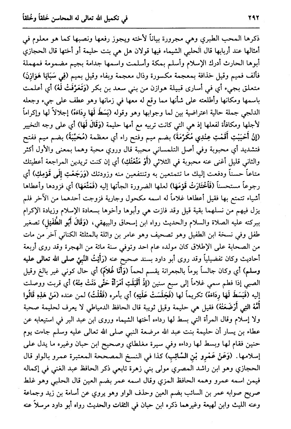 ذكرها المحب الطبري وهي مجرورة بيانا لأخته ويجوز رفعها ونصبها كما هو معلوم في أمثالها عند أربابها قال الحلبي الشيماء فيها قولان هل هي بنت حليمة أو أختها قال الحجازي أبوها الحارث أدرك الإسلام وأسلم بمكة وأسلمت واسمها جدامة بجيم مضمومة فمهملة فألف فميم وقيل خذافة بمعجمة مكسورة وذال معجمة وبفاء وقيل بميم (في سبايا هوازن) متعلق بجيء أي في أسارى قبيلة هوازن من بني سعد بن بكر (وتعرّفت له) أي أعلمت باسمها ومكانها وأطلعته على شأنها مما وقع له معها في زمانها وهو عطف على جيء وجعله الدلجي جملة حالية اعتراضية بين لما وجوابها وهو وقوله (بسط لها رداءه) إجلالا لها وإكراما لأجلها ومكافأة لفعلها إذ هي التي كانت تربيه مع أمها حليمة (وقال لها) أي على وجه التخيير (إن أحببت أقمت عندي مكرّمة) بضم ميم وفتح راء أي معظمة (محبّبة) بضم ميم ففتح فتشديد أي محبوبة وفي أصل التلمساني محببة قال وروي محبة وهما بمعنى والأول أكثر والثاني قليل أغنى عنه محبوبة في الثلاثي (أو متّعتك) أي إن كنت تريدين المراجعة أعطيتك متاعا حسنا ودفعت إليك ما تتمتعين به وتنتفعين منه وزودتك (ورجعت إلى قومك) أي رجوعا مستحسنا (فاختارت قومها) لعلها الضرورة الجأتها إليه (فمتّعها) أي فزودها وأعطاها أشياء تتمتع بها فقيل أعطاها غلاما له اسمه مكحول وجارية فزوجت أحدهما من الآخر فلم يزل فيهم من نسلهما بقية قيل وقد فازت هي وأبوها وأخوها بسعادة الإسلام وزيادة الإكرام ببركته عليه الصلاة والسلام والحديث رواه ابن إسحاق والبيهقي، (وقال أبو الطّفيل) تصغير طفل وفي نسخة ابن الطفيل وهو تصحيف وهو عامر بن واثلة بالمثلثة الكناني آخر من مات من الصحابة على الإطلاق كان مولده عام احد وتوفي سنة مائة من الهجرة وقد روى أربعة أحاديث وكان تفضيليا وقد روى أبو داود بسند صحيح عنه (رأيت النّبيّ صلى الله تعالى عليه وسلم) أي وكان جالسا يوما بالجعرانة يقسم لحما (وأنا غلام) أي حال كوني غير بالغ وقيل الصبي إذا فطم سمي غلاما إلى سبع سنين (إذ أقبلت امرأة حتّى دنت منه) أي قربت ووصلت إليه (فبسط لها رداءه) تكريما لها (فجلست عليه) أي بأمره (فقلت) لمن عنده (من هذه قالوا أمّة التي أرضعته) فقيل هي حليمة وقيل ثوبية قال الحافظ الدمياطي لا يعرف لحليمة صحبة ولا إسلام وقال المرأة التي بسط لها رداءه أختها الشيماء وروى ابن عبد البر في استيعابه عن عطاء بن يسار أن حليمة بنت عبد الله مرضعة النبي صلى الله تعالى عليه وسلم جاءت يوم حنين فقام لها وبسط لها رداءه وفي سيرة مغلطاي وصحيح ابن حبان وغيره ما يدل على إسلامها. (وعن عمرو بن السّائب) كذا في النسخ المصححة المعتبرة عمرو بالواو قال الحجازي وهو ابن راشد المصري مولى بني زهرة تابعي ذكر الحافظ عبد الغني في إكماله فيمن اسمه عمرو وهمه الحافظ المزي وقال اسمه عمر بضم العين قال الحلبي وهو غلط صريح صوابه عمر بن السائب بضم العين وحذف الواو وهو يروي عن أسامة بن زيد وجماعة وعنه الليث وابن لهيعة وغيرهما ذكره ابن حبان في الثقات والحديث رواه أبو داود مرسلا عنه