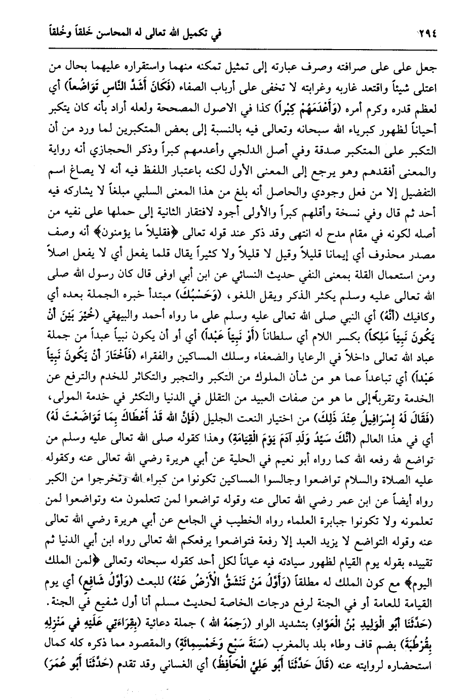 جعل على على صرافته وصرف عبارته إلى تمثيل تمكنه منهما واستقراره عليهما بحال من اعتلى شيئا واقتعد غاربه وغرابته لا تخفى على أرباب الصفاء (فكان أشدّ النّاس تواضعا) أي لعظم قدره وكرم أمره (وأعدمهم كبرا) كذا في الاصول المصححة ولعله أراد بأنه كان يتكبر أحيانا لظهور كبرياء الله سبحانه وتعالى فيه بالنسبة إلى بعض المتكبرين لما ورد من أن التكبر على المتكبر صدقة وفي أصل الدلجي وأعدمهم كبرا وذكر الحجازي أنه رواية والمعنى أفقدهم وهو يرجع إلى المعنى الأول لكنه باعتبار اللفظ فيه أنه لا يصاغ اسم التفضيل إلا من فعل وجودي والحاصل أنه بلغ من هذا المعنى السلبي مبلغا لا يشاركه فيه أحد ثم قال وفي نسخة وأقلهم كبرا والأولى أجود لافتقار الثانية إلى حملها على نفيه من أصله لكونه في مقام مدح له انتهى وقد ذكر عند قوله تعالى فَقَلِيلًا ما يُؤْمِنُونَ أنه وصف مصدر محذوف أي إيمانا قليلا وقيل لا قليلا ولا كثيرا يقال قلما يفعل أي لا يفعل اصلا ومن استعمال القلة بمعنى النفي حديث النسائي عن ابن أبي اوفى قال كان رسول الله صلى الله تعالى عليه وسلم يكثر الذكر ويقل اللغو، (وحسبك) مبتدأ خبره الجملة بعده أي وكافيك (أنّه) أي النبي صلى الله تعالى عليه وسلم على ما رواه أحمد والبيهقي (خيّر بين أن يكون نبيّا ملكا) بكسر اللام أي سلطانا (أو نبيّا عبدا) أي أو أن يكون نبيا عبدا من جملة عباد الله تعالى داخلا في الرعايا والضعفاء وسلك المساكين والفقراء (فاختار أن يكون نبيّا عبدا) أي تباعدا عما هو من شأن الملوك من التكبر والتجبر والتكاثر للخدم والترفع عن الخدمة وتقربا إلى ما هو من صفات العبيد من التقلل في الدنيا والتكثر في خدمة المولى، (فقال له إسرافيل عند ذلك) من اختيار النعت الجليل (فَإِنَّ اللَّهَ قَدْ أَعْطَاكَ بِمَا تَوَاضَعْتَ لَهُ) أي في هذا العالم (أنّك سيّد ولد آدم يوم القيامة) وهذا كقوله صلى الله تعالى عليه وسلم من تواضع لله رفعه الله كما رواه أبو نعيم في الحلية عن أبي هريرة رضي الله تعالى عنه وكقوله عليه الصلاة والسلام تواضعوا وجالسوا المساكين تكونوا من كبراء الله وتخرجوا من الكبر رواه أيضا عن ابن عمر رضي الله تعالى عنه وقوله تواضعوا لمن تتعلمون منه وتواضعوا لمن تعلمونه ولا تكونوا جبابرة العلماء رواه الخطيب في الجامع عن أبي هريرة رضي الله تعالى عنه وقوله التواضع لا يزيد العبد إلا رفعة فتواضعوا يرفعكم الله تعالى رواه ابن أبي الدنيا ثم تقييده بقوله يوم القيام لظهور سيادته فيه عيانا لكل أحد كقوله سبحانه وتعالى لِمَنِ الْمُلْكُ الْيَوْمَ مع كون الملك له مطلقا (وأوّل من تنشقّ الأرض عنه) للبعث (وأوّل شافع) أي يوم القيامة للعامة أو في الجنة لرفع درجات الخاصة لحديث مسلم أنا أول شفيع في الجنة.