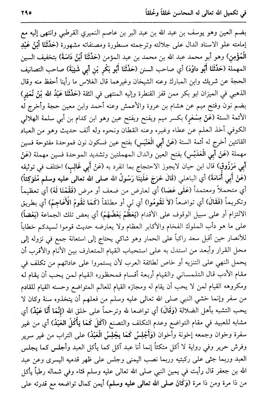 بضم العين وهو يوسف بن عبد الله بن عبد البر بن عاصم النميري القرطبي وانتهى إليه مع إمامته علو الاسناد الدال على جلالته وترجمته مسطورة ومصنفاته مشهورة (حدّثنا ابن عبد المؤمن) وهو أبو محمد عبد الله بن محمد بن عبد المؤمن (حدّثنا ابن داسة) بتخفيف السين المهملة (حدّثنا أبو داود) أي صاحب السنن (حدّثنا أبو بكر بن أبي شيبة) صاحب التصانيف الحجة عن شريك وابن المبارك وعنه الشيخان وغيرهما قال الغلاس ما رأينا أحفظ منه وقال الذهبي في الميزان ابو بكر ممن قفز القنطرة وإليه المنتهى في الثقة (حدّثنا عبد الله بن نمير) بضم نون وفتح ميم عن هشام بن عروة والأعمش وعنه أحمد وابن معين حجة وأخرج له الأئمة الستة (عن مسعر) بكسر ميم ويفتح وبفتح عين وهو ابن كدام بن أبي سلمة الهلالي الكوفي أخذ العلم عن عطاء وغيره وعنه القطان ونحوه وله ألف حديث وهو من العباد القانتين أخرج له أئمة الستة (عن أبي العنبس) بفتح عين فسكون نون فموحدة مفتوحة فسين مهملة (عن أبي العدبّس) بفتح العين والدال المهملتين وتشديد الموحدة فسين مهملة (عن أبي مرزوق) قال ابن حيان لا يجوز الاحتجاج بما انفرد به (عن أبي غالب) اختلف في توثيقه (عن أبي أمامة) أي الباهلي (قَالَ خَرَجَ عَلَيْنَا رَسُولُ اللَّهِ صَلَّى اللَّهُ تعالى عليه وسلم متوكئا) أي متحملا ومعتمدا (على عصا) أي لعارض من ضعف أو مرض (فقمنا له) أي تعظيما وتكريما (فقال) أي تواضعا (لا تقوموا) أي لي أو مطلقا (كما تقوم الأعاجم) أي بطريق الالتزام أو على سبيل الوقوف على الأقدام (يعظّم بعضهم) أي بعض تلك الجماعة (بعضا) على ما هو دأب الملوك الفخام والأكابر العظام ولا يعارضه حديث قوموا لسيدكم خطابا للأنصار حين أقبل سعد راكبا على الحمار وهو شاكي يحتاج إلى استعانة جمع في نزوله إلى محل القرار وأبعد من استدل به على استحباب القيام المتعارف بين الأنام والأقرب أن يحمل النهي على التنزيه أو خاص لطائفة العرب لأن يستمروا على عاداتهم من تكلف في مقام الأدب قال التلمساني والقيام أربعة أقسام فمحظوره القيام لمن يحب أن يقام له ومكروهه القيام لمن لا يحب أن يقام له ومجازه القيام للعالم المتواضع وحسنه القيام للقادم من سفر وإنما خشي النبي صلى الله تعالى عليه وسلم من فعلهم أن يتخذوه سنة وكان لا يحب التشبه بأهل الضلالة (وقال) أي تواضعا لله وترحما على خلق الله (إنّما أنا عبد) أي مشابه للعبيد في مقام التواضع وعدم التكلف والتصنع (آكل كما يأكل العبد) أي من غير سفرة وخوان وجمعه إخونة وأخوان (وأجلس كما يجلس العبد) على التراب من غير سرير وفرش حرير وفي رواية لا آكل متكئا إِنَّمَا أَنَا عَبْدٌ آكُلُ كَمَا يَأْكُلُ الْعَبْدُ وأجلس كما يجلس العبد وربما جثى على ركبتيه وربما نصب اليمنى وجلس على ظهر قدميه اليسرى وعن عبد الله بن جعفر قال رأيت في يمين النبي صلى الله تعالى عليه وسلم قثاء وفي شماله رطبا يأكل من ذا مرة ومن ذا مرة (وكان صلى الله تعالى عليه وسلم) أيمن كمال تواضعه مع قدرته على