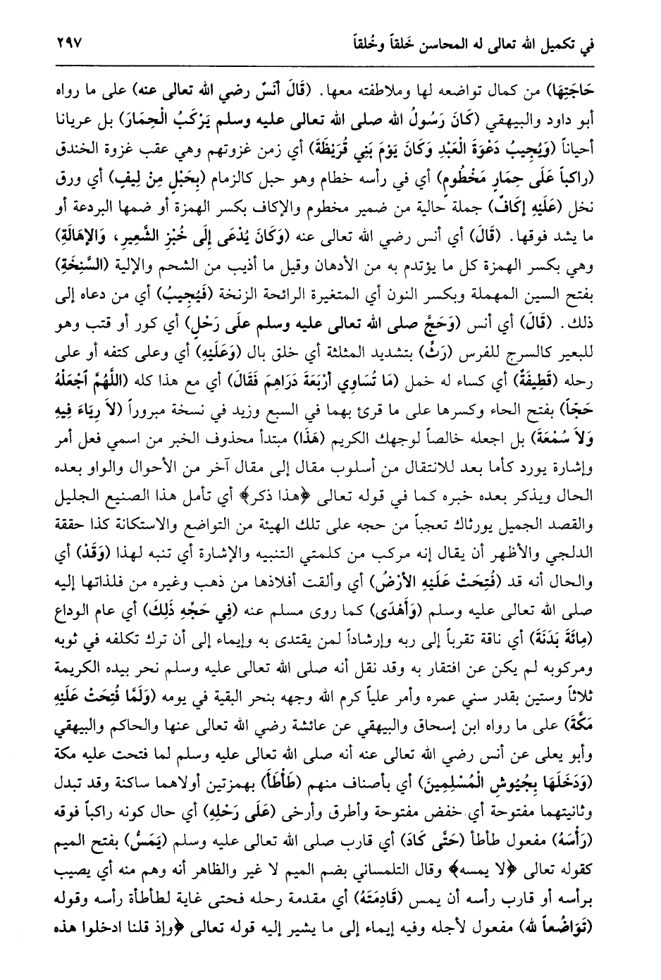حاجتها) من كمال تواضعه لها وملاطفته معها. (قال أنس رضي الله تعالى عنه) على ما رواه أبو داود والبيهقي (كان رسول الله صلى الله تعالى عليه وسلم يركب الحمار) بل عريانا أحيانا (وَيُجِيبُ دَعْوَةَ الْعَبْدِ وَكَانَ يَوْمَ بَنِي قُرَيْظَةَ) أي زمن غزوتهم وهي عقب غزوة الخندق (راكبا على حمار مخطوم) أي في رأسه خطام وهو حبل كالزمام (بحبل من ليف) أي ورق نخل (عليه إكاف) جملة حالية من ضمير مخطوم والإكاف بكسر الهمزة أو ضمها البردعة أو ما يشد فوقها. (قال) أي أنس رضي الله تعالى عنه (وكان يدعى إلى خبز الشّعير، والإهالة) وهي بكسر الهمزة كل ما يؤتدم به من الأدهان وقيل ما أذيب من الشحم والإلية (السّنخة) بفتح السين المهملة وبكسر النون أي المتغيرة الرائحة الزنخة (فيجيب) أي من دعاه إلى ذلك. (قال) أي أنس (وحجّ صلى الله تعالى عليه وسلم على رحل) أي كور أو قتب وهو للبعير كالسرج للفرس (رثّ) بتشديد المثلثة أي خلق بال (وعليه) أي وعلى كتفه أو على رحله (قطيفة) أي كساء له خمل (ما تساوي أربعة دراهم فقال) أي مع هذا كله (اللهمّ اجعله حجّا) بفتح الحاء وكسرها على ما قرئ بهما في السبع وزيد في نسخة مبرورا (لا رياء فيه ولا سمعة) بل اجعله خالصا لوجهك الكريم (هذا) مبتدأ محذوف الخبر من اسمي فعل أمر وإشارة يورد كأما بعد للانتقال من أسلوب مقال إلى مقال آخر من الأحوال والواو بعده الحال ويذكر بعده خبره كما في قوله تعالى هذا ذِكْرُ أي تأمل هذا الصنيع الجليل والقصد الجميل يورثاك تعجبا من حجه على تلك الهيئة من التواضع والاستكانة كذا حققة الدلجي والأظهر أن يقال إنه مركب من كلمتي التنبيه والإشارة أي تنبه لهذا (وقد) أي والحال أنه قد (فتحت عليه الأرض) أي وألقت أفلاذها من ذهب وغيره من فلذاتها إليه صلى الله تعالى عليه وسلم (وأهدى) كما روى مسلم عنه (في حجّه ذلك) أي عام الوداع (مائة بدنة) أي ناقة تقربا إلى ربه وإرشادا لمن يقتدى به وإيماء إلى أن ترك تكلفه في ثوبه ومركوبه لم يكن عن افتقار به وقد نقل أنه صلى الله تعالى عليه وسلم نحر بيده الكريمة ثلاثا وستين بقدر سني عمره وأمر عليا كرم الله وجهه بنحر البقية في يومه (ولمّا فتحت عليه مكّة) على ما رواه ابن إسحاق والبيهقي عن عائشة رضي الله تعالى عنها والحاكم والبيهقي وأبو يعلى عن أنس رضي الله تعالى عنه أنه صلى الله تعالى عليه وسلم لما فتحت عليه مكة (ودخلها بجيوش المسلمين) أي بأصناف منهم (طأطأ) بهمزتين أولاهما ساكنة وقد تبدل وثانيتهما مفتوحة أي خفض مفتوحة وأطرق وأرخى (على رحله) أي حال كونه راكبا فوقه (رأسه) مفعول طأطأ (حتّى كاد) أي قارب صلى الله تعالى عليه وسلم (يمسّ) بفتح الميم كقوله تعالى لا يَمَسُّهُ وقال التلمساني بضم الميم لا غير والظاهر أنه وهم منه أي يصيب برأسه أو قارب رأسه أن يمس (قادمته) أي مقدمة رحله فحتى غاية لطأطأة رأسه وقوله (تواضعا لله) مفعول لأجله وفيه إيماء إلى ما يشير إليه قوله تعالى وَإِذْ قُلْنَا ادْخُلُوا هذِهِ