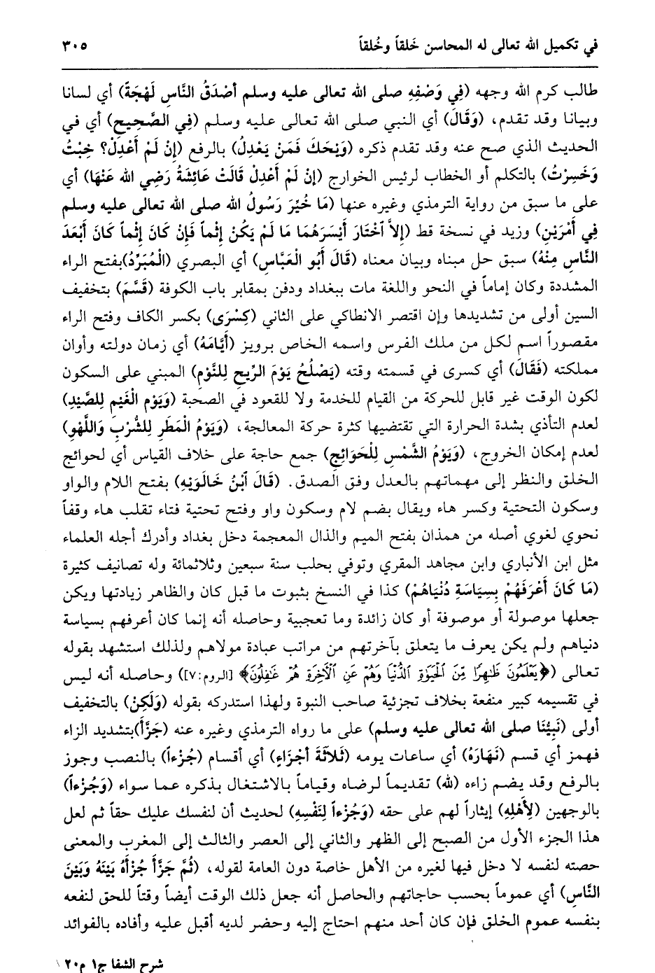 طالب كرم الله وجهه (في وصفه صلى الله تعالى عليه وسلم أصدق النّاس لهجة) أي لسانا وبيانا وقد تقدم، (وقال) أي النبي صلى الله تعالى عليه وسلم (في الصّحيح) أي في الحديث الذي صح عنه وقد تقدم ذكره (ويحك فمن يعدل) بالرفع (إن لم أعدل؟ خبت وخسرت) بالتكلم أو الخطاب لرئيس الخوارج (إِنْ لَمْ أَعْدِلْ قَالَتْ عَائِشَةُ رَضِيَ اللَّهُ عنها) أي على ما سبق من رواية الترمذي وغيره عَنْهَا (مَا خُيِّرَ رَسُولُ اللَّهِ صَلَّى اللَّهُ تعالى عليه وسلم في أمرين) وزيد في نسخة قَطُّ (إِلَّا اخْتَارَ أَيْسَرَهُمَا مَا لَمْ يَكُنْ إِثْمًا فَإِنْ كَانَ إِثْمًا كَانَ أَبْعَدَ النَّاسِ منه) سبق حل مبناه وبيان معناه (قال أبو العبّاس) أي البصري (المبرّد) بفتح الراء المشددة وكان إماما في النحو واللغة مات ببغداد ودفن بمقابر باب الكوفة (قسّم) بتخفيف السين أولى من تشديدها وإن اقتصر الانطاكي على الثاني (كسرى) بكسر الكاف وفتح الراء مقصورا اسم لكل من ملك الفرس واسمه الخاص برويز (أيّامه) أي زمان دولته وأوان مملكته (فقال) أي كسرى في قسمته وقته (يصلح يوم الرّيح للنّوم) المبني على السكون لكون الوقت غير قابل للحركة من القيام للخدمة ولا للقعود في الصحبة (ويوم الغيم للصّيد) لعدم التأذي بشدة الحرارة التي تقتضيها كثرة حركة المعالجة، (ويوم المطر للشّرب واللهو) لعدم إمكان الخروج، (ويوم الشّمس للحوائج) جمع حاجة على خلاف القياس أي لحوائج الخلق والنظر إلى مهماتهم بالعدل وفق الصدق. (قال ابن خالويه) بفتح اللام والواو وسكون التحتية وكسر هاء ويقال بضم لام وسكون واو وفتح تحتية فتاء تقلب هاء وقفا نحوي لغوي أصله من همذان بفتح الميم والذال المعجمة دخل بغداد وأدرك أجله العلماء مثل ابن الأنباري وابن مجاهد المقري وتوفي بحلب سنة سبعين وثلاثمائة وله تصانيف كثيرة (ما كان أعرفهم بسياسة دنياهم) كذا في النسخ بثبوت ما قبل كان والظاهر زيادتها ويكن جعلها موصولة أو موصوفة أو كان زائدة وما تعجبية وحاصله أنه إنما كان أعرفهم بسياسة دنياهم ولم يكن يعرف ما يتعلق بآخرتهم من مراتب عبادة مولاهم ولذلك استشهد بقوله تعالى (يَعْلَمُونَ ظاهِراً مِنَ الْحَياةِ الدُّنْيا وَهُمْ عَنِ الْآخِرَةِ هُمْ غافِلُونَ [الروم: 7] ) وحاصله أنه ليس في تقسيمه كبير منفعة بخلاف تجزئية صاحب النبوة ولهذا استدركه بقوله (ولكن) بالتخفيف أولى (نبيّنا صلى الله تعالى عليه وسلم) على ما رواه الترمذي وغيره عنه (جزّأ) بتشديد الزاء فهمز أي قسم (نهاره) أي ساعات يومه (ثلاثة أجزاء) أي أقسام (جزءا) بالنصب وجوز بالرفع وقد يضم زاءه (لله) تقديما لرضاه وقياما بالاشتغال بذكره عما سواء (وجزءا) بالوجهين (لأهله) إيثارا لهم على حقه (وجزءا لنفسه) لحديث أن لنفسك عليك حقا ثم لعل هذا الجزء الأول من الصبح إلى الظهر والثاني إلى العصر والثالث إلى المغرب والمعنى حصته لنفسه لا دخل فيها لغيره من الأهل خاصة دون العامة لقوله، (ثمّ جزّأ جزأه بينه وبين النّاس) أي عموما بحسب حاجاتهم والحاصل أنه جعل ذلك الوقت أيضا وقتا للحق لنفعه بنفسه عموم الخلق فإن كان أحد منهم احتاج إليه وحضر لديه أقبل عليه وأفاده بالفوائد