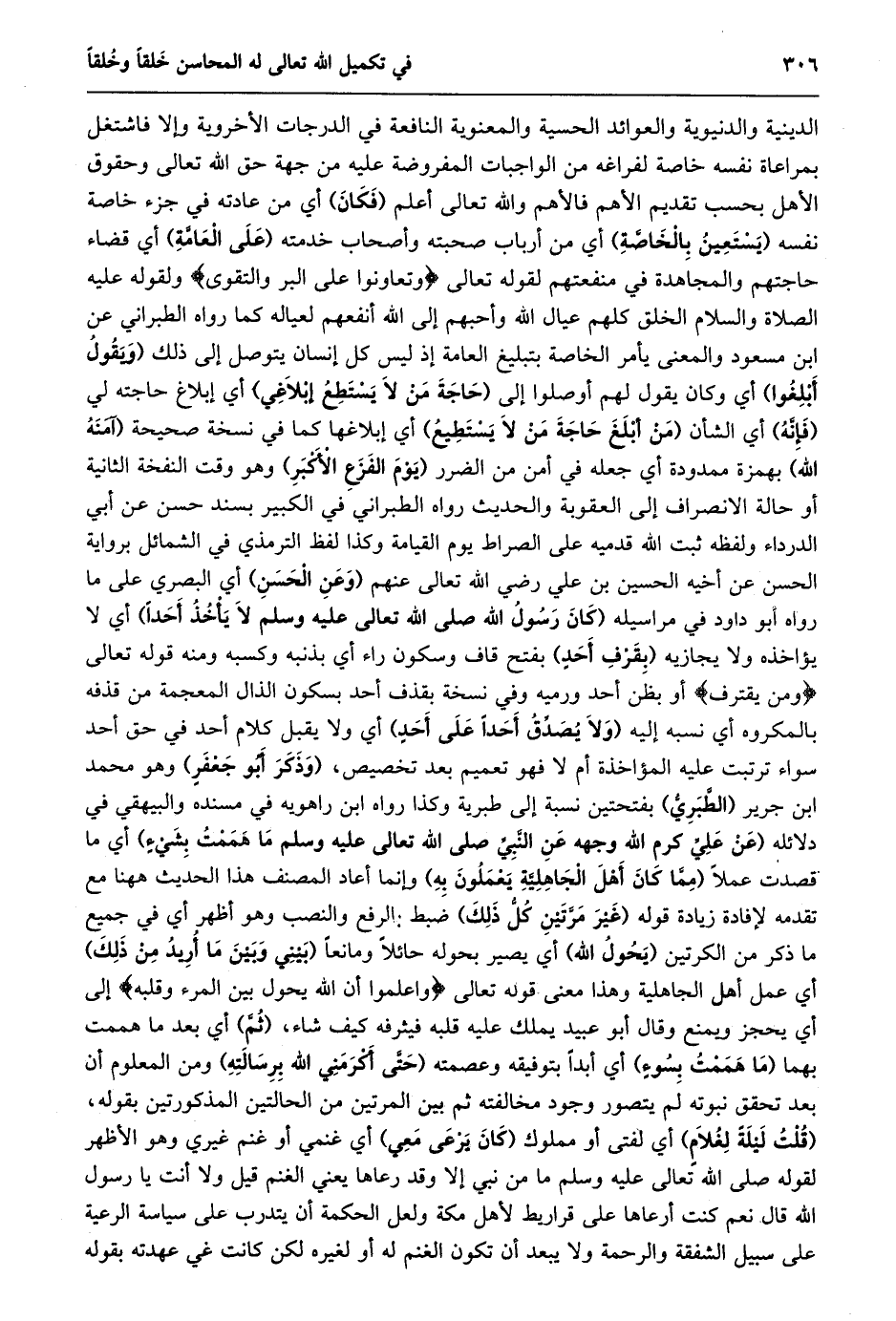 الدينية والدنيوية والعوائد الحسية والمعنوية النافعة في الدرجات الأخروية وإلا فاشتغل بمراعاة نفسه خاصة لفراغه من الواجبات المفروضة عليه من جهة حق الله تعالى وحقوق الأهل بحسب تقديم الأهم فالأهم والله تعالى أعلم (فكان) أي من عادته في جزء خاصة نفسه (يستعين بالخاصّة) أي من أرباب صحبته وأصحاب خدمته (على العامّة) أي قضاء حاجتهم والمجاهدة في منفعتهم لقوله تعالى وَتَعاوَنُوا عَلَى الْبِرِّ وَالتَّقْوى ولقوله عليه الصلاة والسلام الخلق كلهم عيال الله وأحبهم إلى الله أنفعهم لعياله كما رواه الطبراني عن ابن مسعود والمعنى يأمر الخاصة بتبليغ العامة إذ ليس كل إنسان يتوصل إلى ذلك (ويقول أبلغوا) أي وكان يقول لهم أوصلوا إلى (حاجة من لا يستطع إبلاغي) أي إبلاغ حاجته لي (فإنّه) أي الشأن (من أبلغ حاجة من لا يستطيع) أي إبلاغها كما في نسخة صحيحة (آمنه الله) بهمزة ممدودة أي جعله في أمن من الضرر (يوم الفزع الأكبر) وهو وقت النفخة الثانية أو حالة الانصراف إلى العقوبة والحديث رواه الطبراني في الكبير بسند حسن عن أبي الدرداء ولفظه ثبت الله قدميه على الصراط يوم القيامة وكذا لفظ الترمذي في الشمائل برواية الحسن عن أخيه الحسين بن علي رضي الله تعالى عنهم (وعن الحسن) أي البصري على ما رواه أبو داود في مراسيله (كان رسول الله صلى الله تعالى عليه وسلم لا يأخذ أحدا) أي لا يؤاخذه ولا يجازيه (بقرف أحد) بفتح قاف وسكون راء أي بذنبه وكسبه ومنه قوله تعالى وَمَنْ يَقْتَرِفْ أو بظن أحد ورميه وفي نسخة بقذف أحد بسكون الذال المعجمة من قذفه بالمكروه أي نسبه إليه (ولا يصدّق أحدا على أحد) أي ولا يقبل كلام أحد في حق أحد سواء ترتبت عليه المؤاخذة أم لا فهو تعميم بعد تخصيص، (وذكر أبو جعفر) وهو محمد ابن جرير (الطّبريّ) بفتحتين نسبة إلى طبرية وكذا رواه ابن راهويه في مسنده والبيهقي في دلائله (عن عليّ كرم الله وجهه عن النّبيّ صلى الله تعالى عليه وسلم ما هممت بشيء) أي ما قصدت عملا (ممّا كان أهل الجاهليّة يعملون به) وإنما أعاد المصنف هذا الحديث ههنا مع تقدمه لإفادة زيادة قوله (غير مرّتين كلّ ذلك) ضبط الرفع والنصب وهو أظهر أي في جميع ما ذكر من الكرتين (يحول الله) أي يصير بحوله حائلا ومانعا (بيني وبين ما أريد من ذلك) أي عمل أهل الجاهلية وهذا معنى قوله تعالى وَاعْلَمُوا أَنَّ اللَّهَ يَحُولُ بَيْنَ الْمَرْءِ وَقَلْبِهِ إلى أي يحجز ويمنع وقال أبو عبيد يملك عليه قلبه فيثرفه كيف شاء، (ثمّ) أي بعد ما هممت بهما (ما هممت بسوء) أي أبدا بتوفيقه وعصمته (حتّى أكرمني الله برسالته) ومن المعلوم أن بعد تحقق نبوته لم يتصور وجود مخالفته ثم بين المرتين من الحالتين المذكورتين بقوله، (قلت ليلة لغلام) أي لفتى أو مملوك (كان يرعى معي) أي غنمي أو غنم غيري وهو الأظهر لقوله صلى الله تعالى عليه وسلم ما من نبي إلا وقد رعاها يعني الغنم قيل ولا أنت يا رسول الله قال نعم كنت أرعاها على قراريط لأهل مكة ولعل الحكمة أن يتدرب على سياسة الرعية على سبيل الشفقة والرحمة ولا يبعد أن تكون الغنم له أو لغيره لكن كانت غي عهدته بقوله